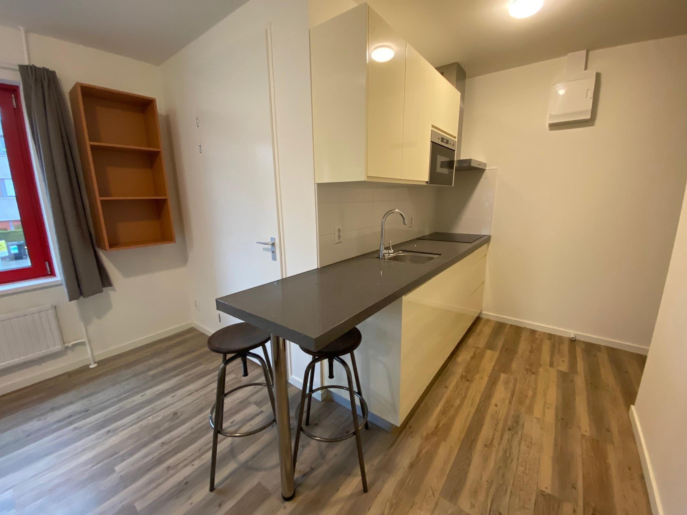 De studio is uitgerust met een moderne keuken voorzien van een inbouw koelkast met vriesvak, een 4-pit inductiekookplaat, een RVS-afzuigkap, magnetron, wastafel met mengkraan en voldoende opbergruimte.