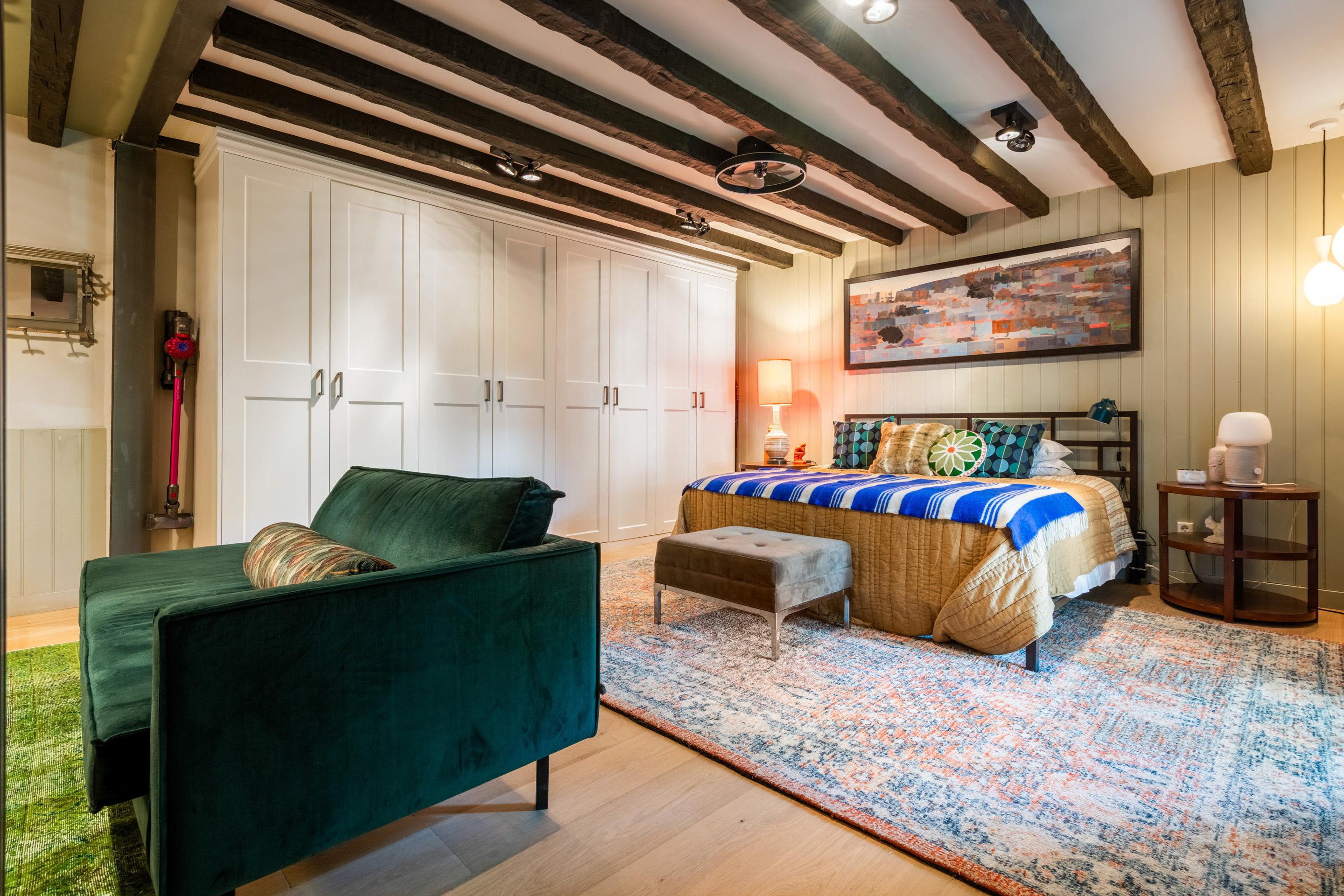 The extra large bedroom includes a luxurious American king-sized bed and very spacious en suite master bath. Authentic, solid oak floors run throughout, framed by swanky furnishings and original artwork. The bedroom includes a separate sitting area which could serve as a home office or cozy chill-out space. A patio adjoins the master bathroom providing sunlight and fresh air. Centrally located between the Keizersgracht and Prinsengracht, the apartment merges Amsterdam’s iconic historic ambiance with style and convenience.