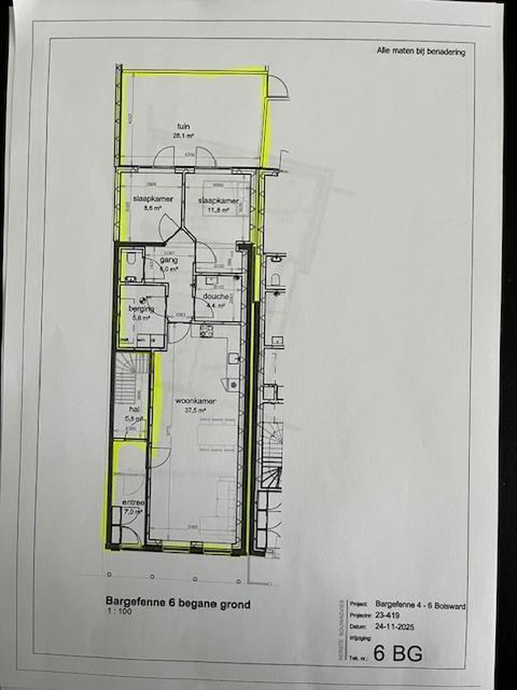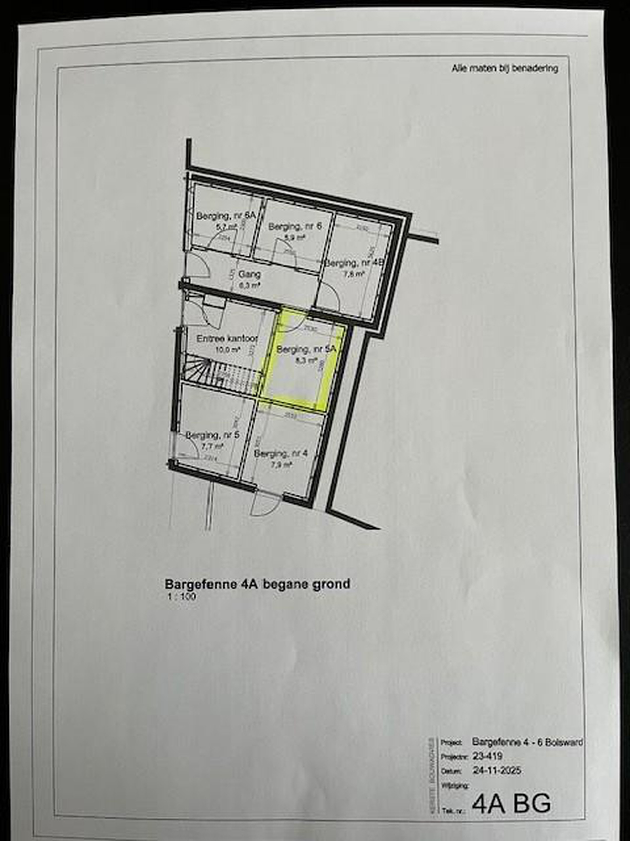 -2 woonappartementen met bergingen ( Bargefenne nr. 5 en 5 A) in binnenstad van Bolsward ( oplevering eind januari 2026 ) en 1 kantoorappartement ( nr. 4 A ) -- entree/voorportaal kantoor met trapopgang ca. 10 m2, overloop/gang ca. 4 m2, 3x kantoorruimtes 23, 15 en 8 m2, toilet ca. 1,5 m2 en technische ruimte ca. 3 m2 ( oplevering medio maart 2026 ).
