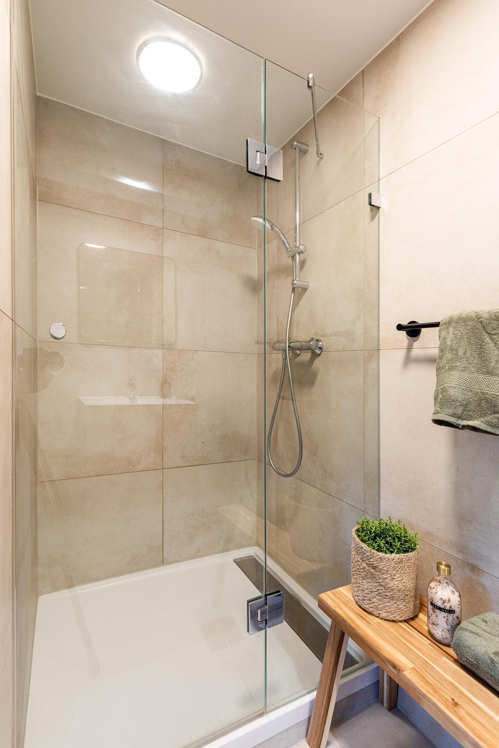 The bathroom has shower and washbasin and toilet. At the basement of the apartment is the bedroom with a double bed and a wardrobe.