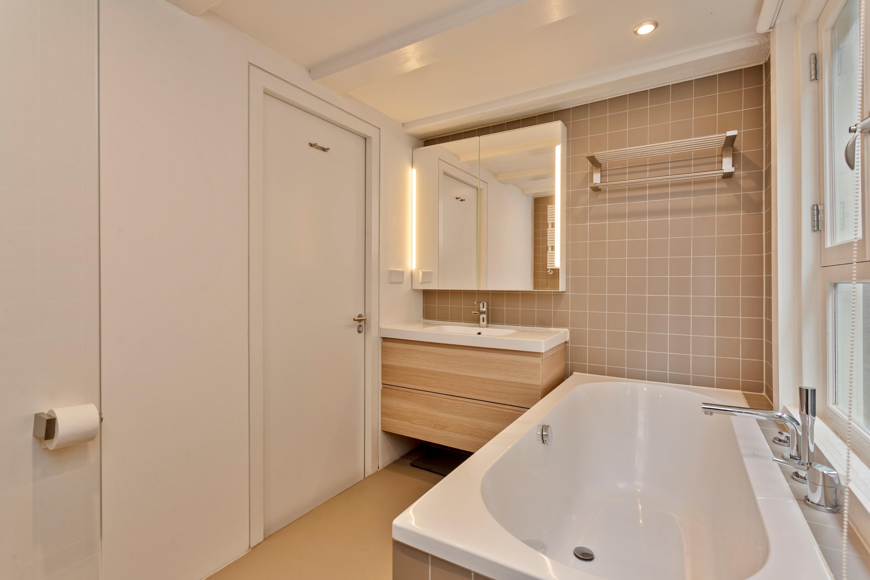 One flight up from the living room you find 2 good sized bedrooms that both fit a double bed. Both bedrooms have a wardrobe. On the same floor you find the bathroom with a nice bathtub, a separate shower, a toilet and a sink.