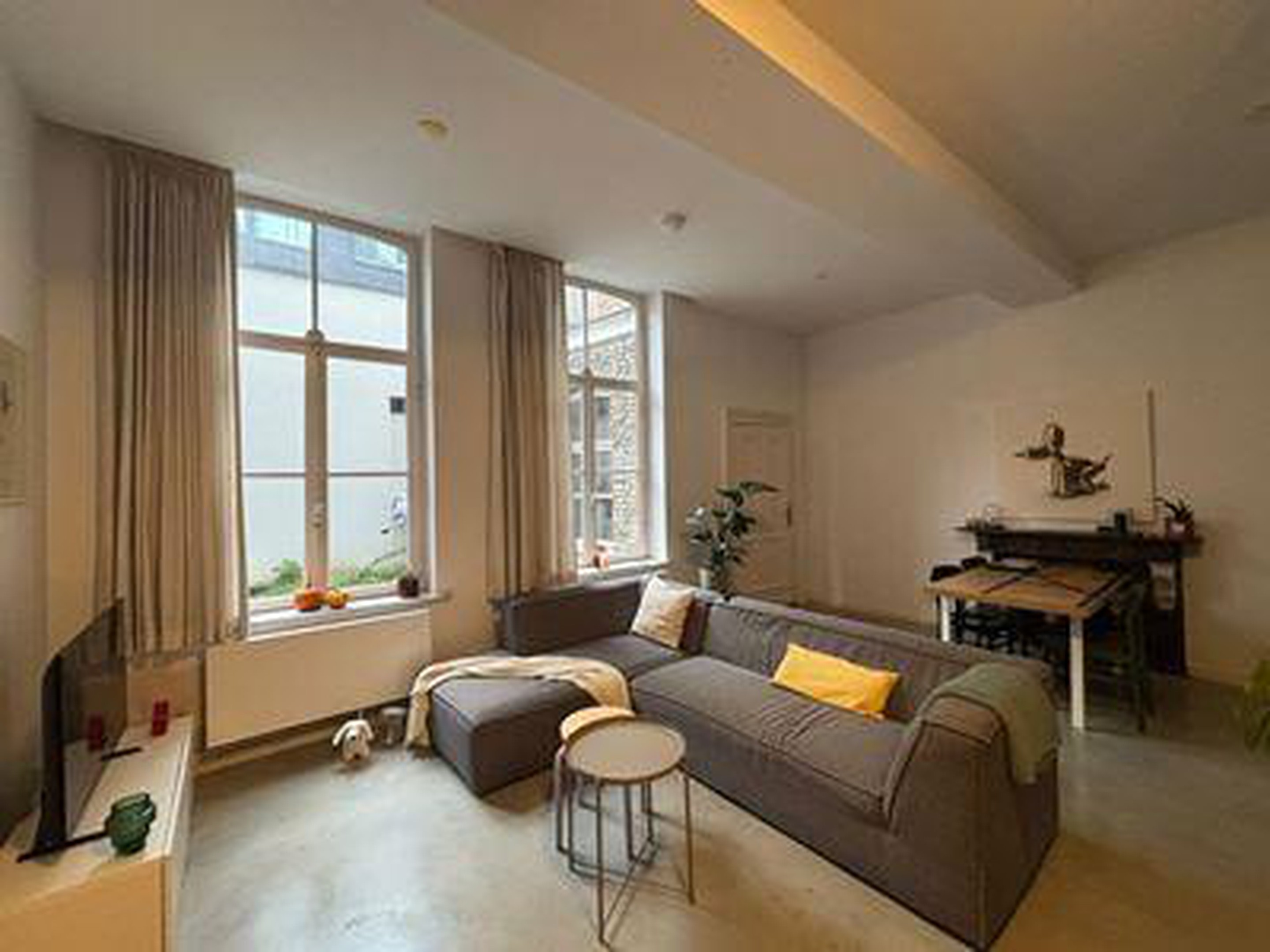Bij binnenkomst in het appartement betreed je de royale en sfeervolle woonkamer, die direct opvalt door de authentieke details en het ruimtelijke karakter. De hoge plafonds, natuurstenen vloer, karakteristieke schouw en de grote raampartijen aan de voorzijde zorgen voor een lichte en aangename leefruimte. De ramen zijn bovendien voorzien van elektrische rolluiken voor extra comfort en privacy. Via grote openslaande deuren staat de woonkamer in verbinding met het slaapgedeelte en is er een directe doorgang naar de keuken.