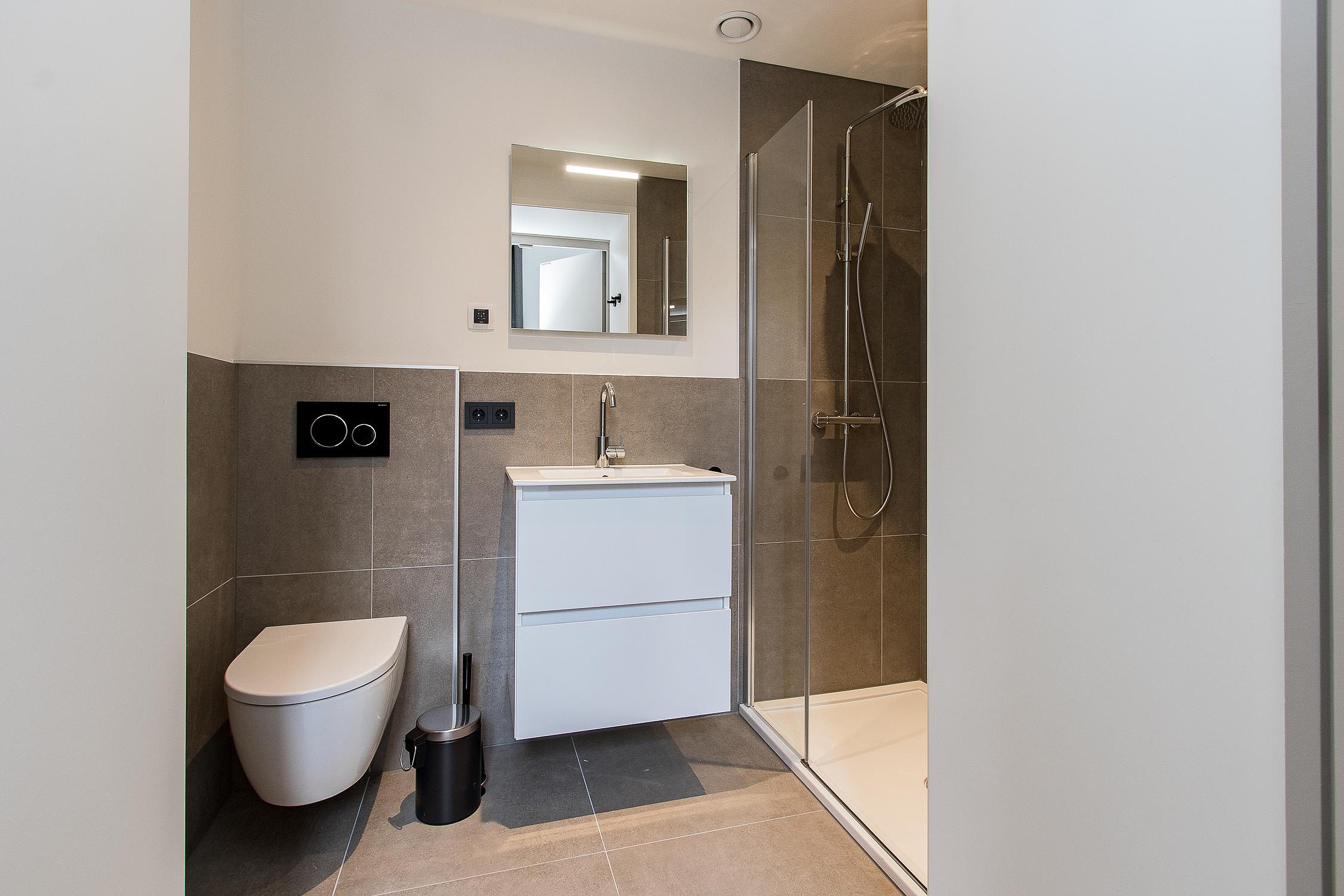 Luxury Bathroom; walk in shower, toilet and a washer