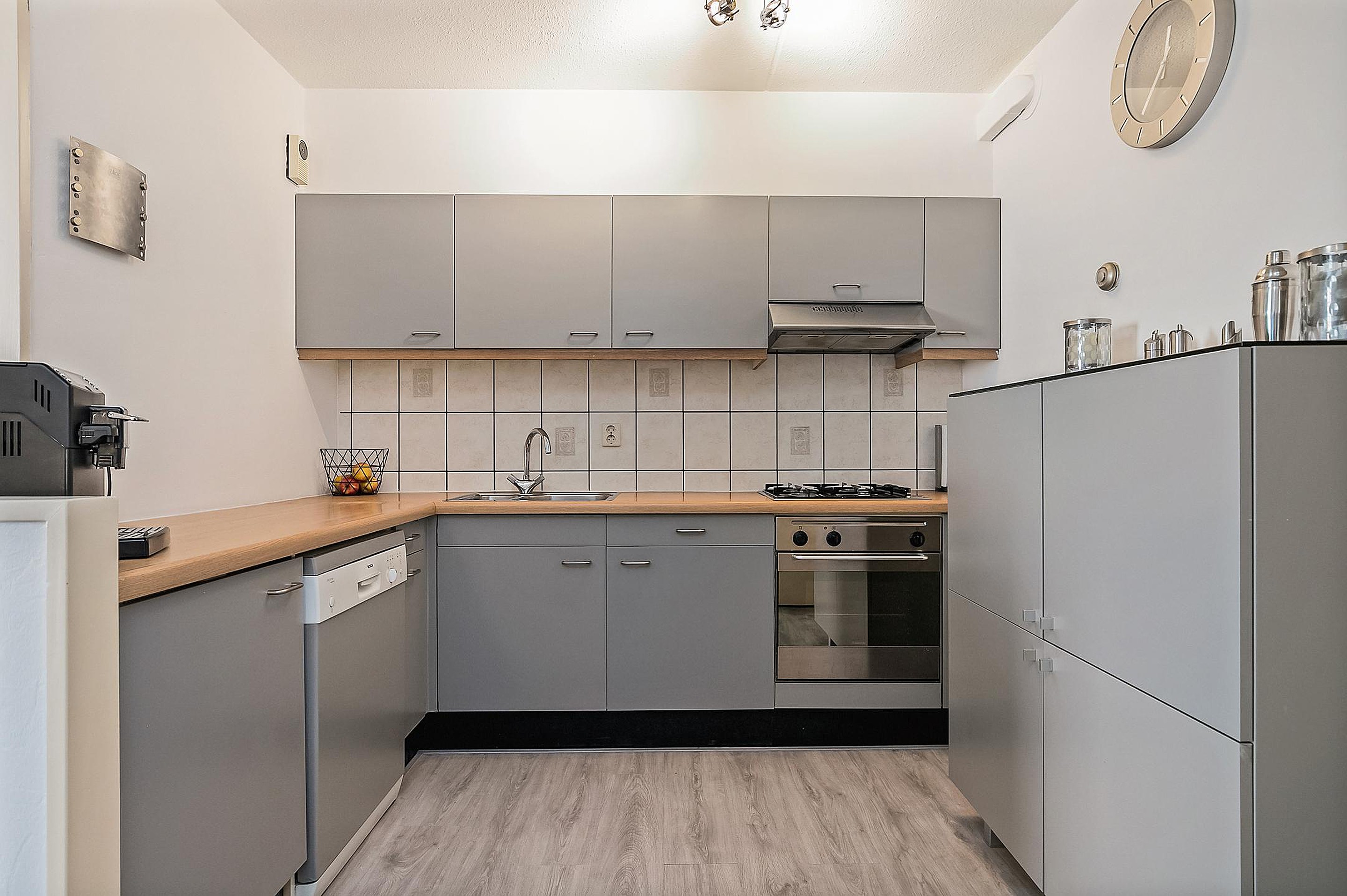 De keuken is voorzien van de volgende apparatuur ; gaskookplaat, oven, afzuiging, vaatwasser, koelkast.