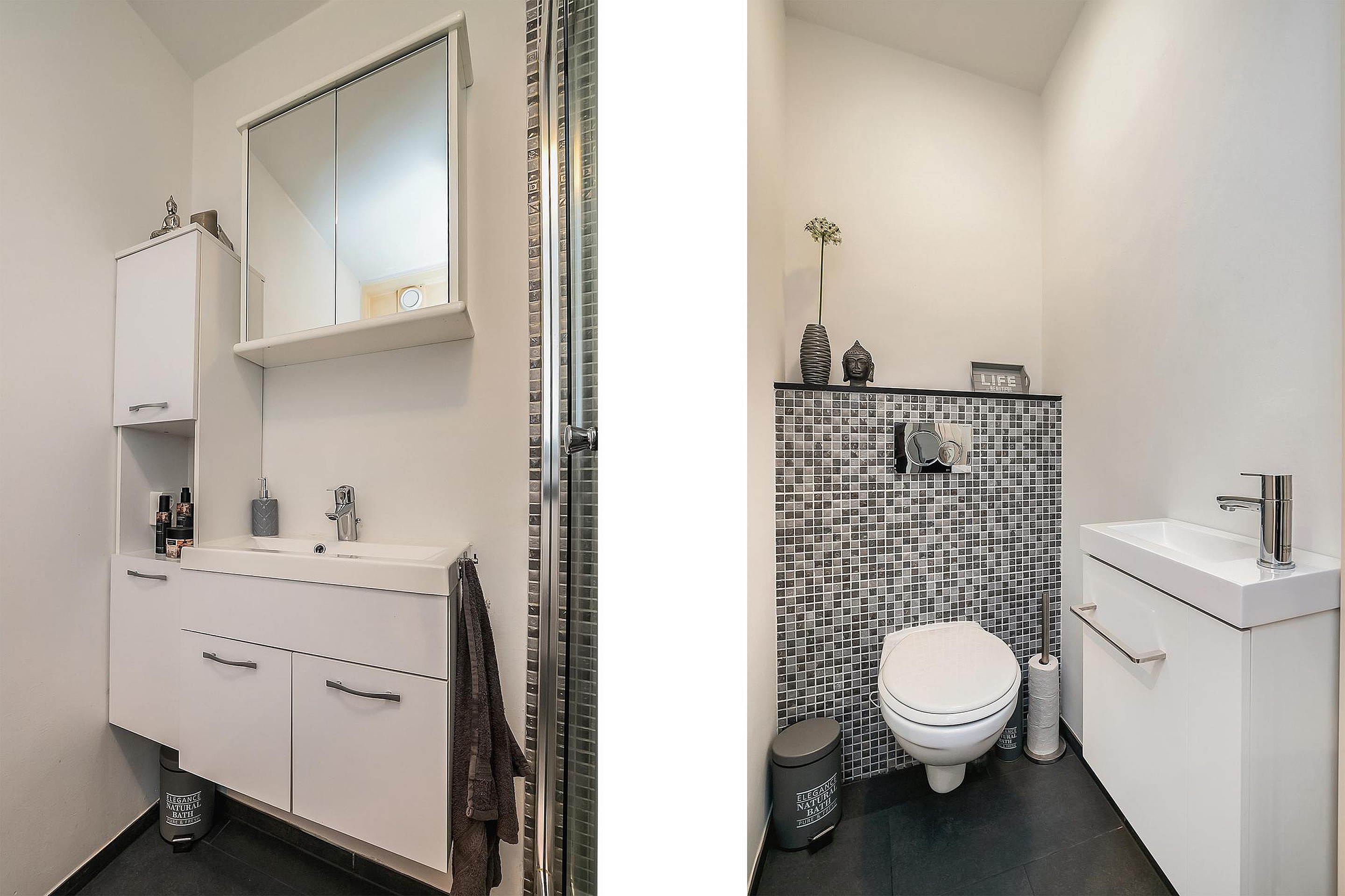 Geheel betegelde moderne badkamer met douchecabine, wastafel meubel en witgoedaansluitingen.