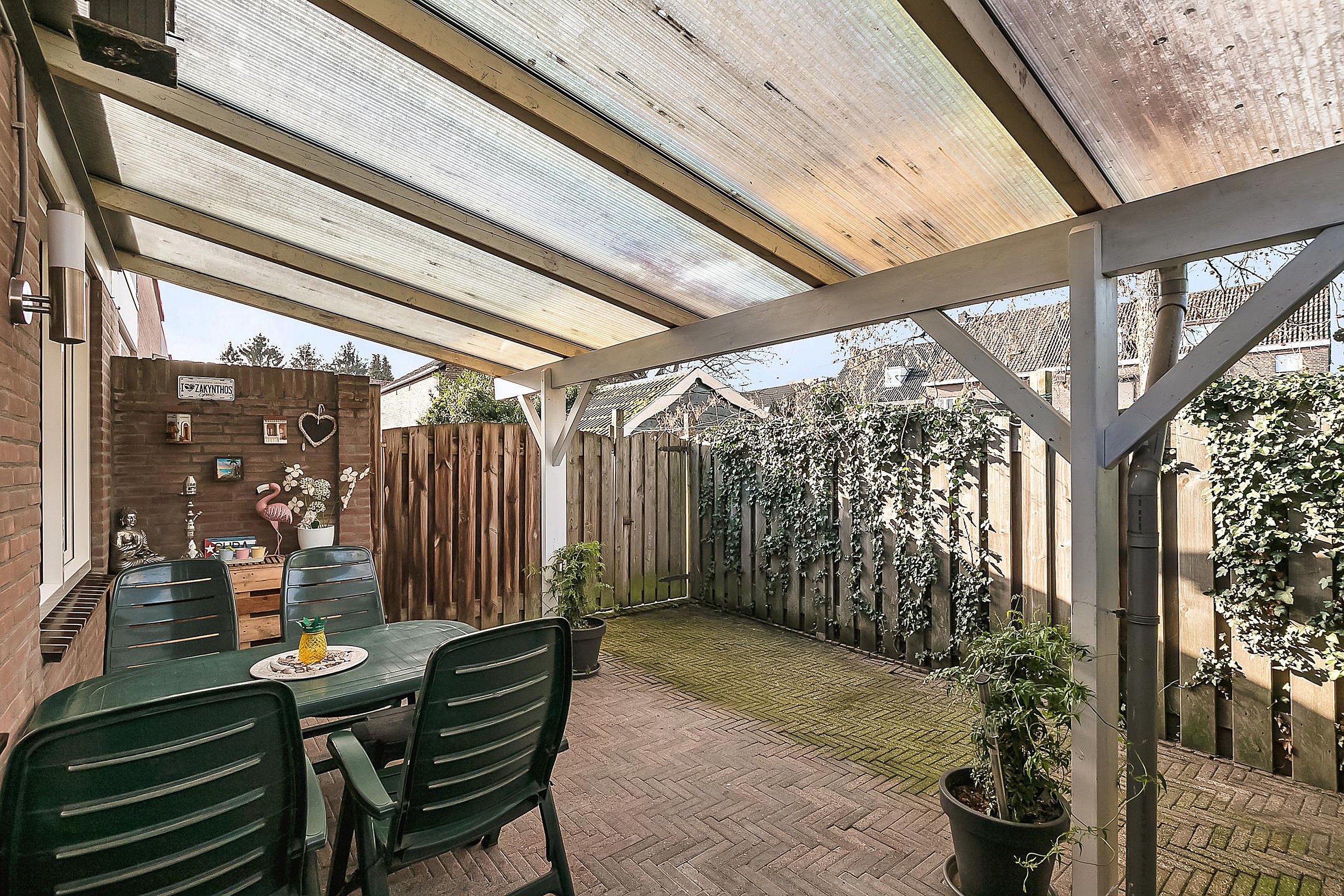 Geheel omsloten onderhoudsvriendelijke tuin met terrasoverkapping en achterom.