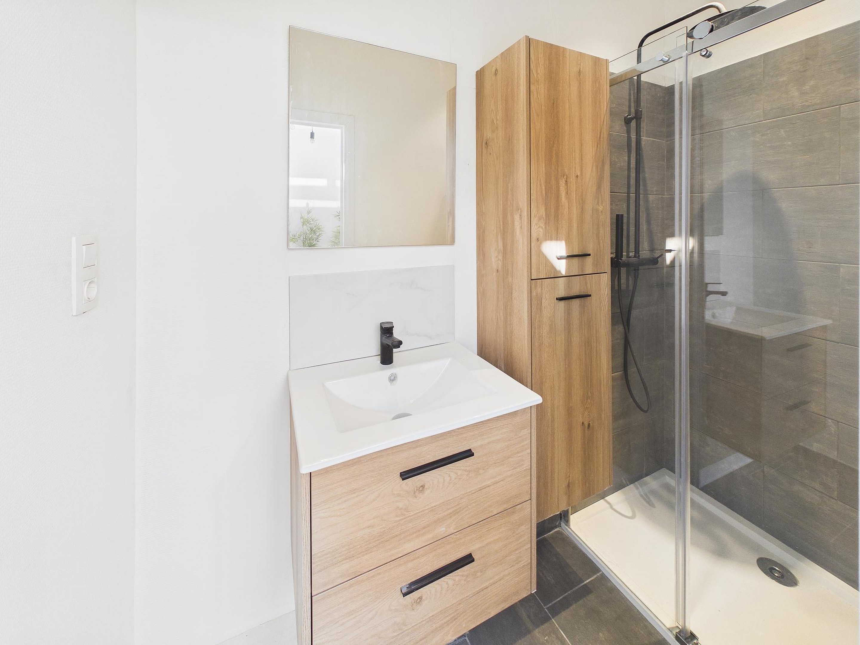 Inkomhal met toegang tot de ruime woonkamer en keuken. De nieuwe keuken is luxe uitgerust met een kookeiland en beschikt over alle benodigde inbouwapparatuur; een elektrische kookplaat, afzuigkap, oven en vaatwasser. Door de hal kom je bij de twee slaapkamers, de aparte toiletruimte en de badkamer. De badkamer beschikt over een douche en wastafel met meubel.