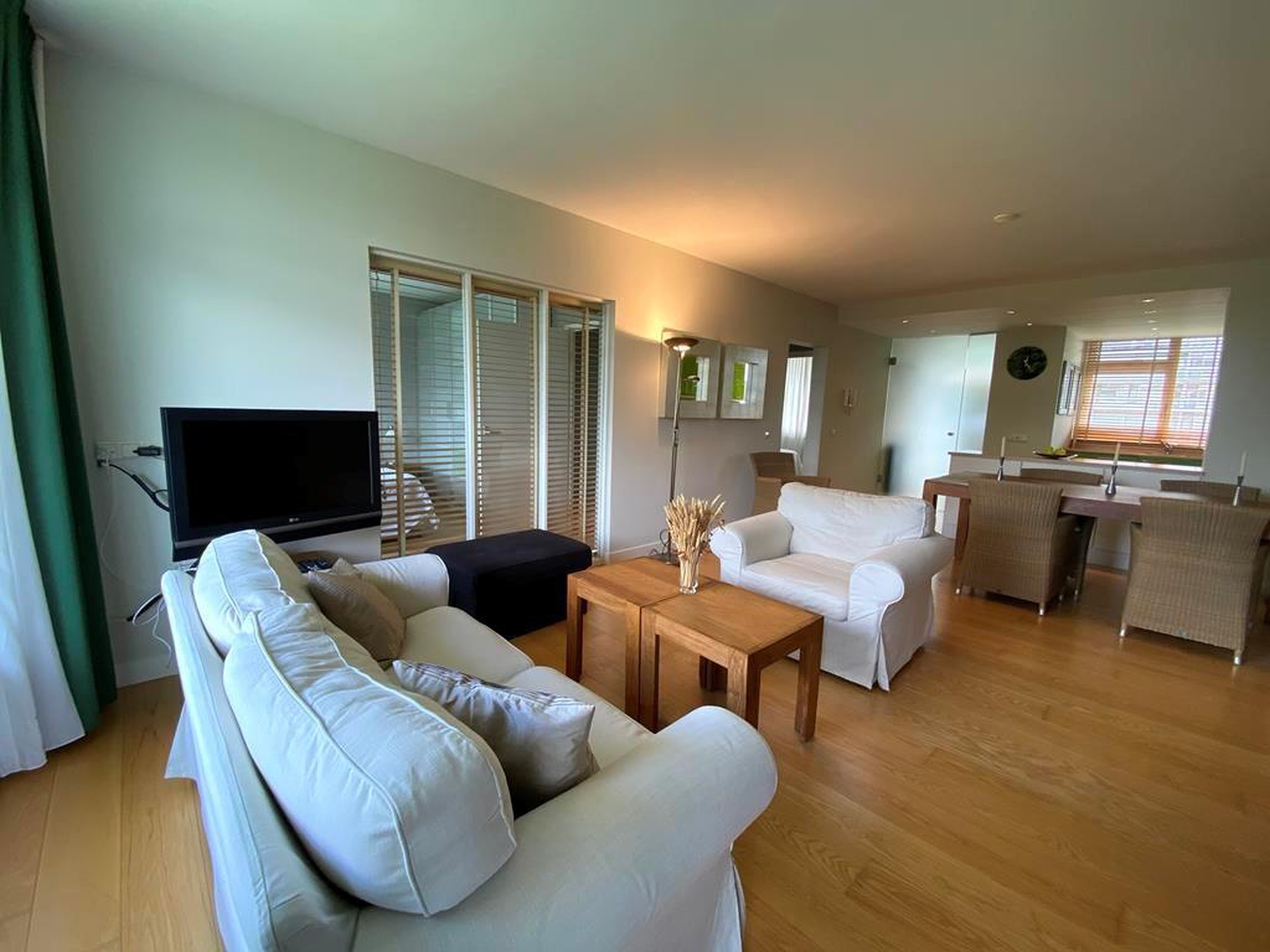 Living room: the apartment is a large, sunny living/dining room with a nice laminate floor throughout the whole apartment. Large windows, have access to a balcony that is the full length of the apartment. This looks look out on to the well kept, spacious, greenery.