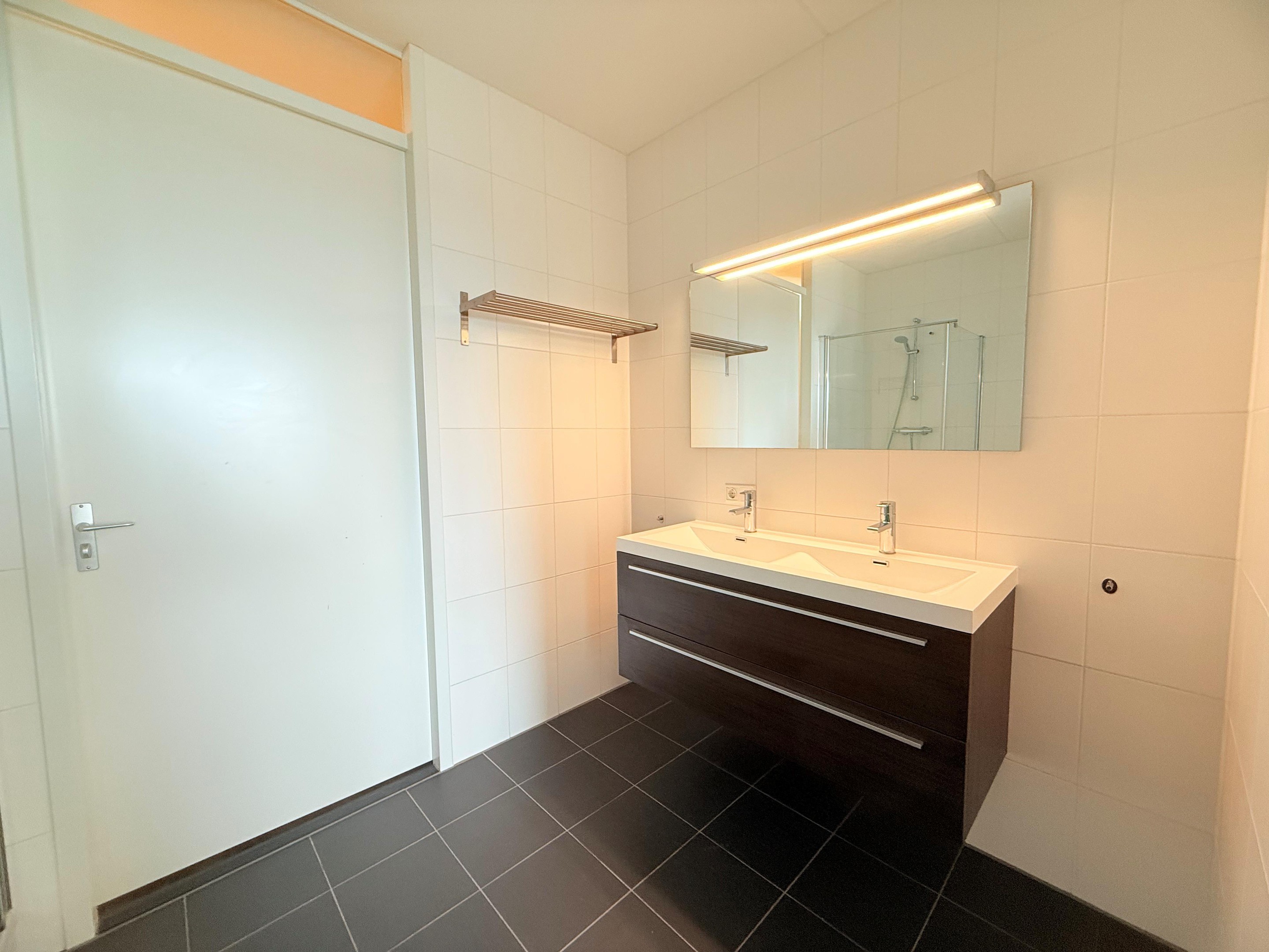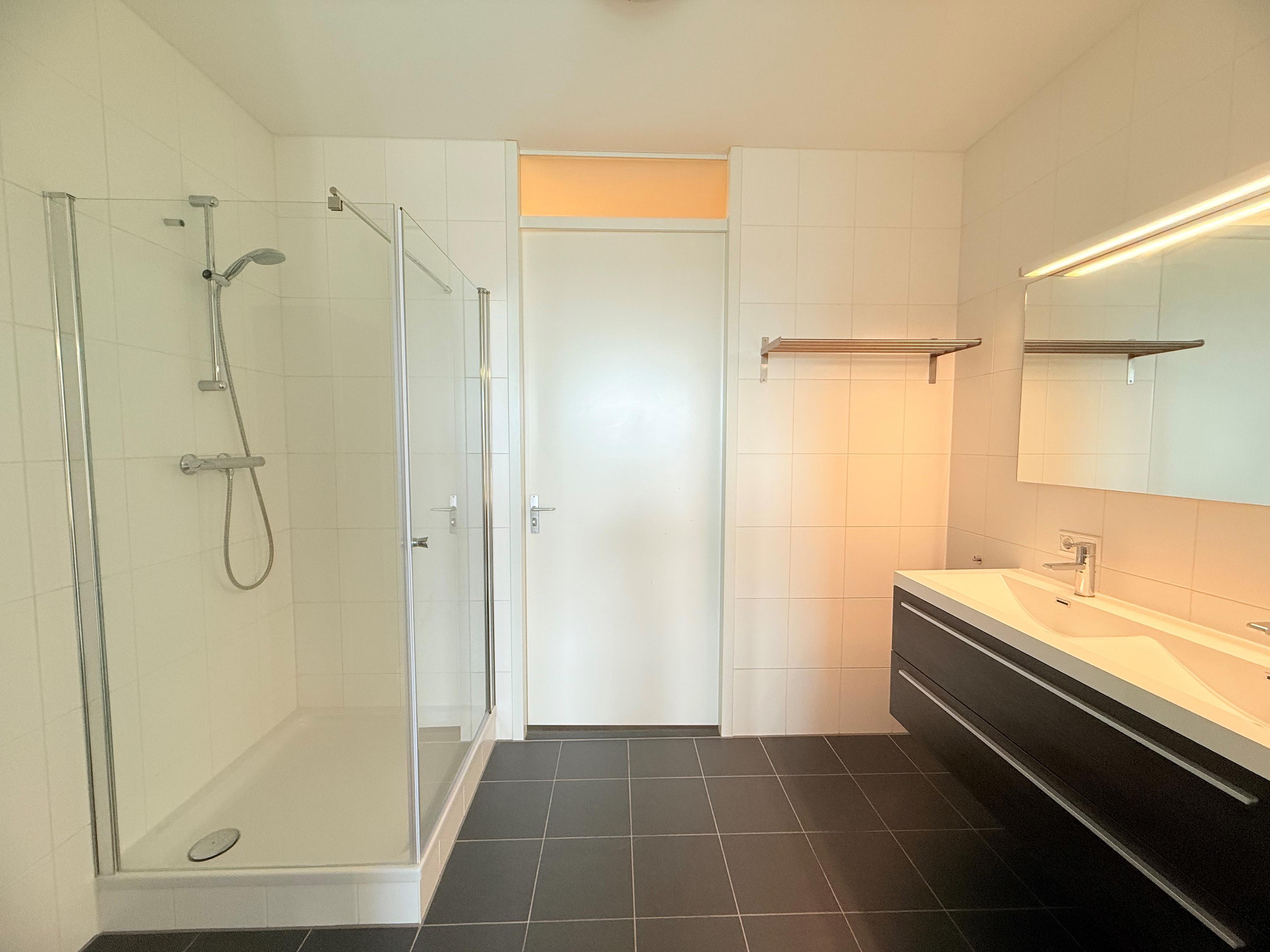 - Modern bathroom consisting of shower area as well as double wash basin;