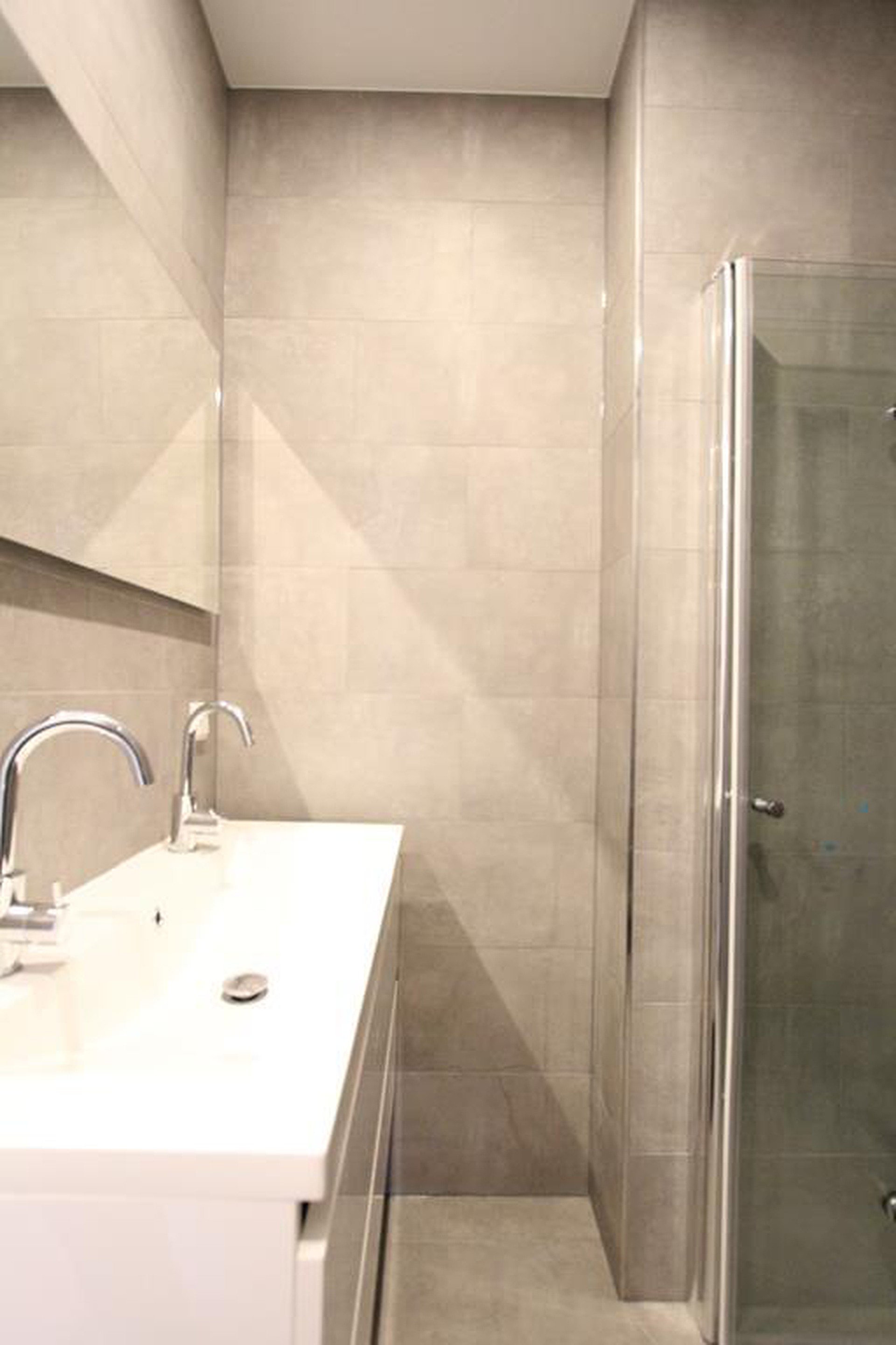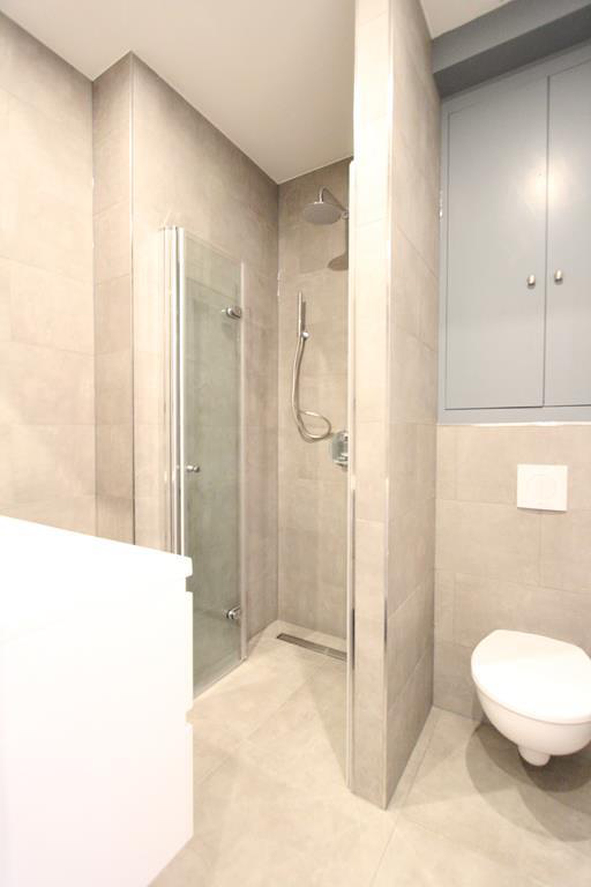 - The other bathroom has a shower, a bathtub and a toilet, along with heated towel rack.