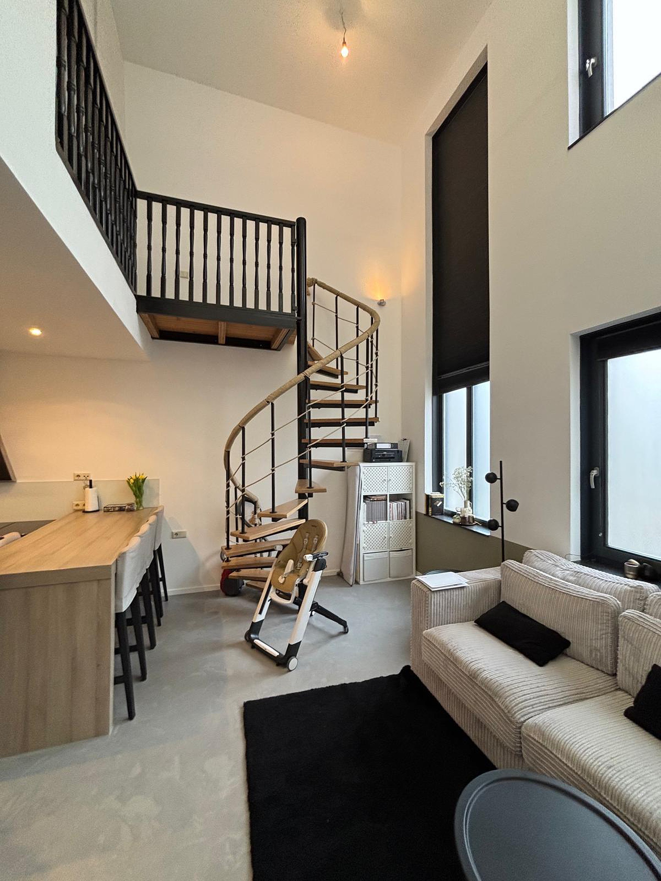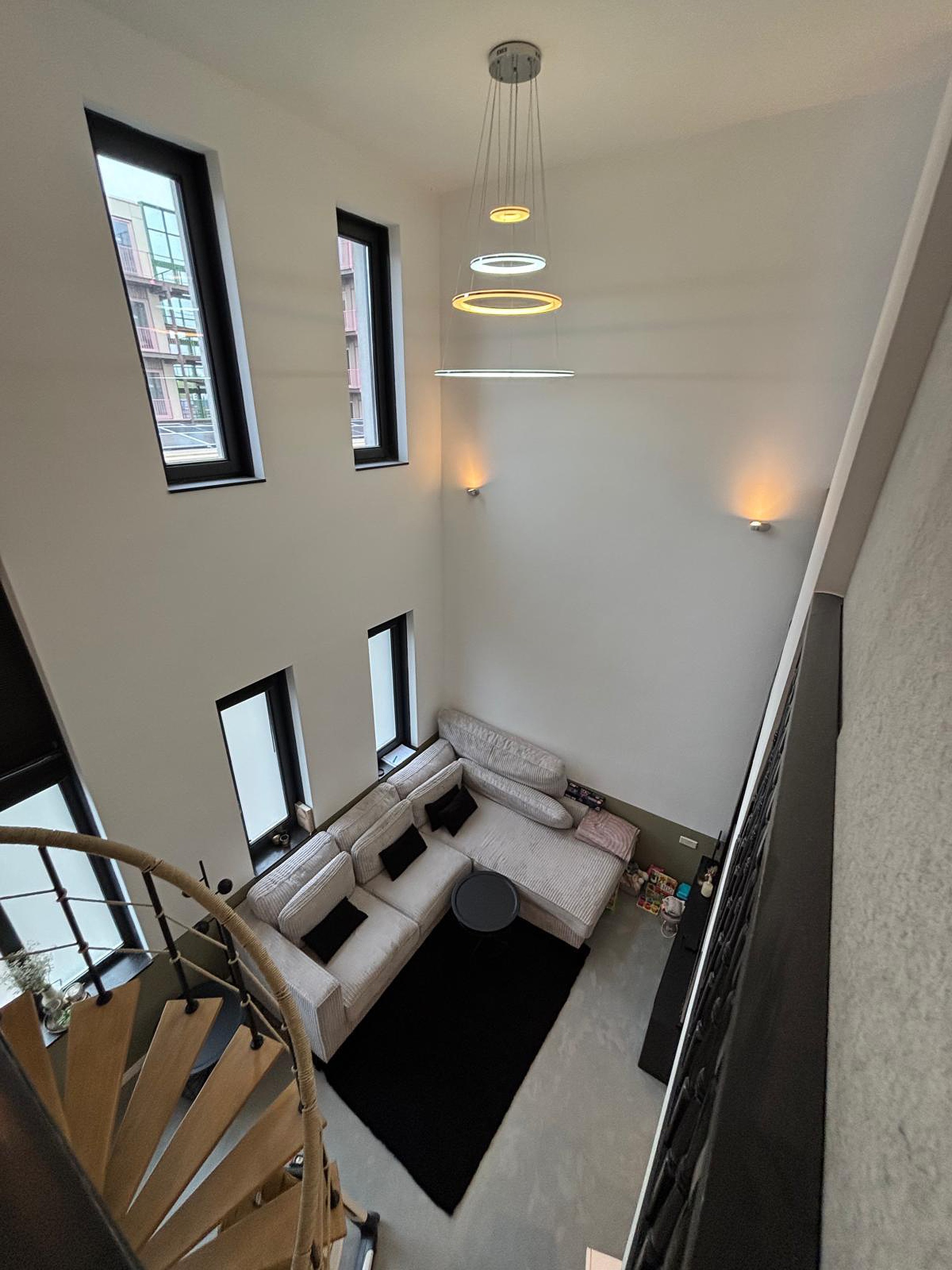 De bovenverdieping biedt een lichte en verrassend ruime woonkamer, met grote ramen die het daglicht mooi binnenlaten. De moderne open keuken is strak uitgevoerd en voorzien van inbouwapparatuur – perfect voor zowel dagelijks gemak als uitgebreid koken.