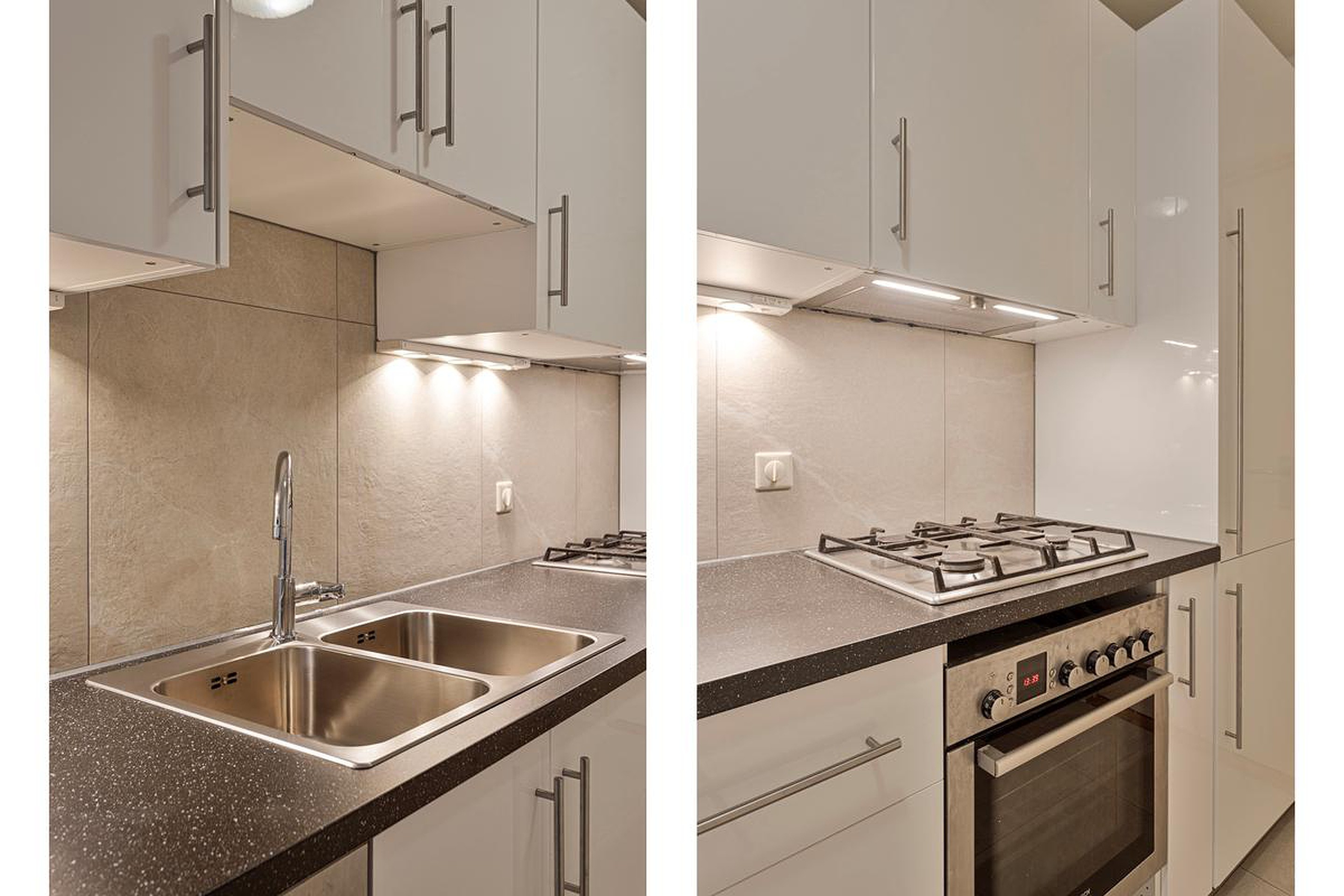 The kitchen includes built-in appliances and lots of storage space.