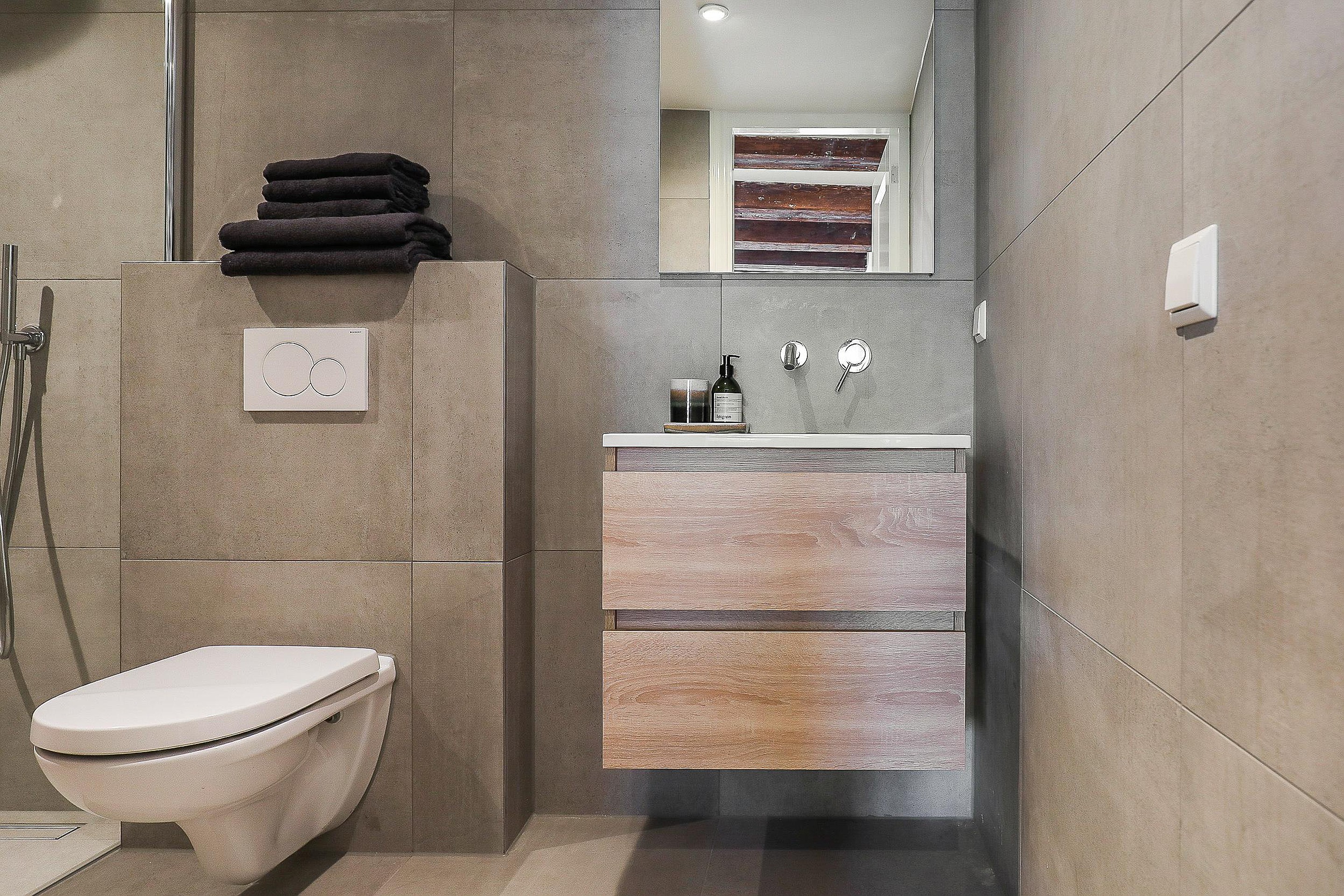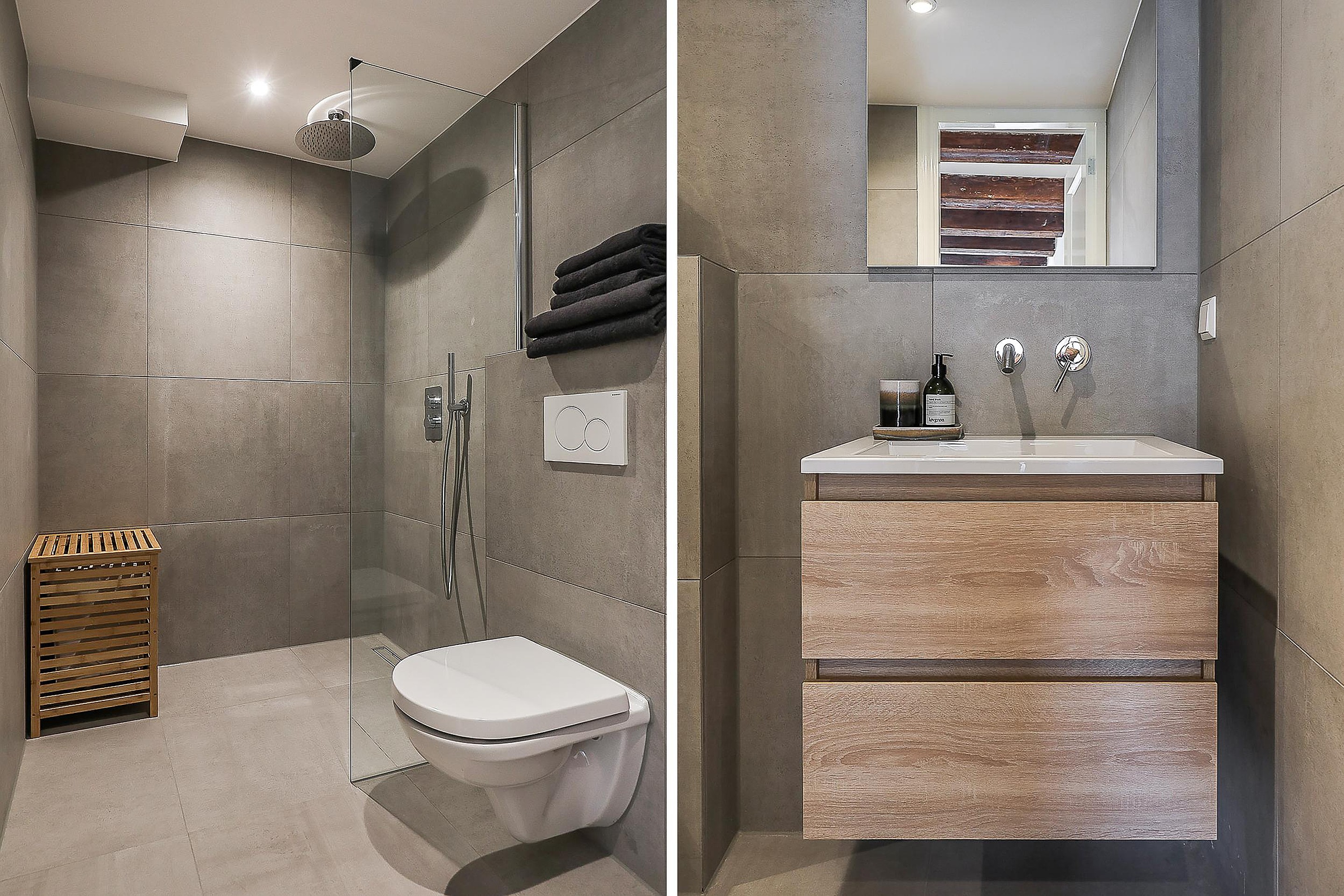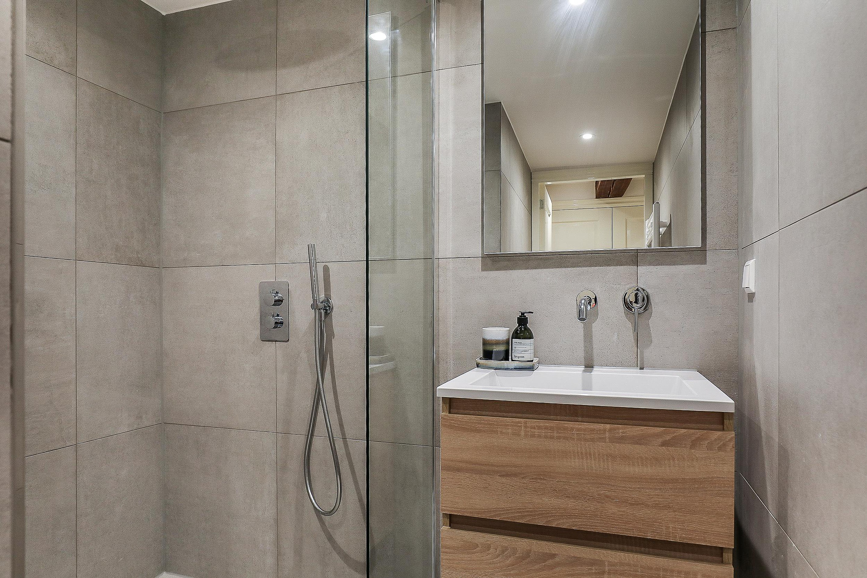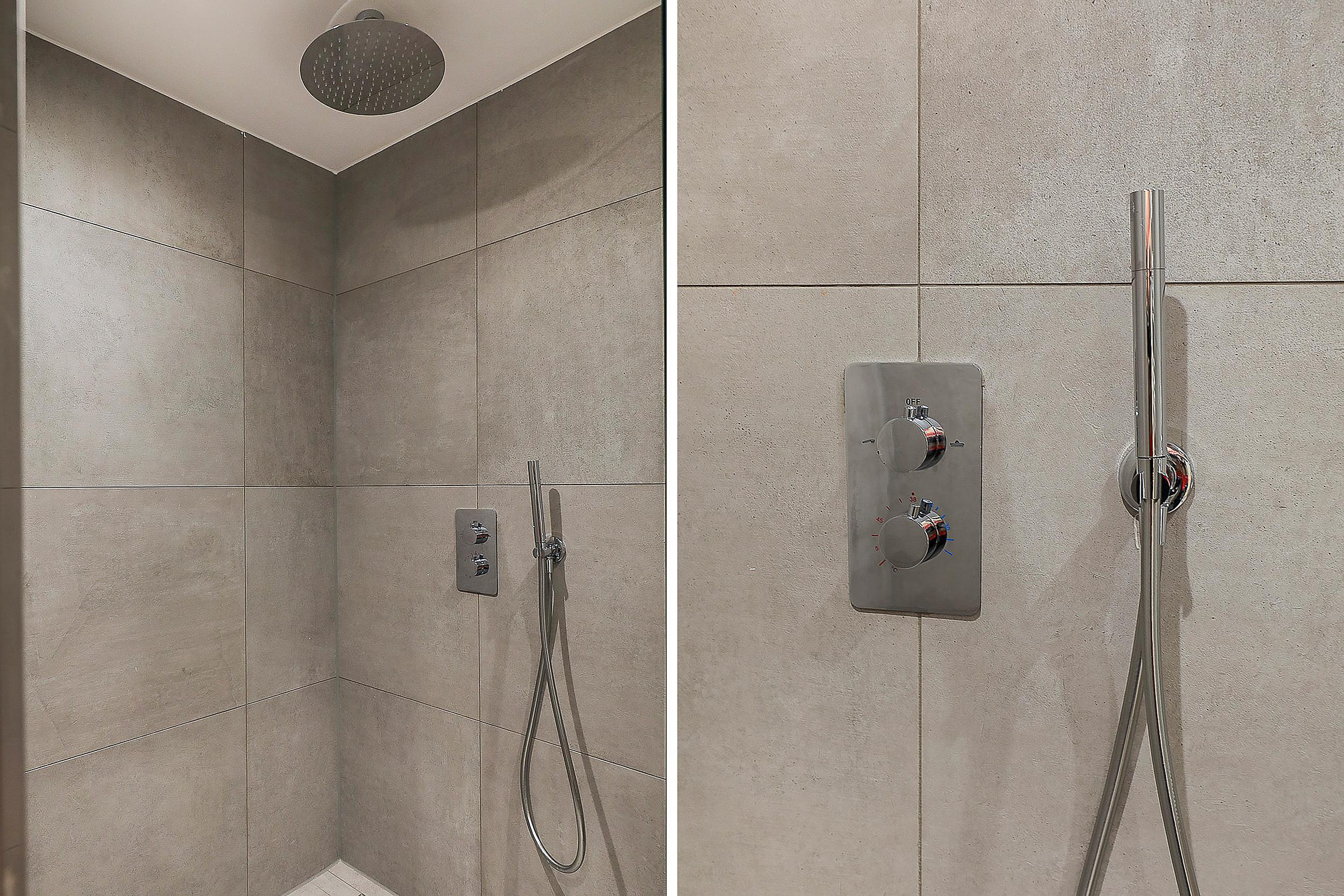 The second bathroom is fitted with a design radiator, washbasin cabinet with built-in tap, and a walk-in rain shower.