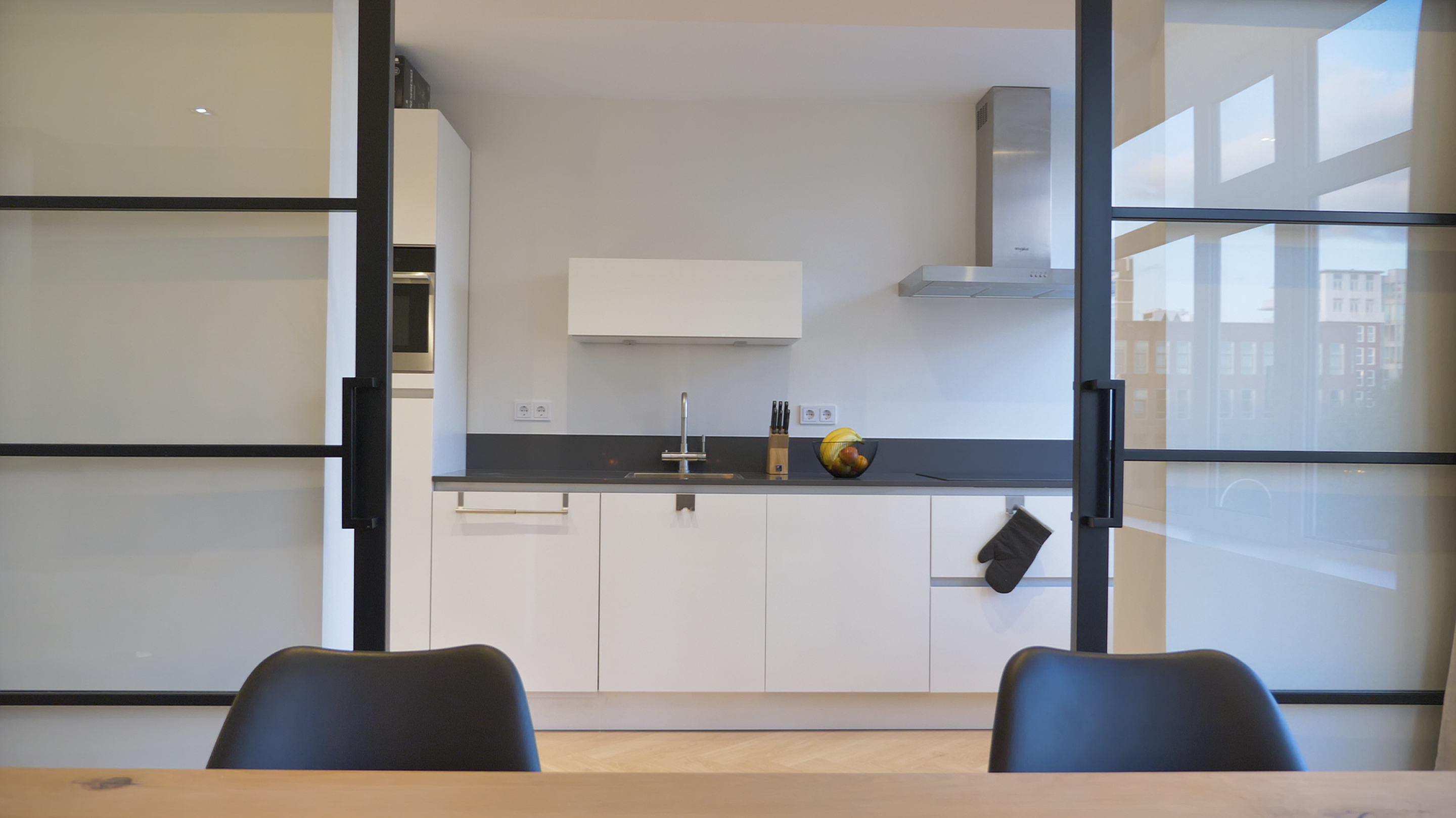De open keuken is voorzien van inbouwapparatuur zoals een elektrisch fornuis, koelkast, aparte vriezer, een quooker voor kokend heet water en een combi magnetronoven. Via de glazen schuifdeuren kom je in de woonkamer die is voorzien van een mooie eikenhouten eettafel en een heerlijke loungebank met een 55inch tv om te ontspannen. Voor de juiste sfeer in de woonkamer kun je verlichting en het geluid via je mobiel eenvoudig instellen.
