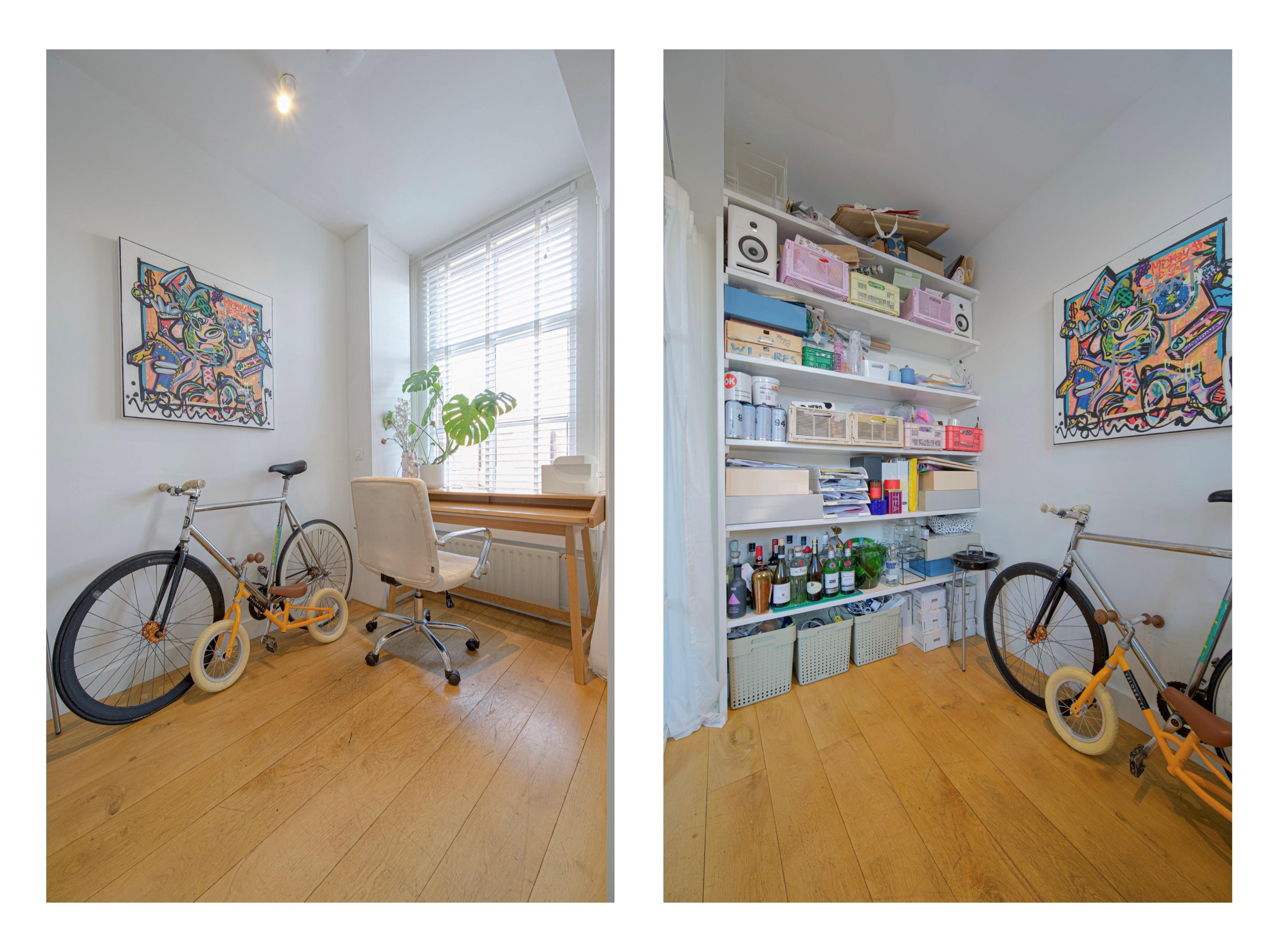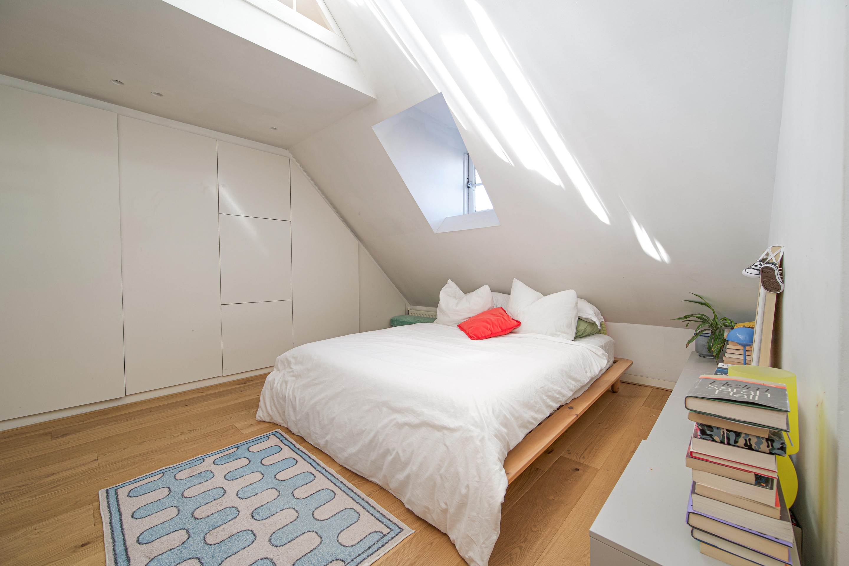 Via de speelse trap in de woonkamer kom je op de vierde verdieping met twee slaapkamers (beide voorzien van een 2-persoonsbed) en een badkamer. De master slaapkamer is open tot aan het plafond op de vijfde etage en heeft hierdoor in de ochtend een unieke lichtinval waarmee het door het natuurlijke licht fantastisch wakker worden is. Daarnaast is de gehele wand voorzien van inbouw kastruimte en in een nis een grote spiegel. De badkamer beschikt over een wastafel, wc en een wasmachine. Via de trap is er toegang tot de vijfde verdieping. Deze ruimte is ingericht als muziek/werkkamer. Vanuit hier rechtstreeks toegang naar het ruime dakterras met een fraai uitzicht over stad.