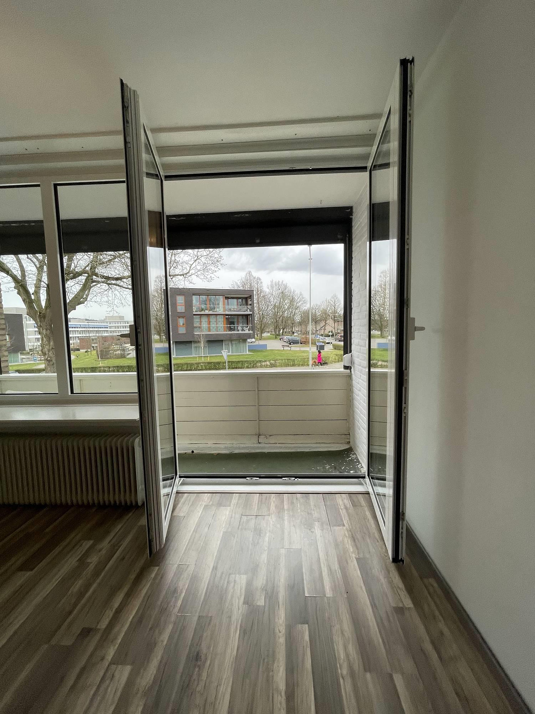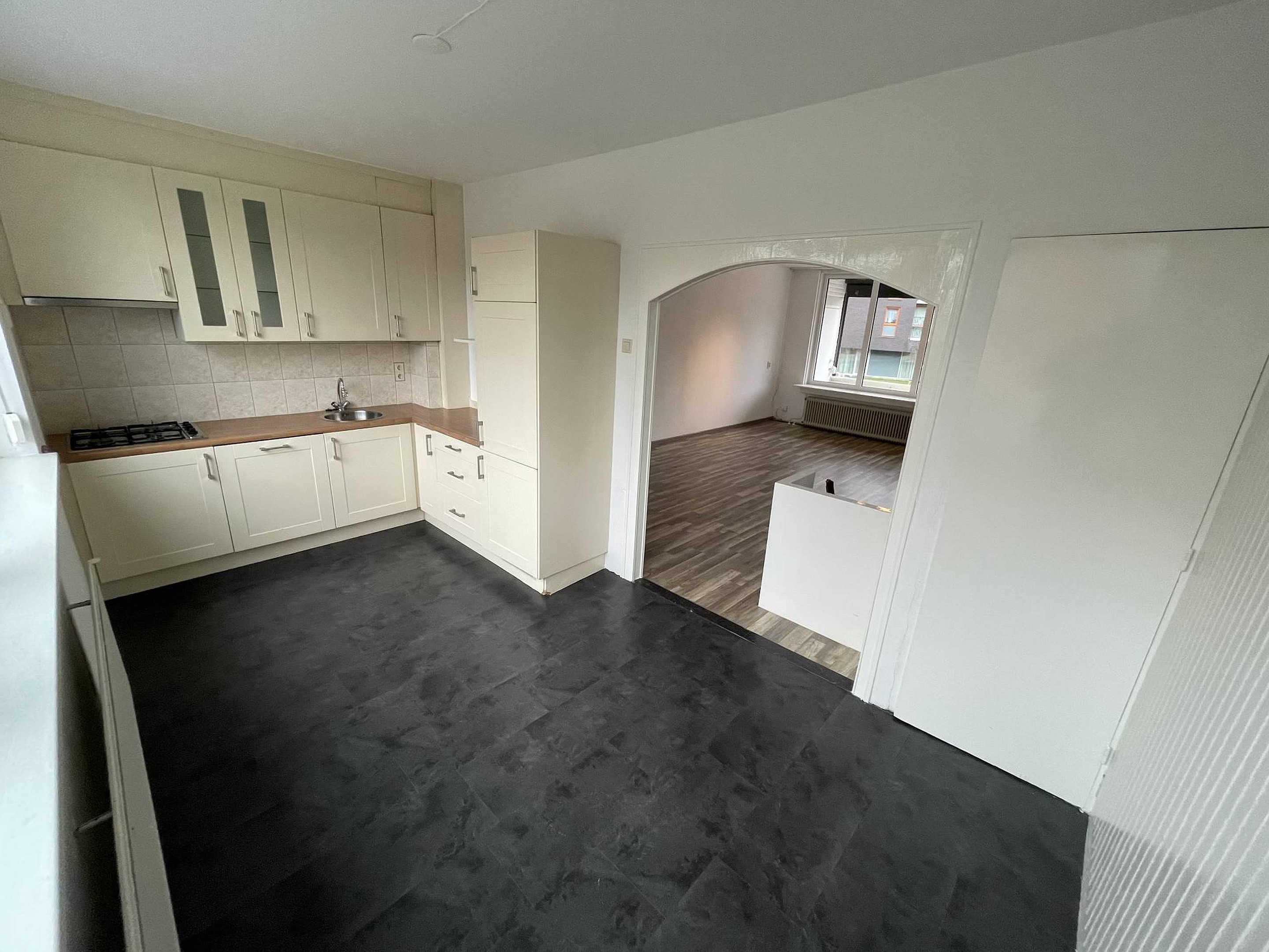 Middels de entree kunt met een vaste trap naar de eerste verdieping waar zich de woonkamer en keuken bevinden. De keuken is voorzien van een vierpits-gasfornuis, afzuigkap, vaatwasser, wasbak en een koelkast met vriezer. De woonkamer is ruim van opzet geniet veel lichtinval en voorzien van nieuw laminaat. De woonkamer heeft een dubbele deur welke toegang geeft tot het balkon welke middels een rolluik is af te sluiten.
