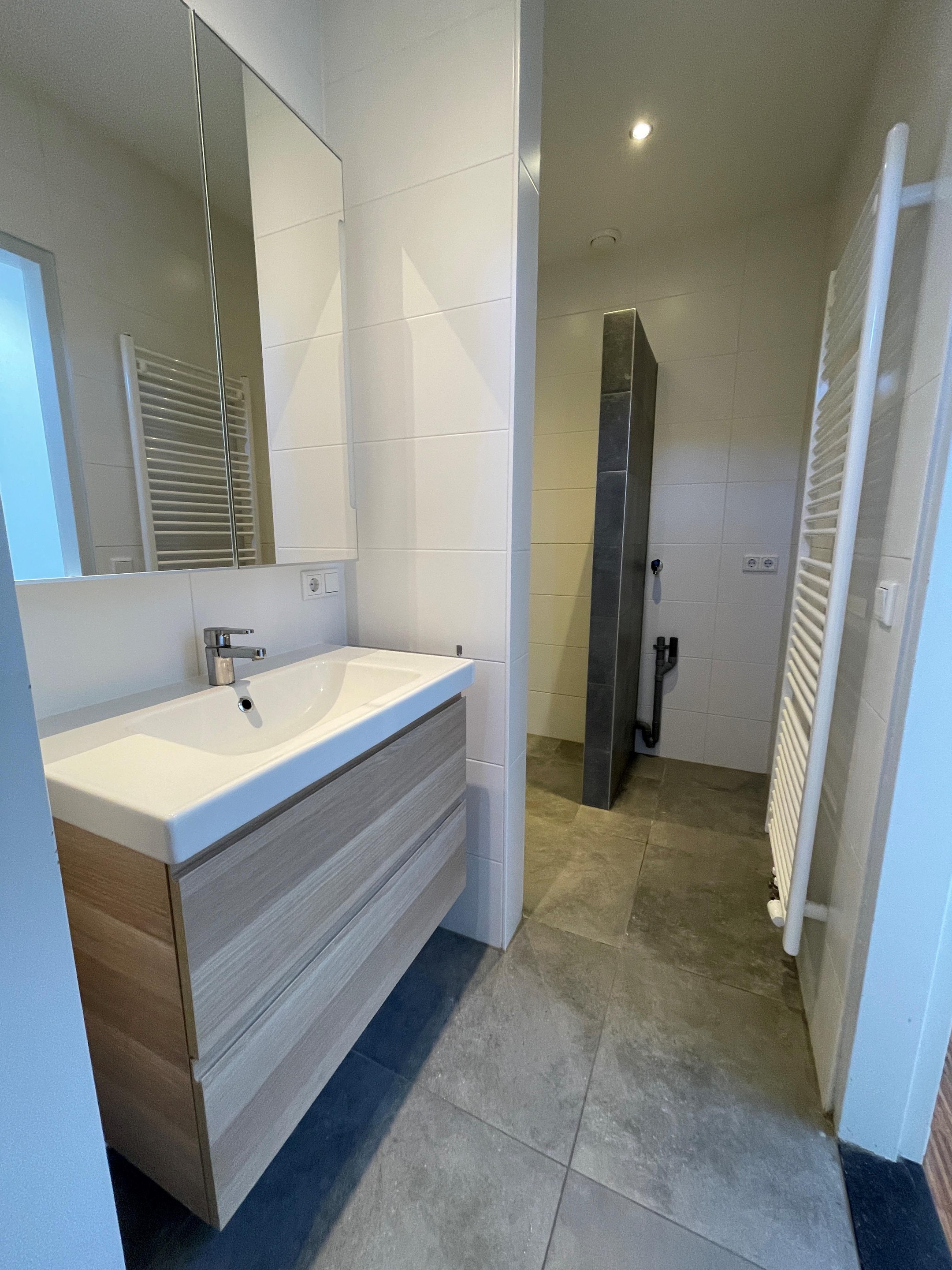 Entree op de 1e verdieping. Het woongedeelte is royaal opgezet met aan de achterzijde een groot dakterras. De luxe open keuken is voorzien van diverse apparatuur oa een met een kookplaat, afzuigkap, magnetron/oven, vaatwasser. De badkamer ligt aan de voorzijde heeft een douche, wastafel en toilet en ruimte voor de wasmachine en droger.