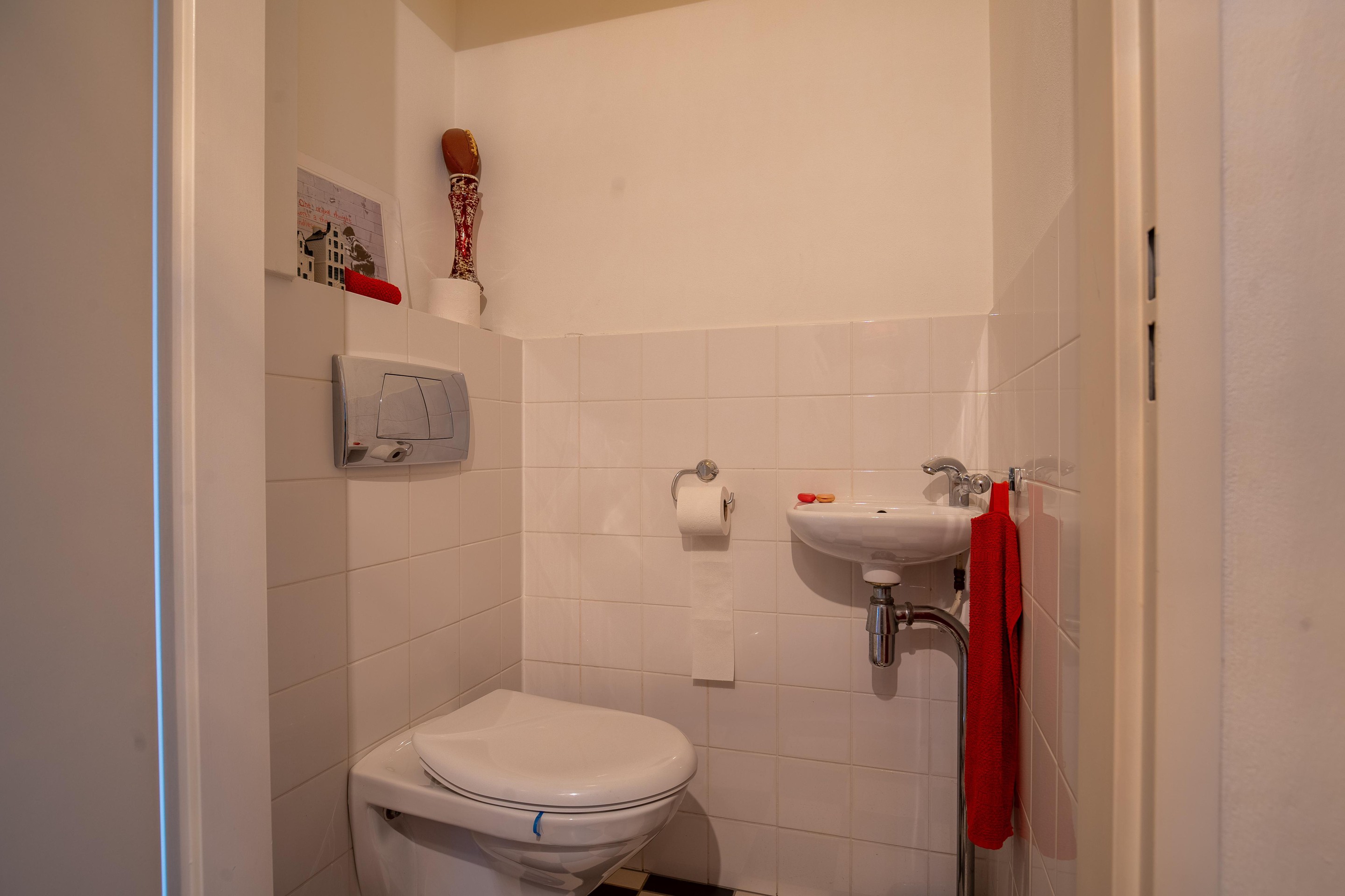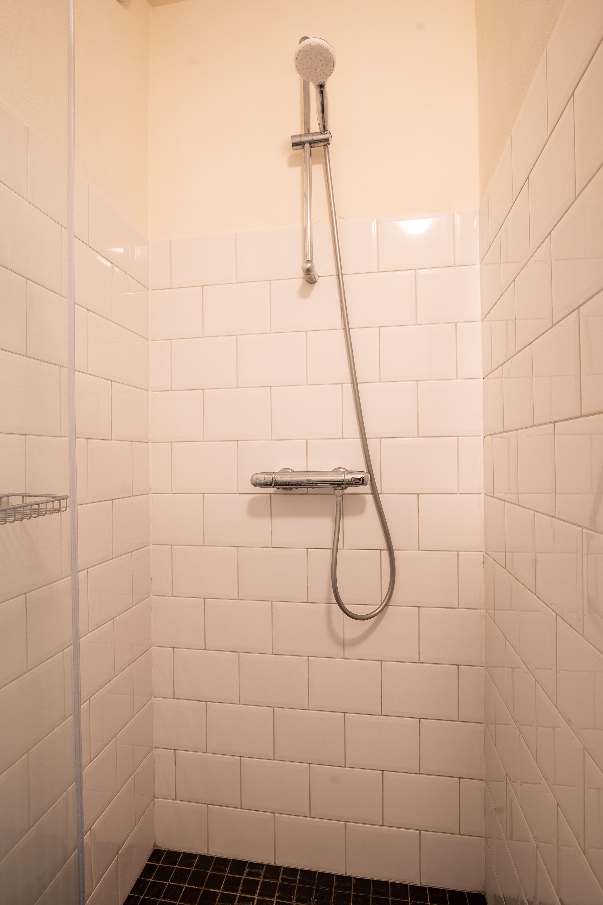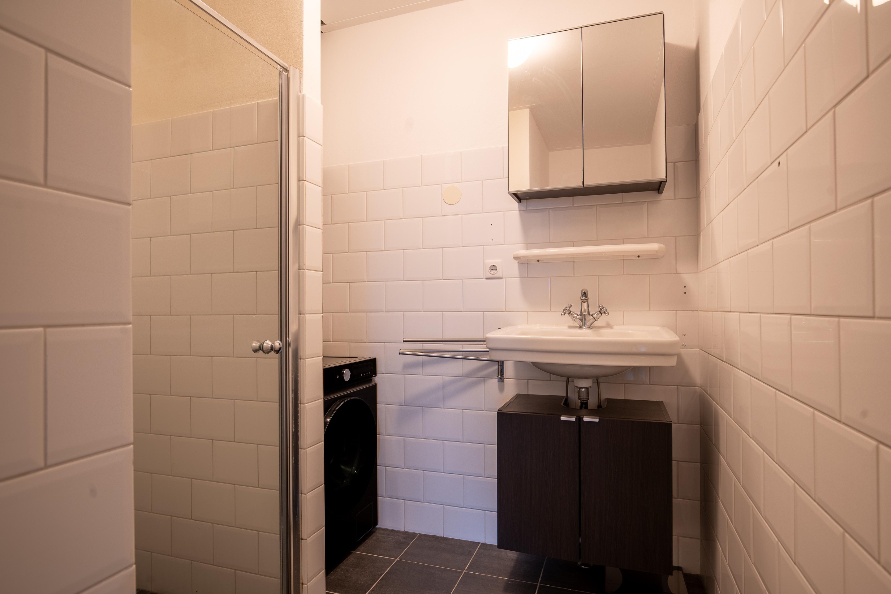 De badkamer is praktisch ingericht met een douche, wastafelmeubel en wasmachineaansluiting.