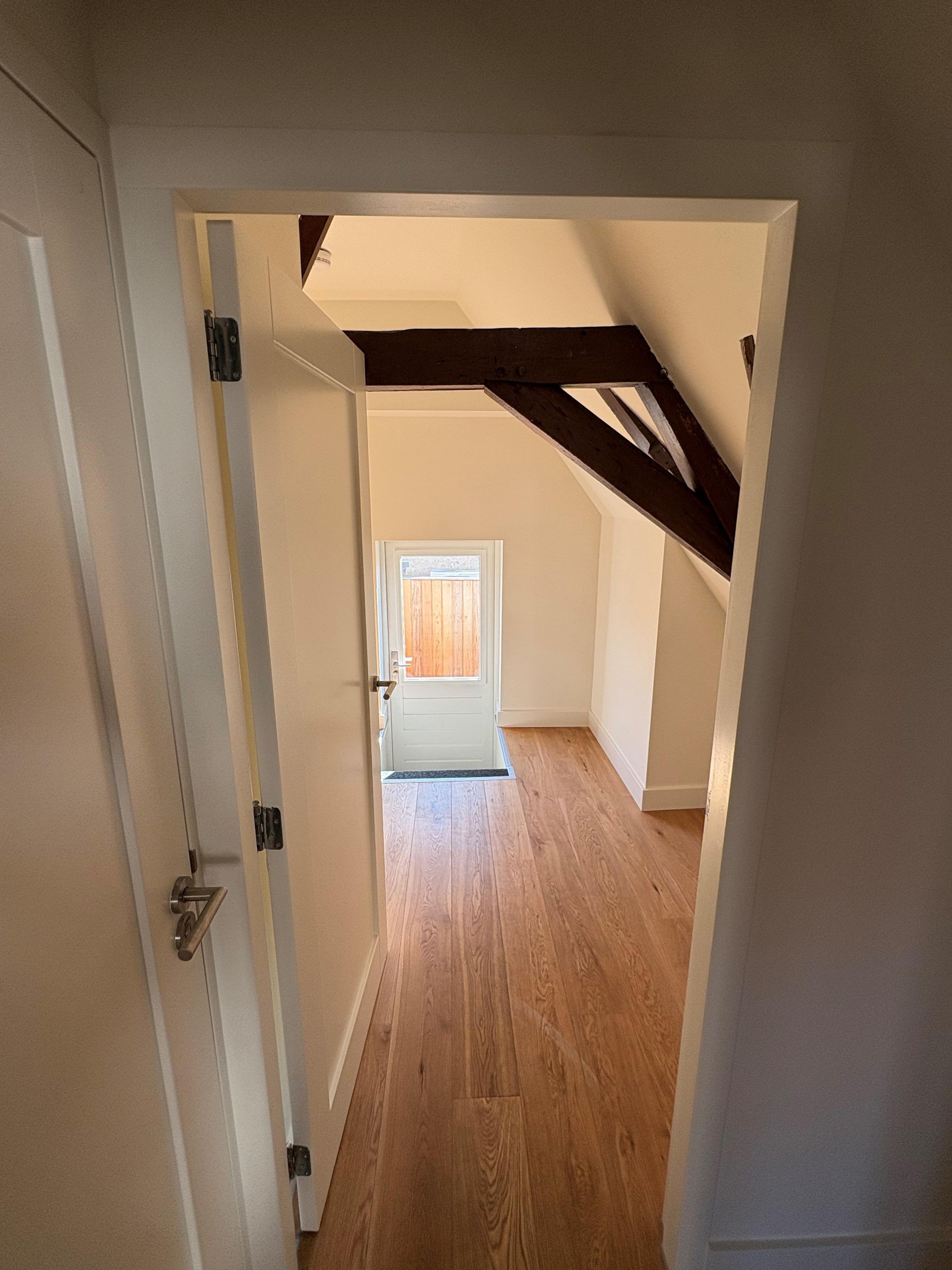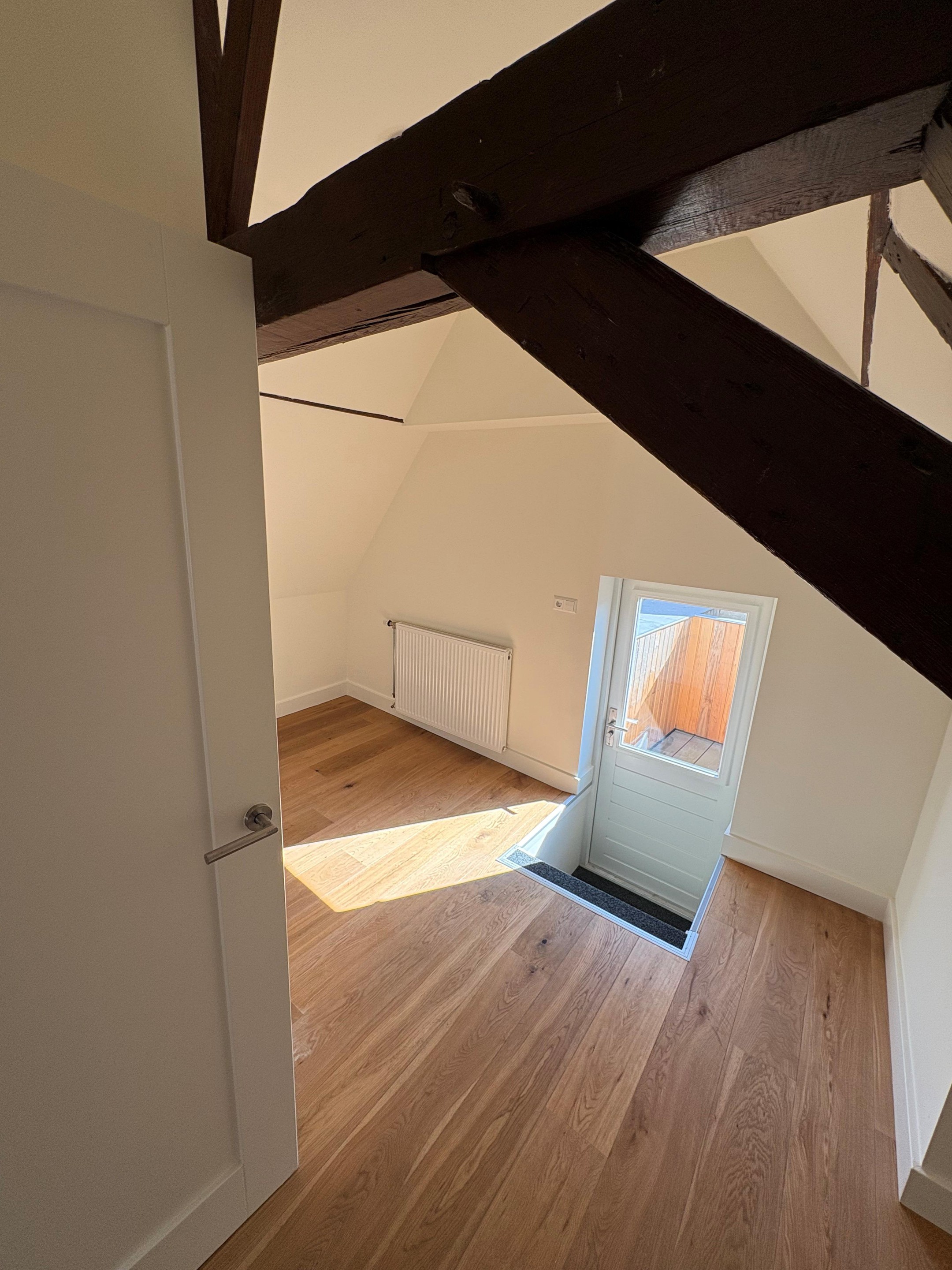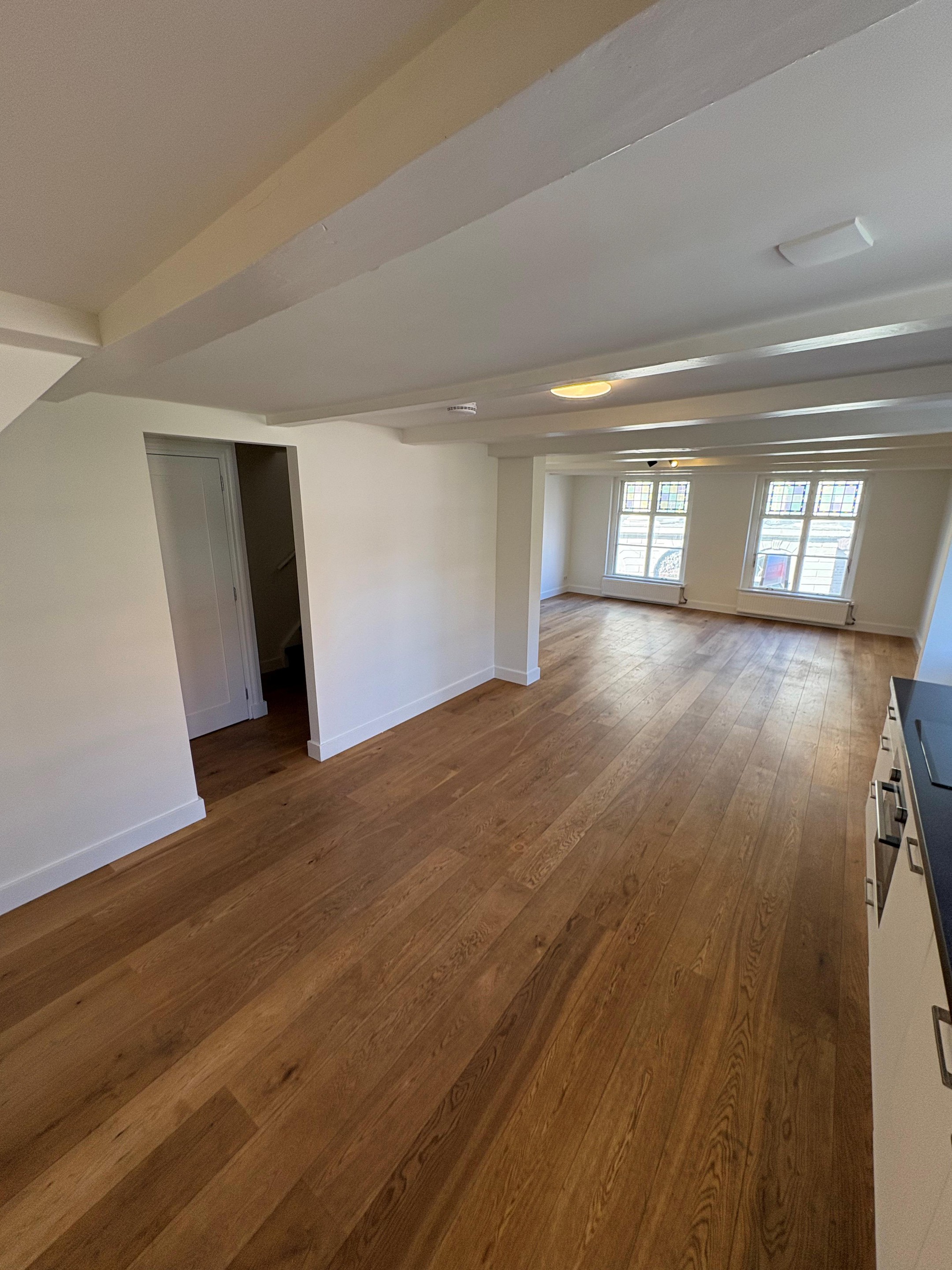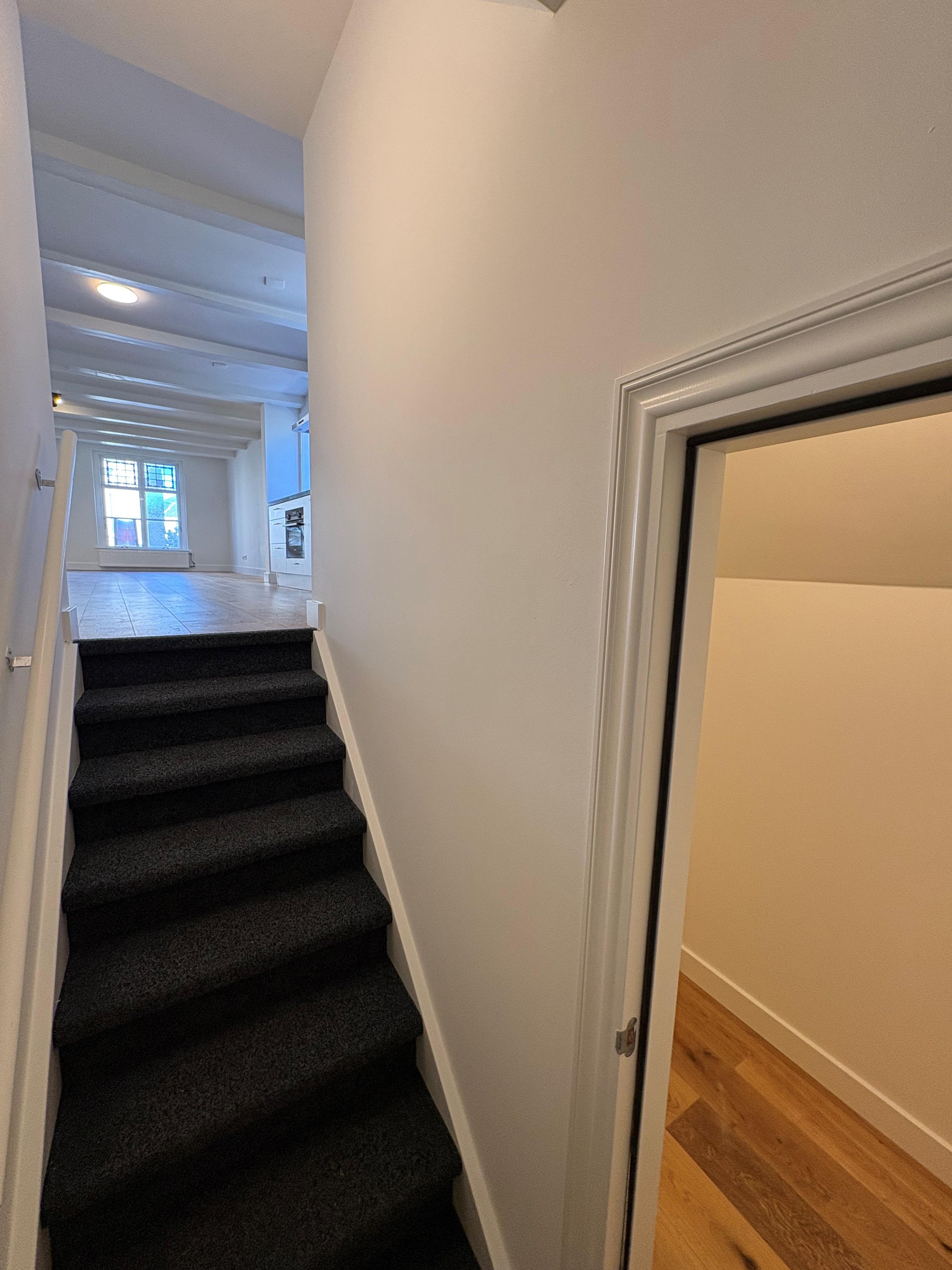 Tweede verdieping Entree appartement. Ruime hal met bergruimte en trap naar de tweede verdieping. Tweede verdieping: Royale woonkamer met een moderne open keuken, voorzien van diverse inbouwapparatuur. Vanuit de woonkamer heeft u een prachtig uitzicht op de Hartebrugkerk, de Haarlemmerstraat en de Lange Mare. Tussenhal met modern zwevend toilet en fonteintje, ruimte met opstelling van de c.v.-combiketel en extra bergruimte onder de trap.