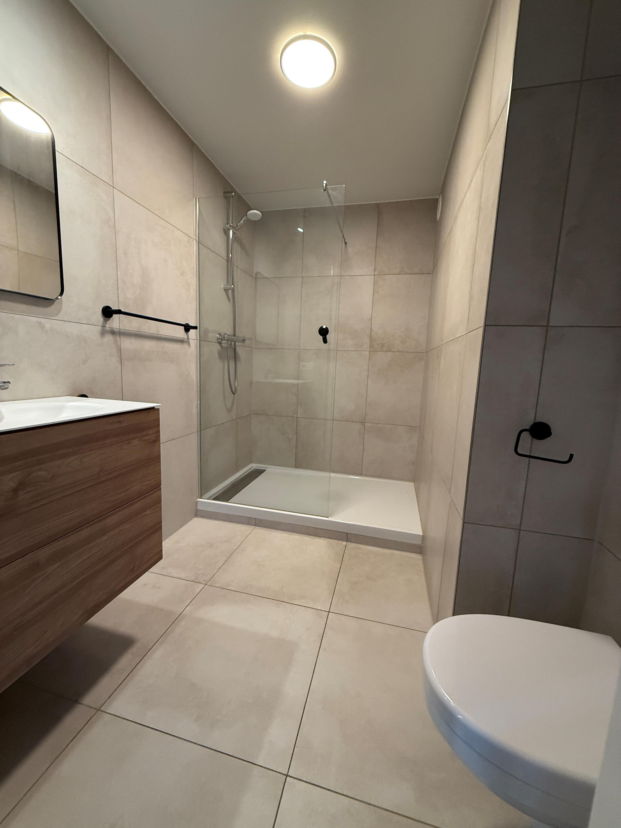 Luxury bathroom. There is a shared washing room with washers and dryers.