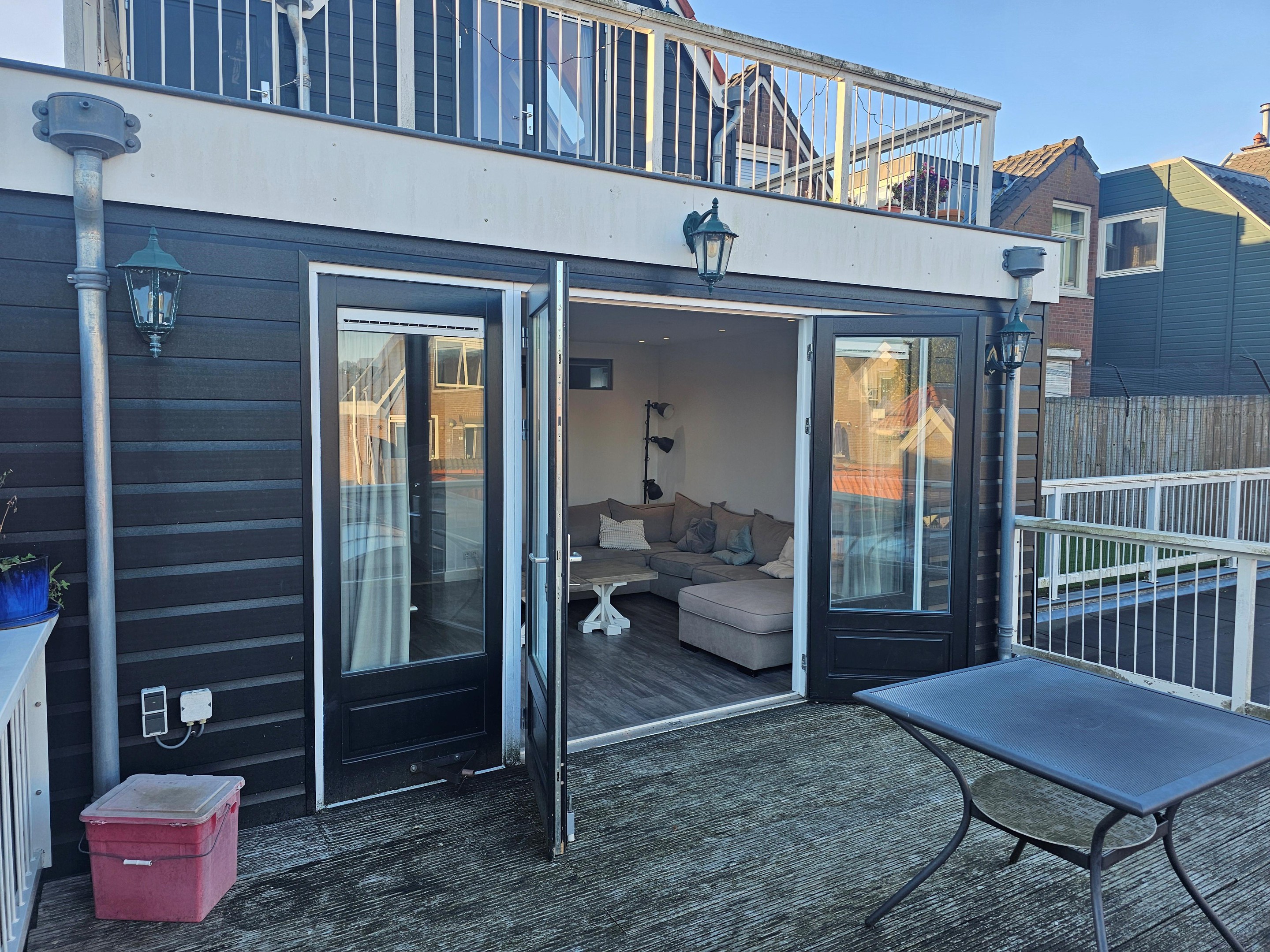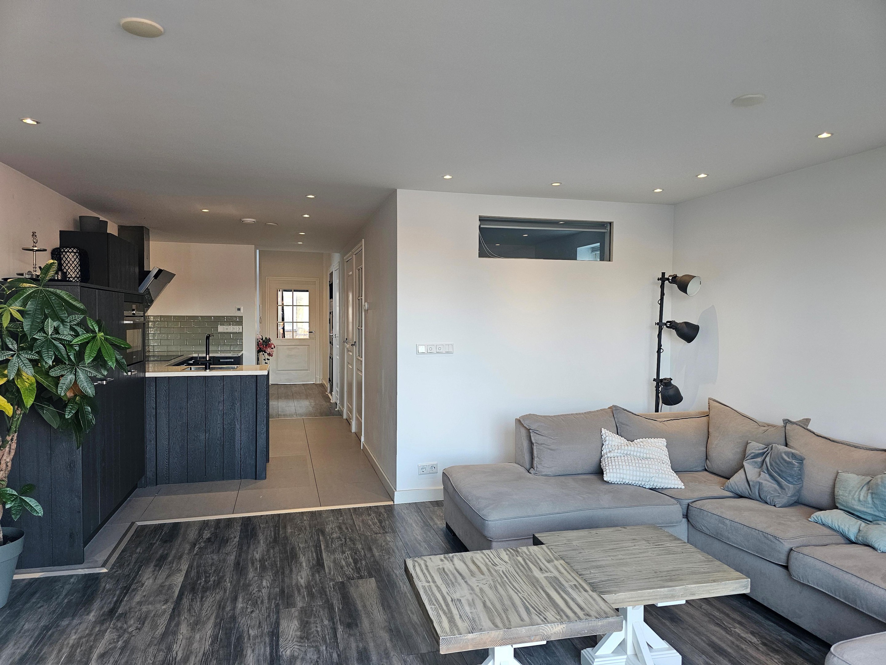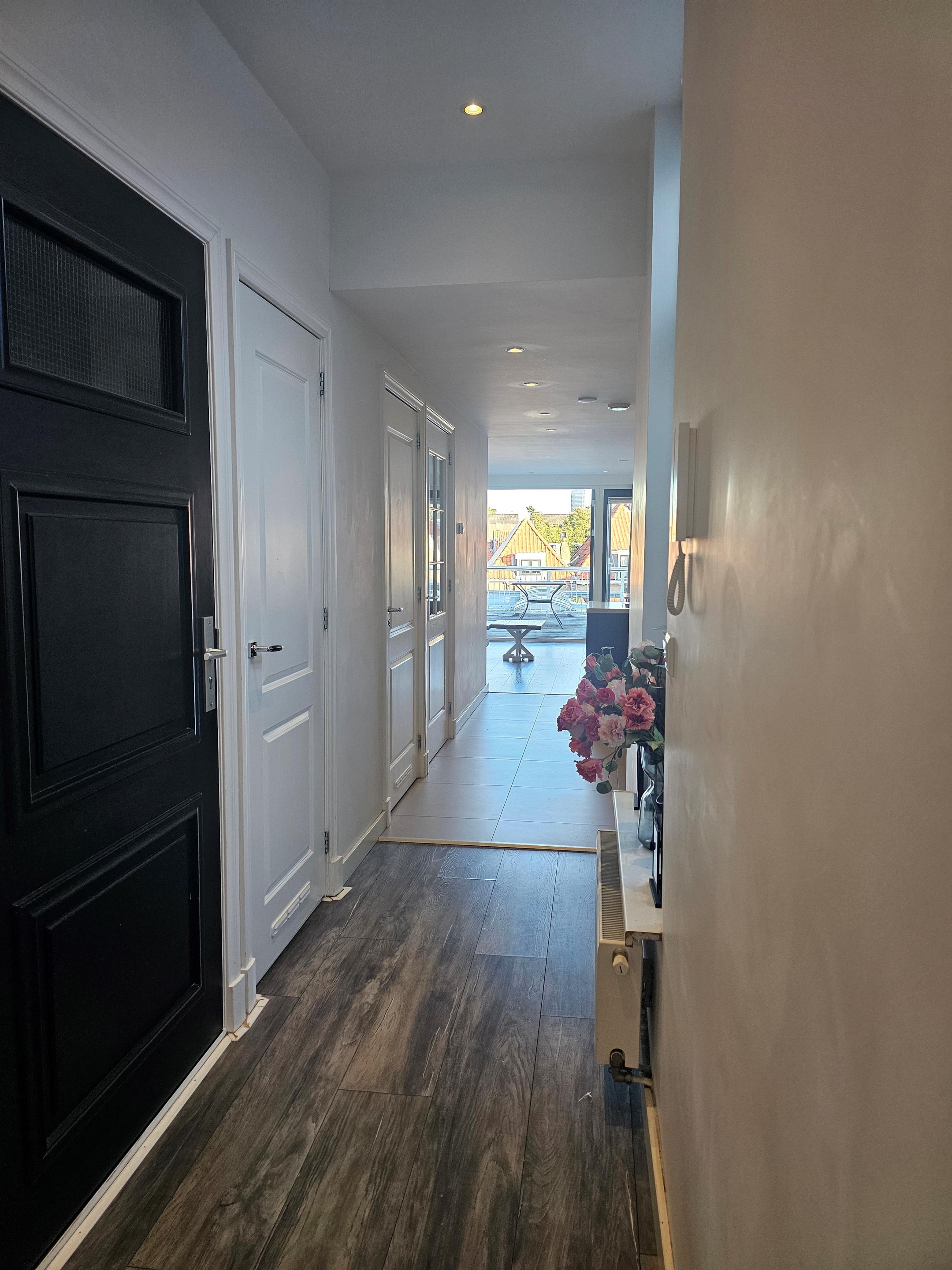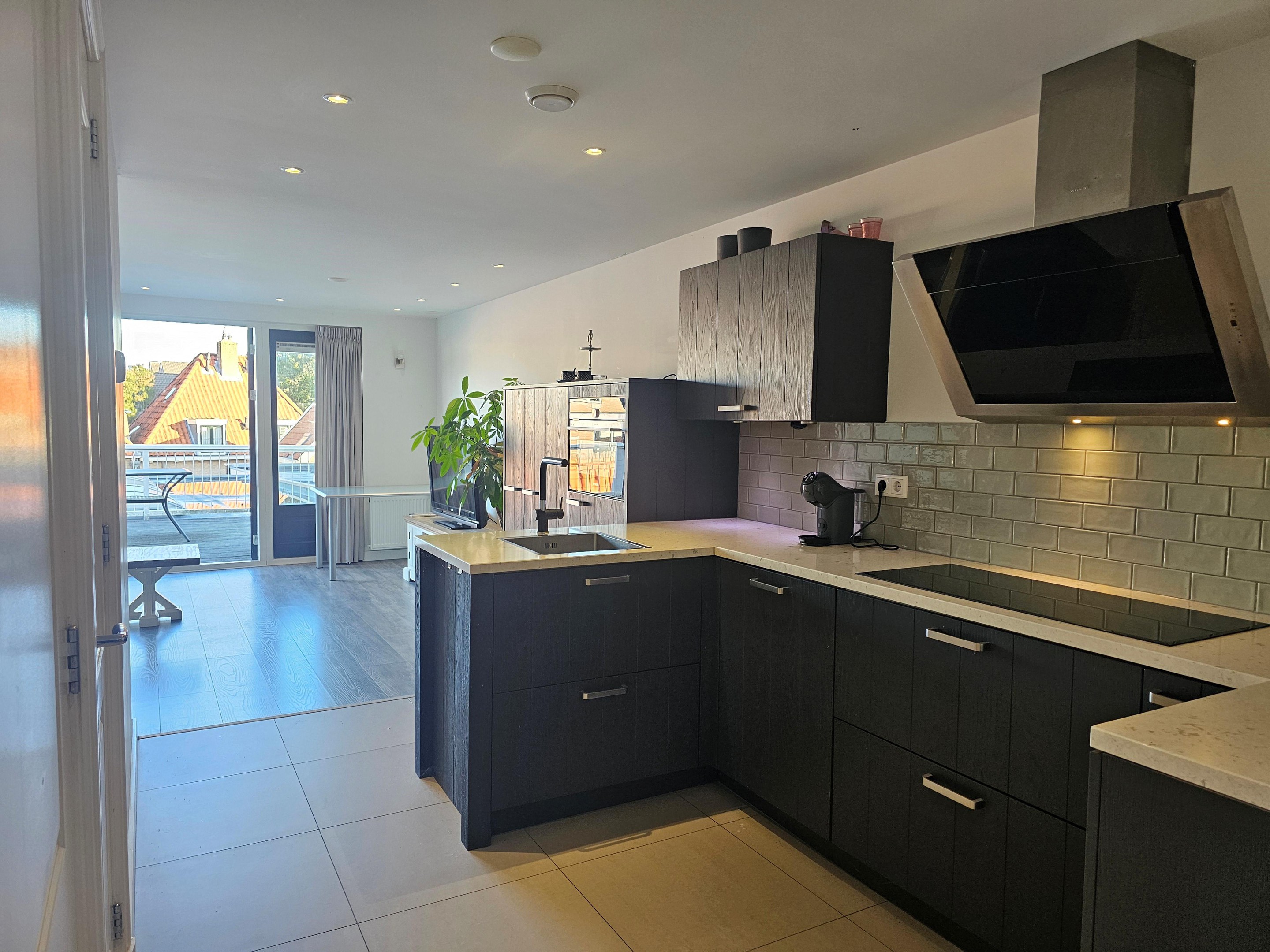 Hal, woonkamer met aangrenzend dakterras, een luxe keuken met inbouwapparatuur, badkamer met douche, wastafelmeubel, toilet, 2 slaapkamers