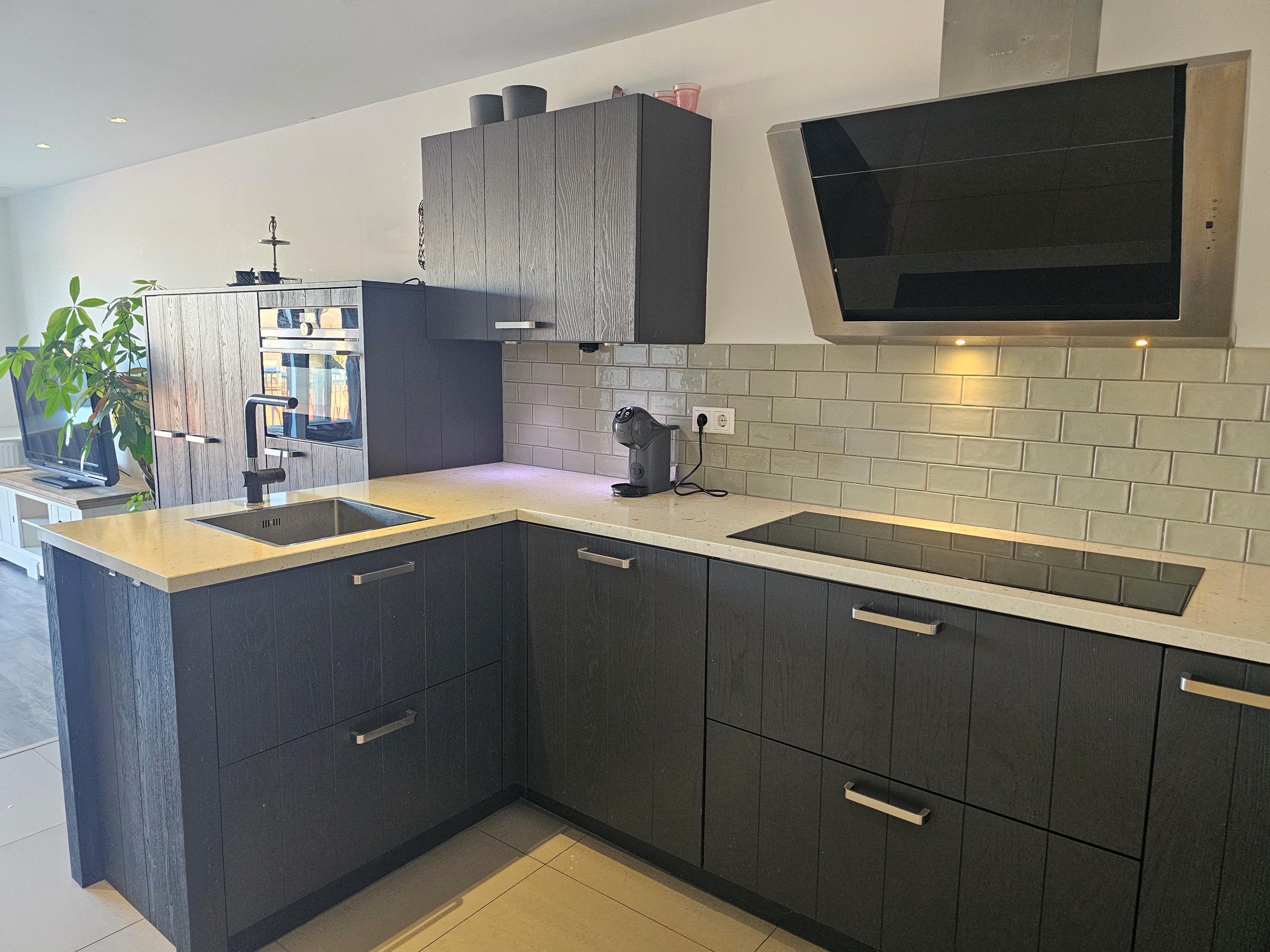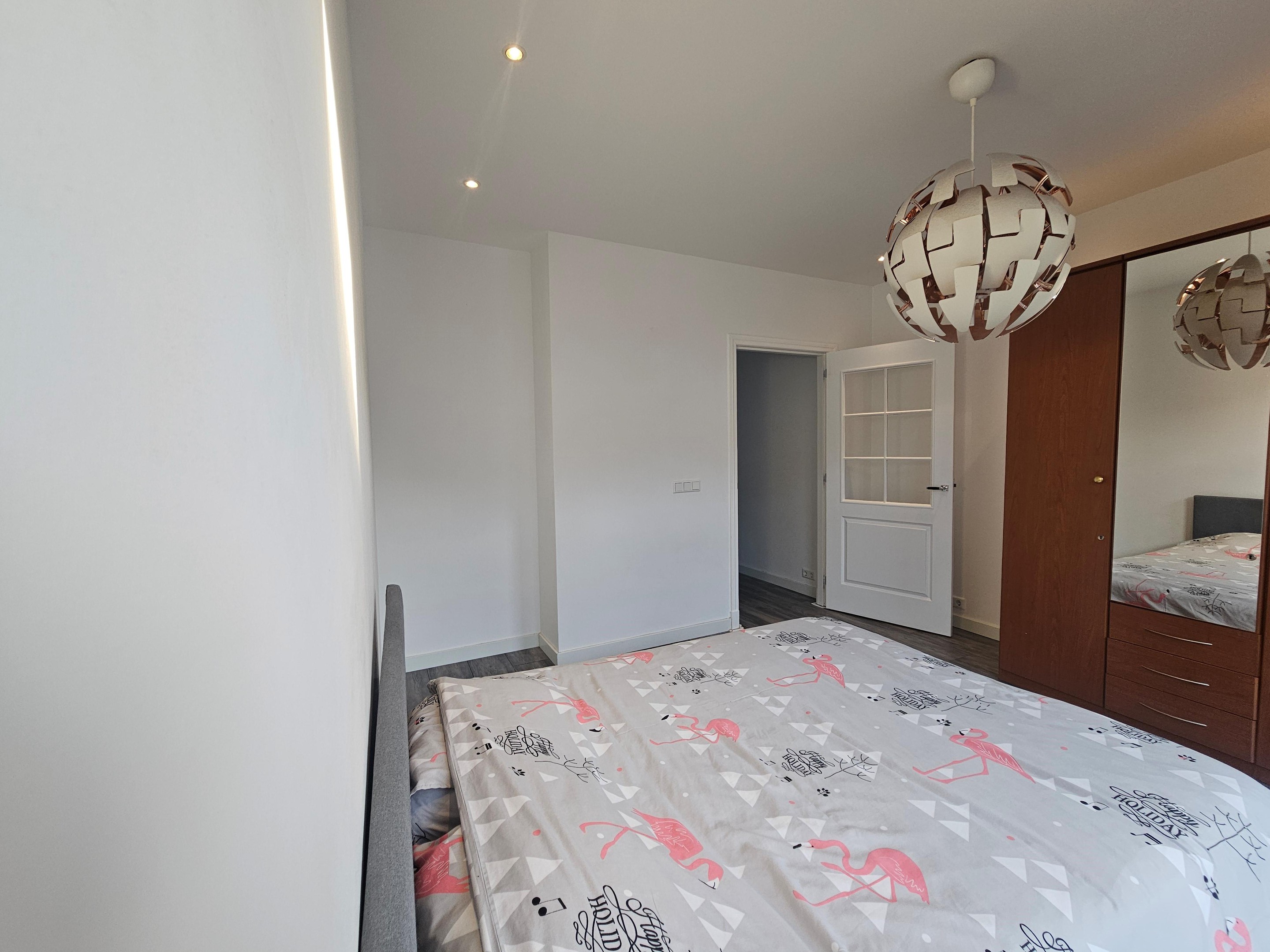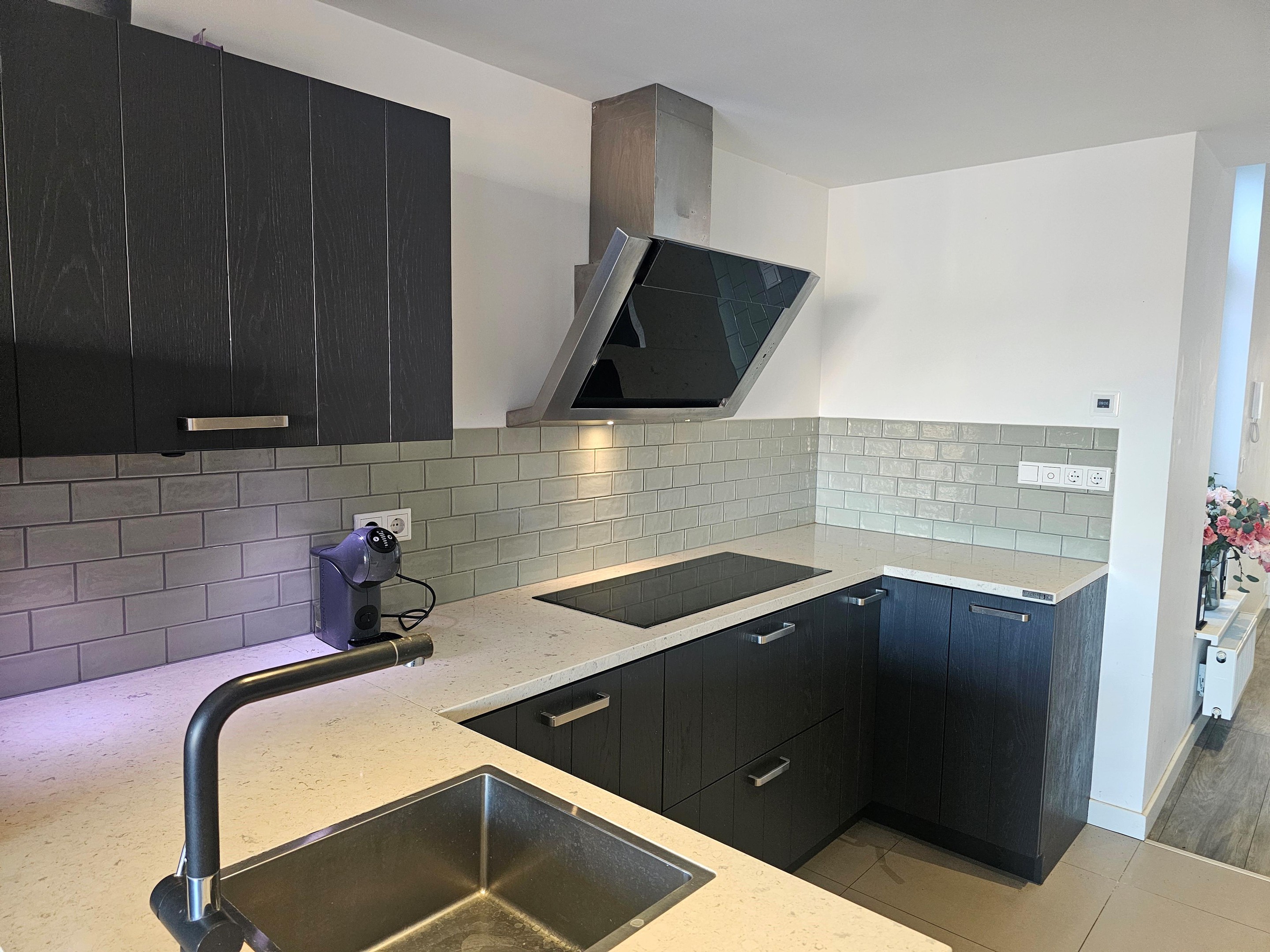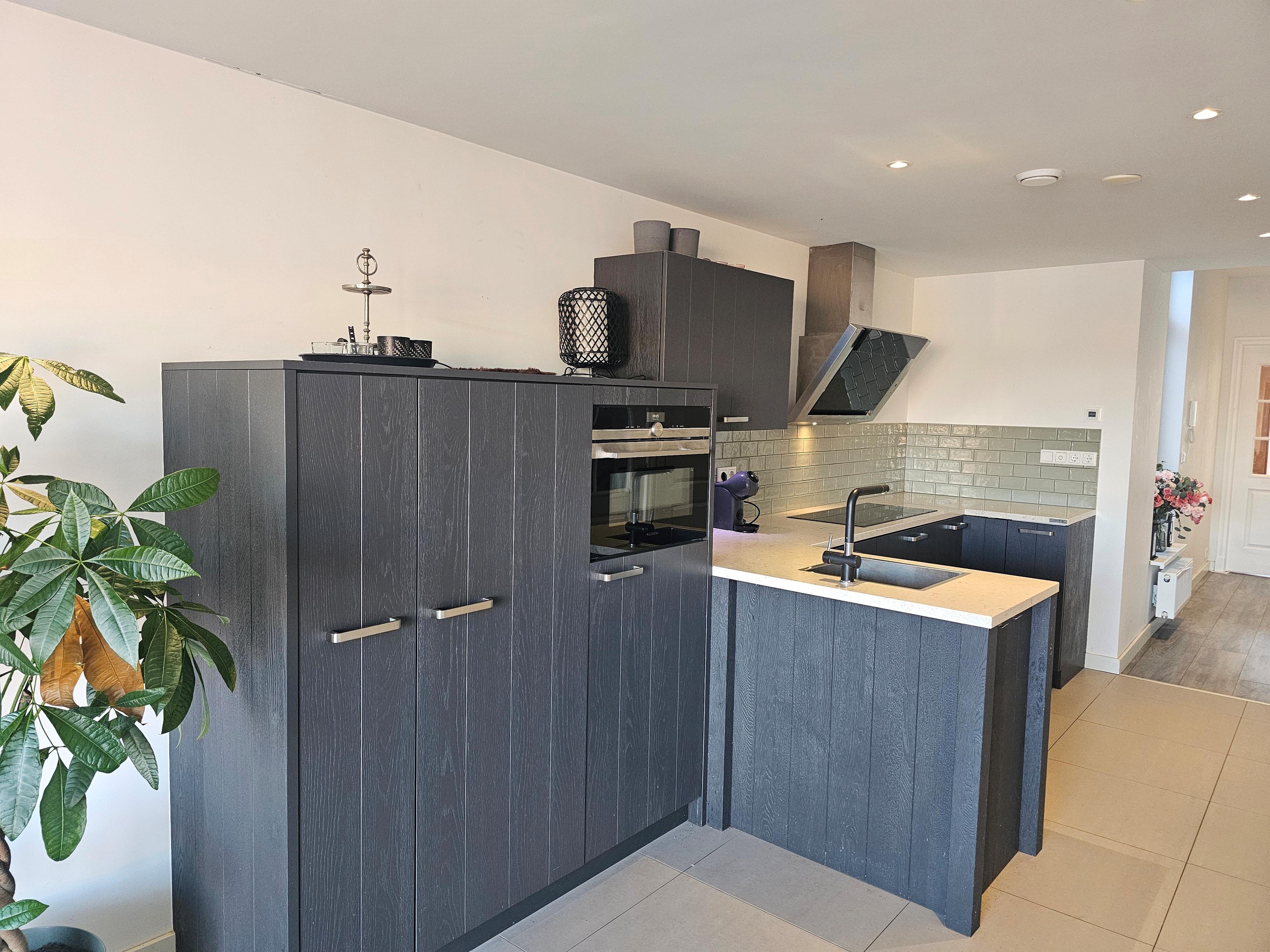 Hal, woonkamer met aangrenzend dakterras, een luxe keuken met inbouwapparatuur, badkamer met douche, wastafelmeubel, toilet, 2 slaapkamers