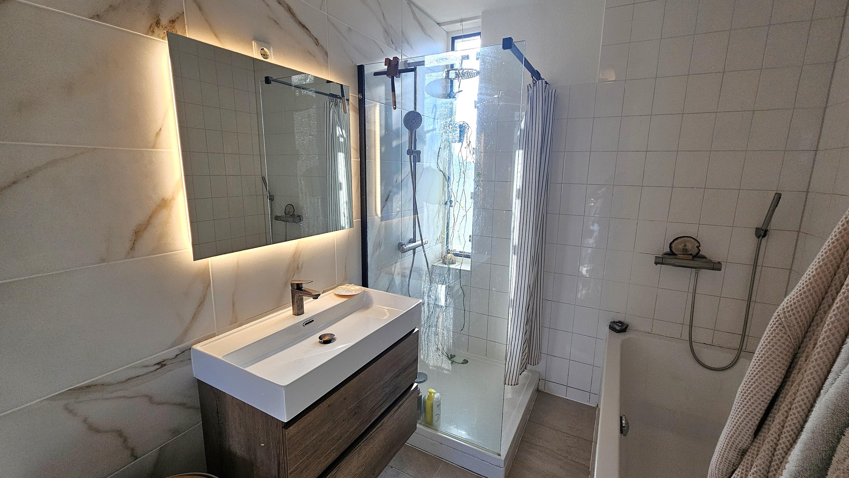 De moderne badkamer beschikt over een inloopdouche, ligbad, wastafel en tweede toilet. Op de overloop bevindt zich een ruime bergkast waarin zowel de wasmachine als de cv-installatie zijn geplaatst.
