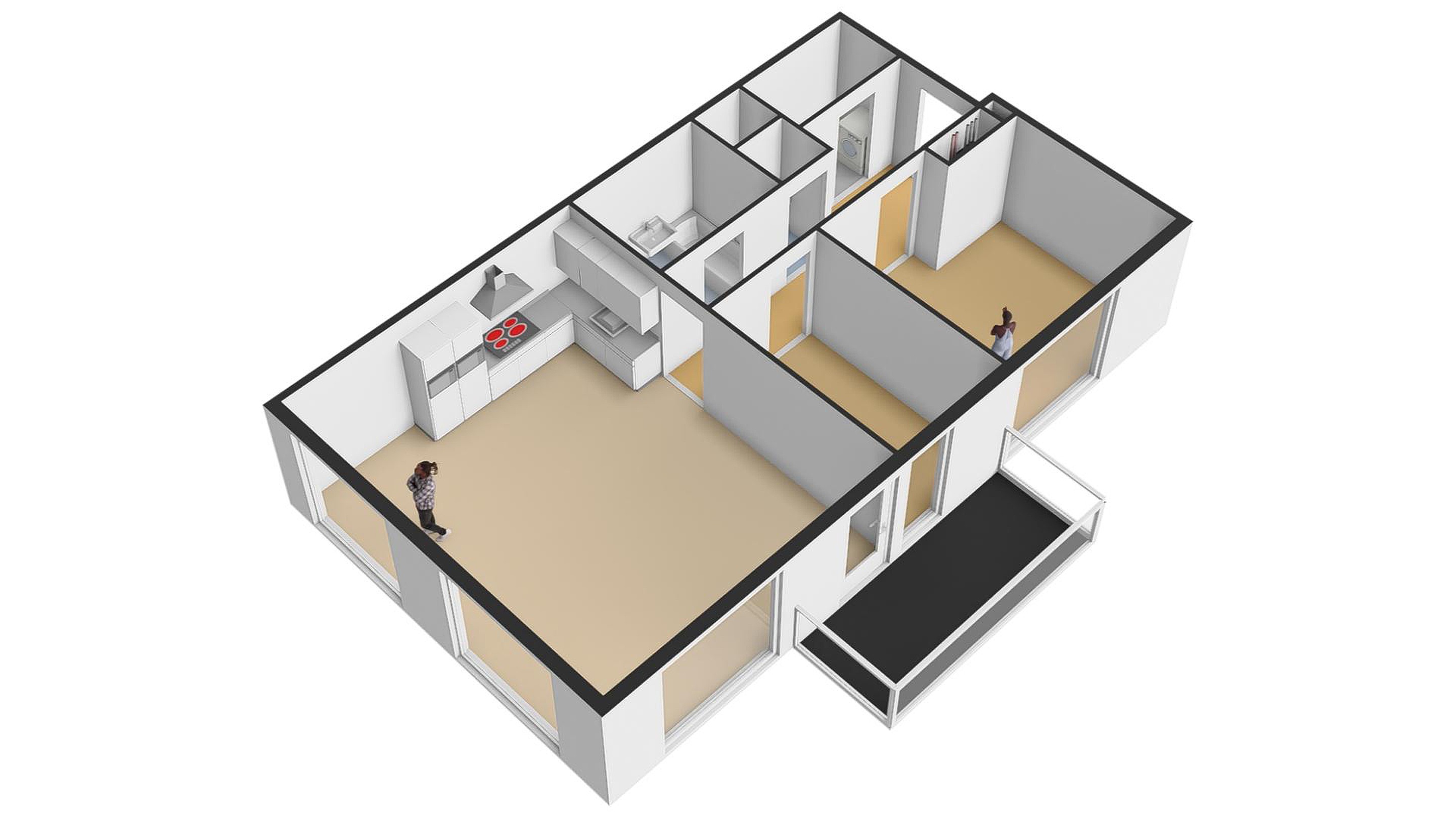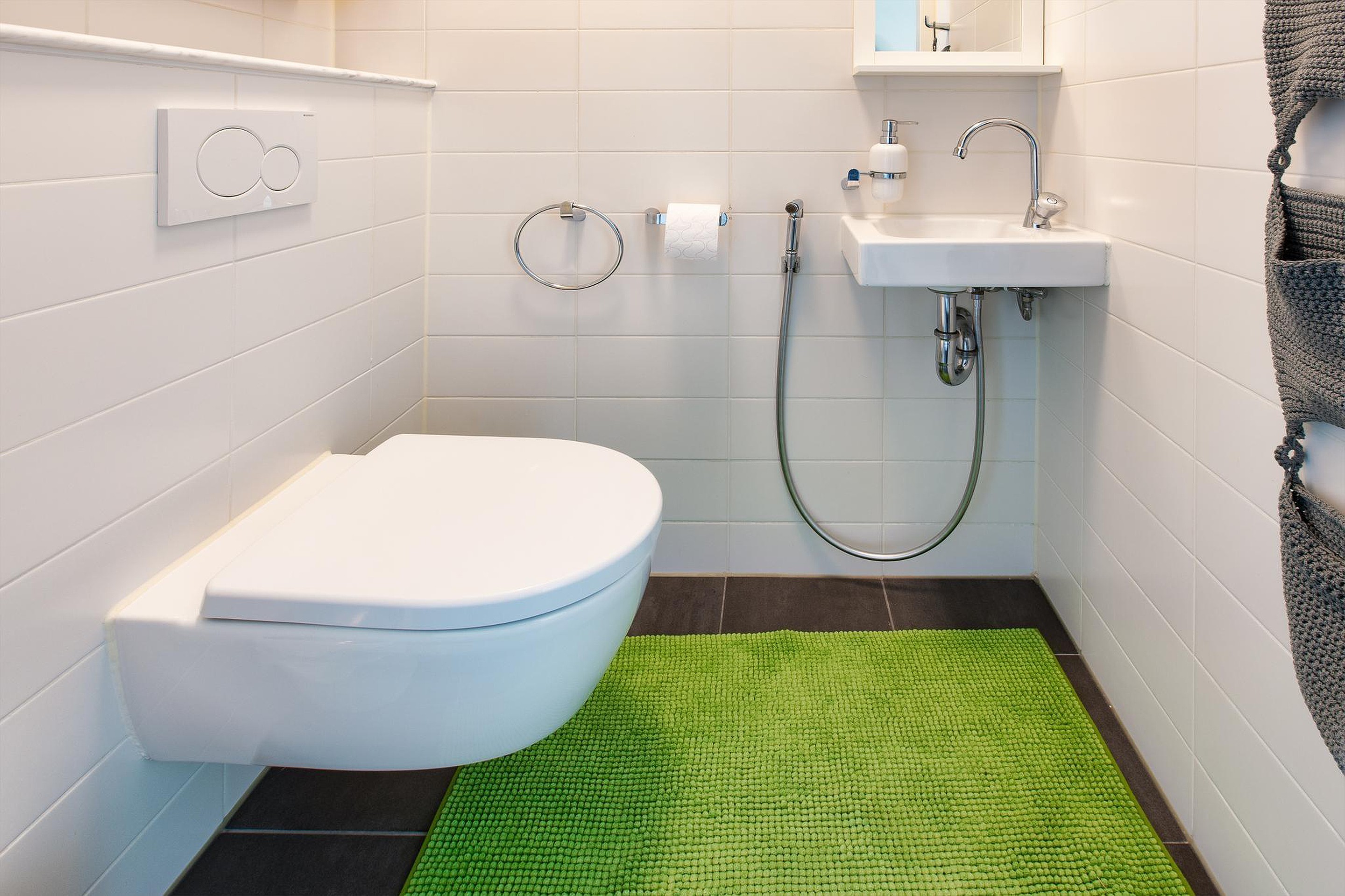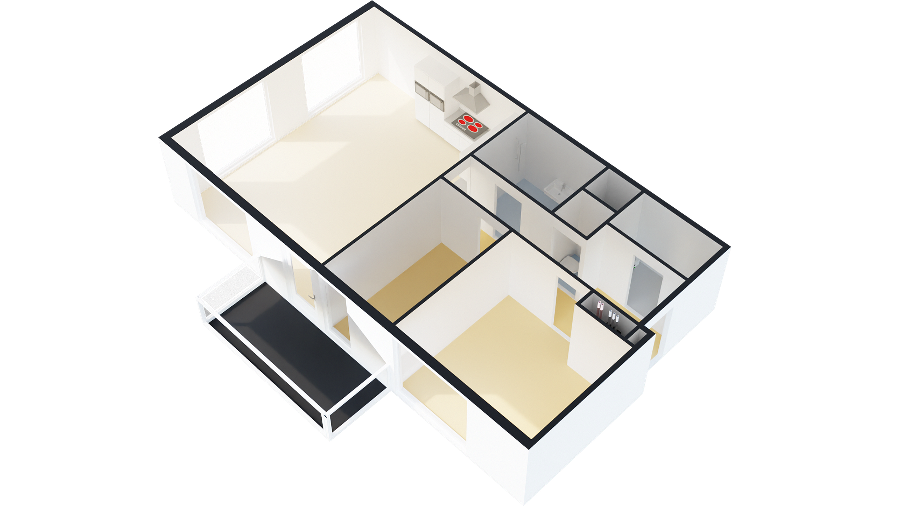 * Aan de rechterzijde bevinden zich de badkamer, het toilet en een technische ruimte voor wasmachine en mechanische ventilatie.