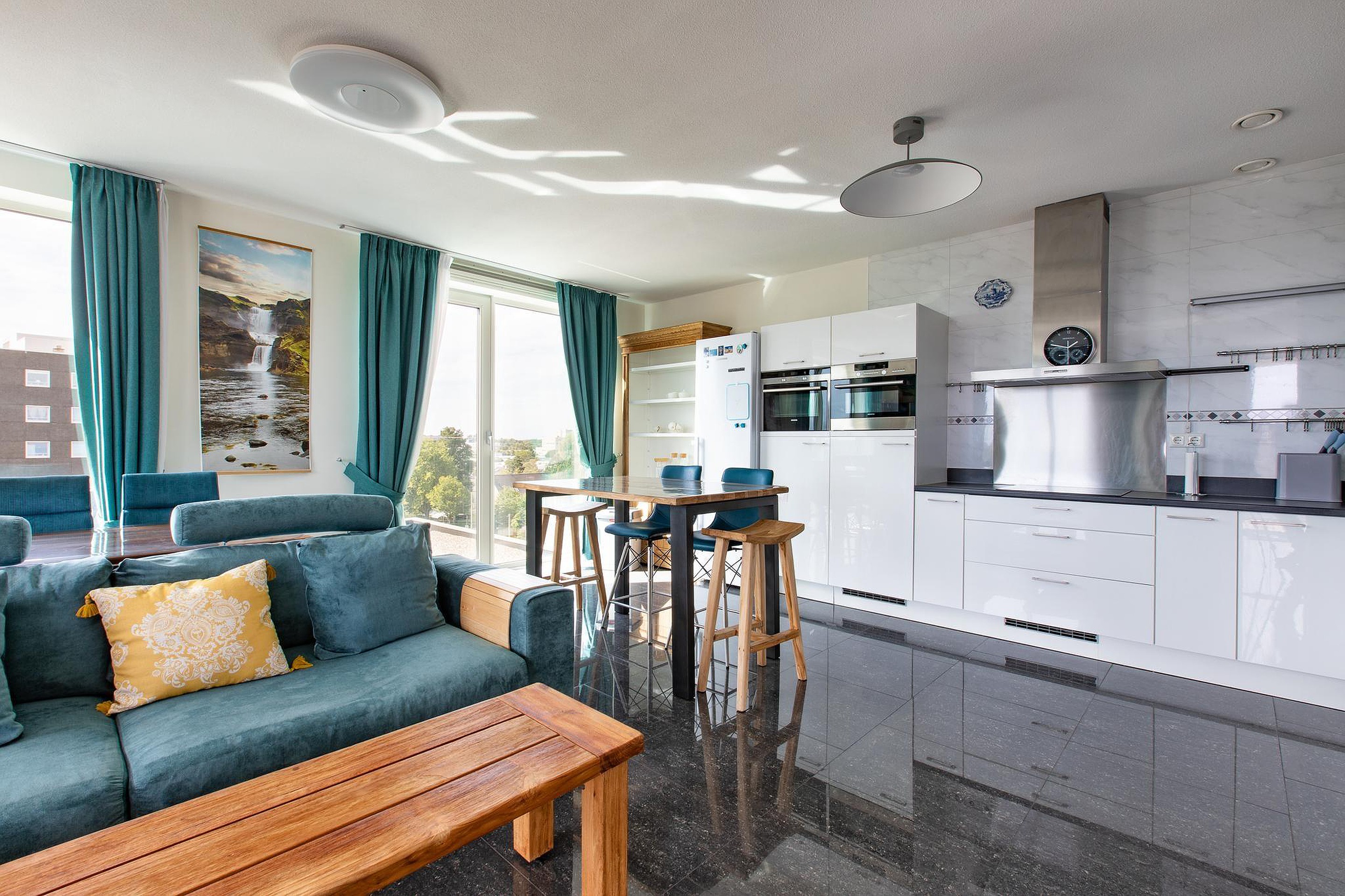 * Aan het einde van de gang bevindt zich de riante woonkamer/open keuken van in totaal 43m2. Veel licht valt de woonkamer binnen, dankzij de de hoekligging van het appartement.