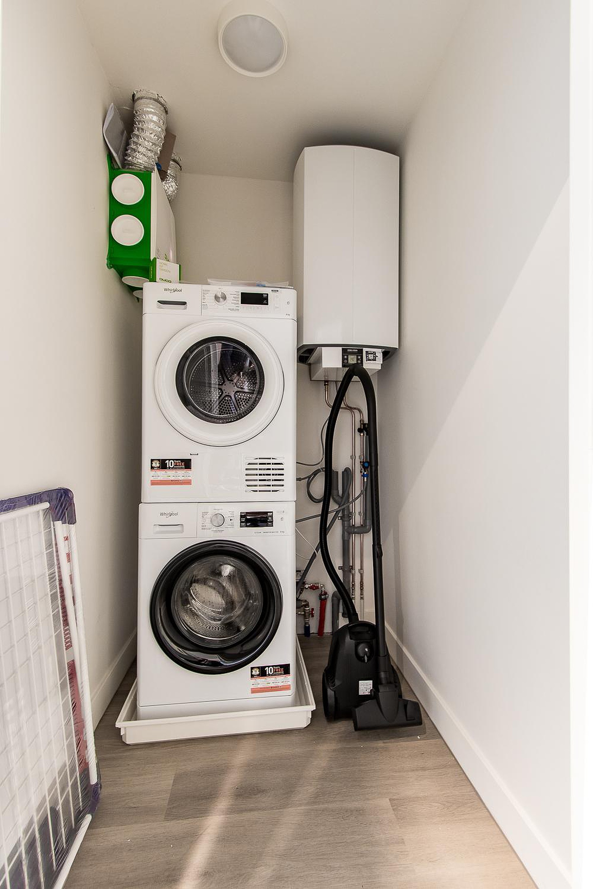 There is also a washing machine and dryer. The bathroom has a walkin shower and washbasin and toilet. At the backside of the apartment is the bedroom with a double bed and large wardrobe. There is also a desk.