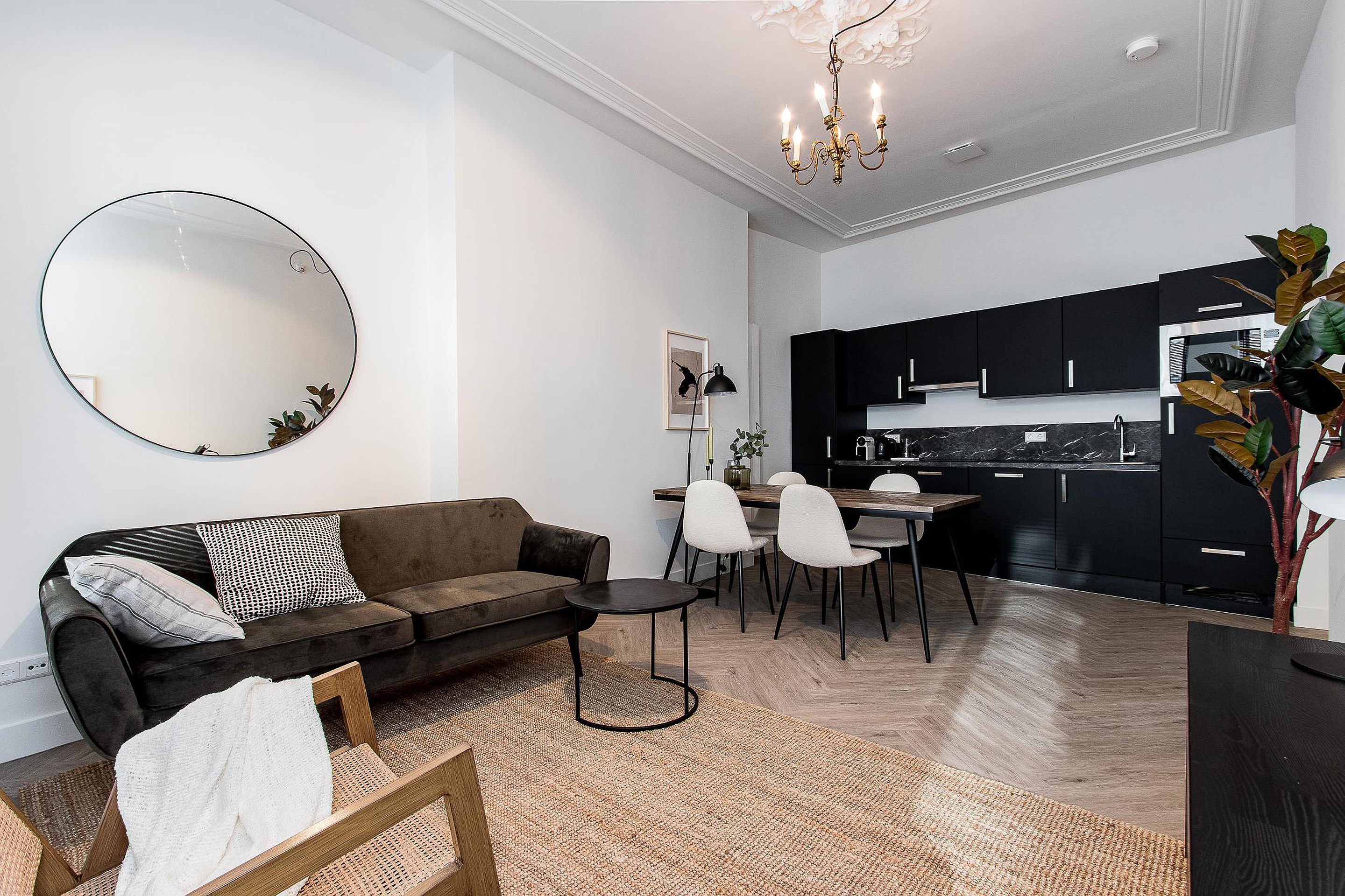 All apartments are equipped with flooring, curtains and new furniture. There is an fully equipped ed kitchen with fridge and freezer, diswasher, microwave and induction cooking. Dining area and sitting area. All furniture are brand new.