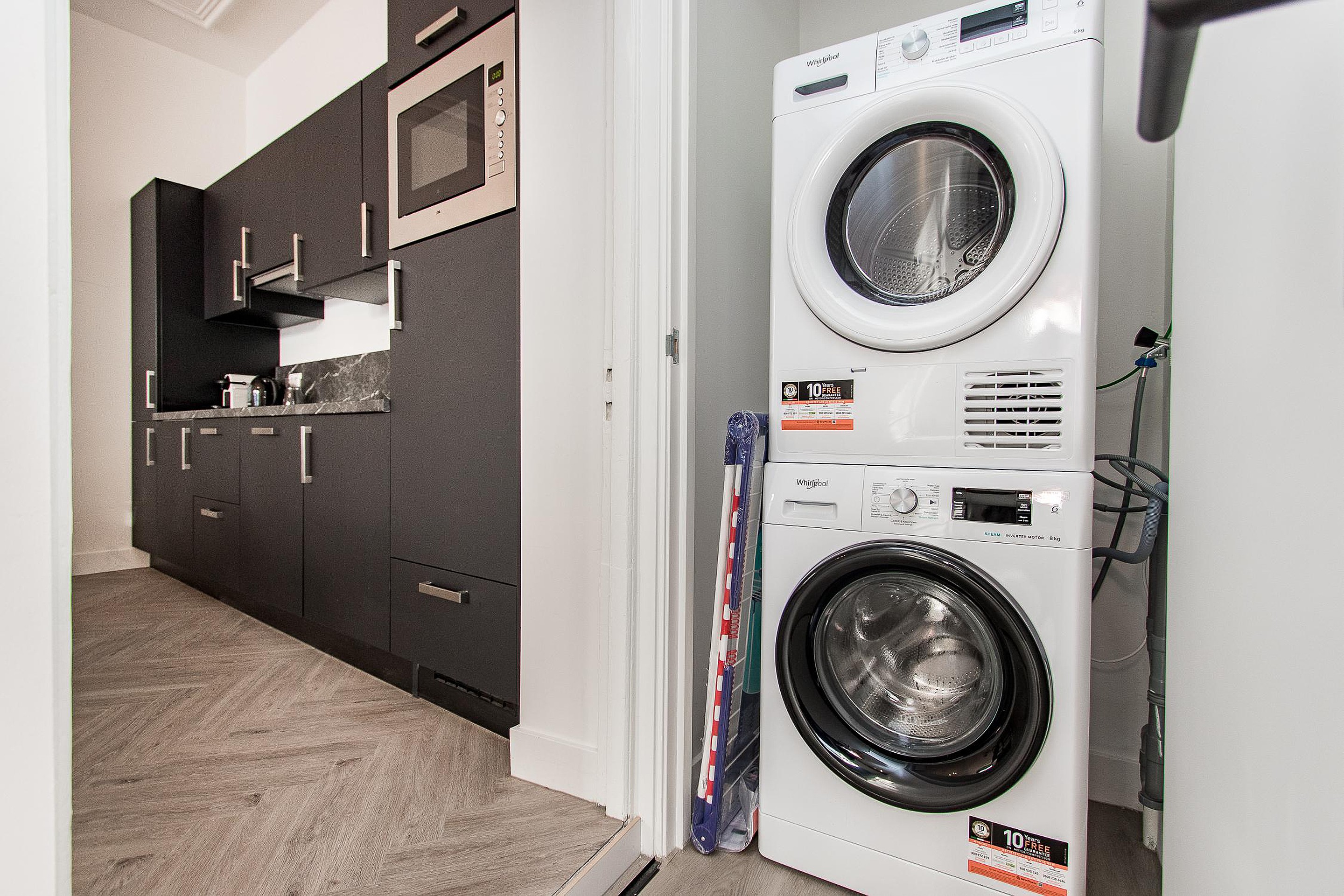 There is also a washing machine and dryer. The bathroom has a walkin shower and washbasin and toilet. At the backside of the apartment is the bedroom with a double bed and large wardrobe. There is also a desk.