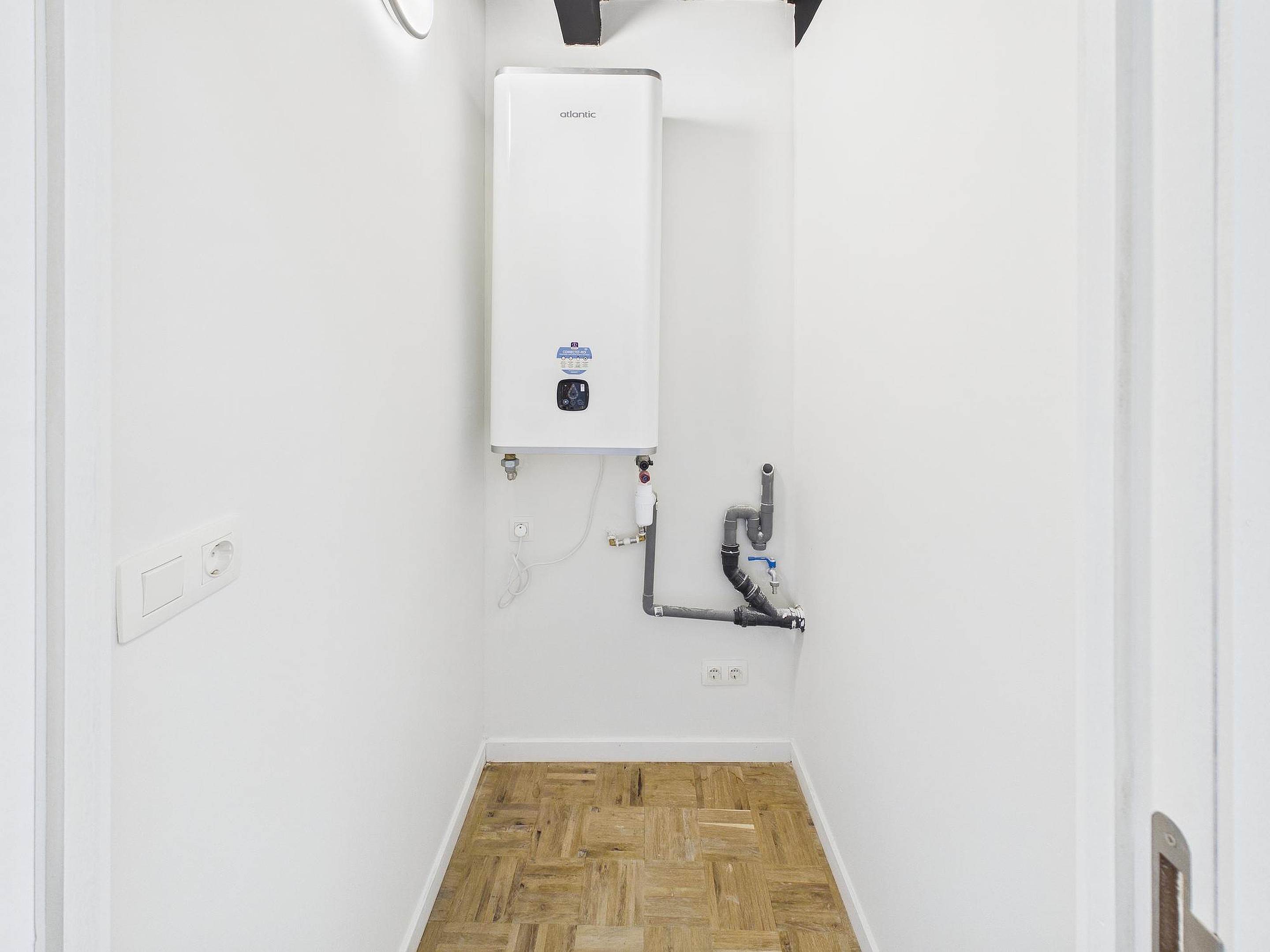 Inkomhal met toegang tot de woonkamer en keuken. De nieuwe keuken beschikt over alle benodigde inbouwapparatuur; een elektrische kookplaat, afzuigkap, oven en vaatwasser. Naast de keuken vind je een aparte toiletruimte en het cv-hok met hierin de aansluiting voor de wasmachine. Aan de voorzijde van het gebouw bevindt zich de slaapkamer met aansluitend de badkamer. De badkamer is volledig vernieuwd en beschikt over een inloopdouche en wastafel met meubel.