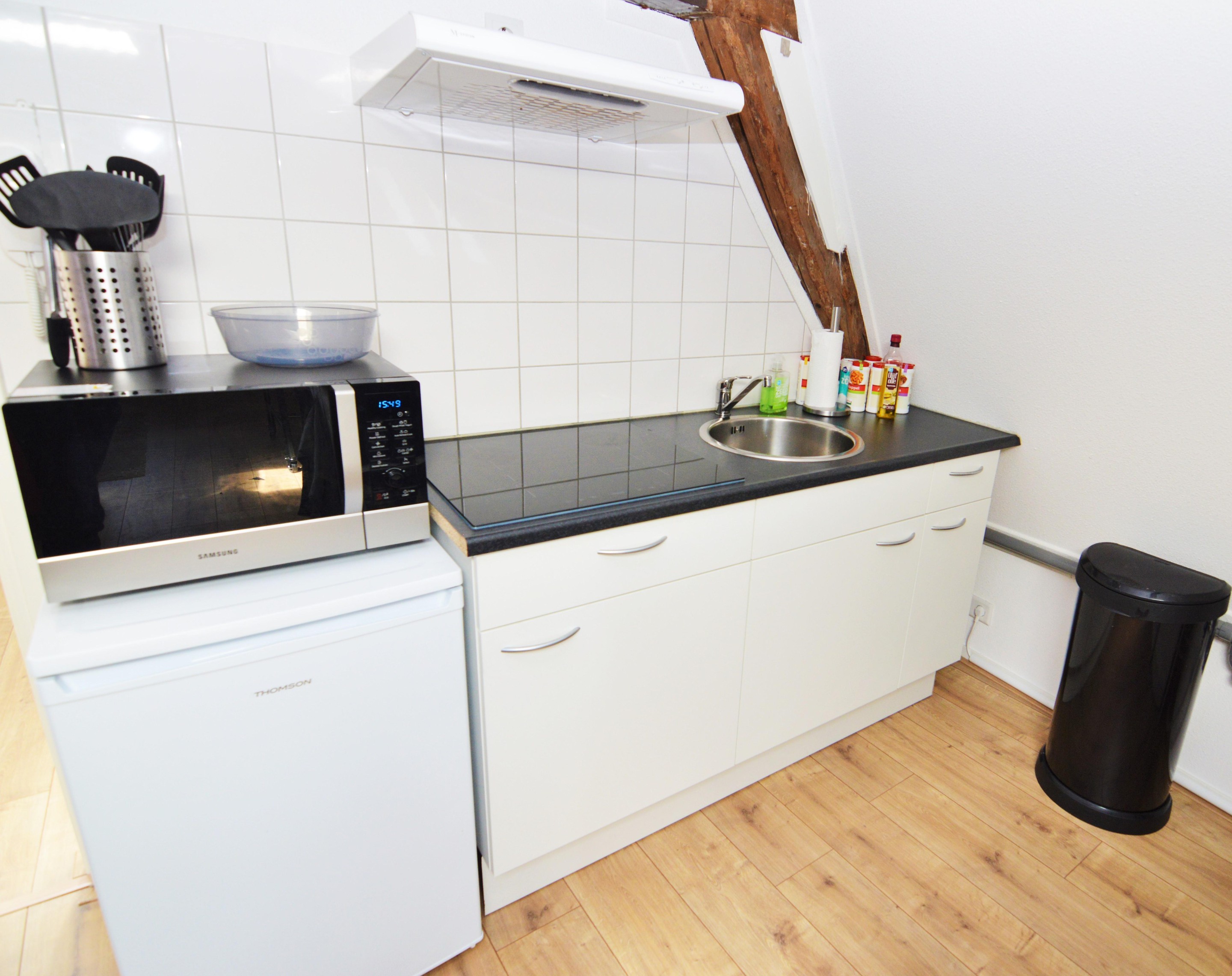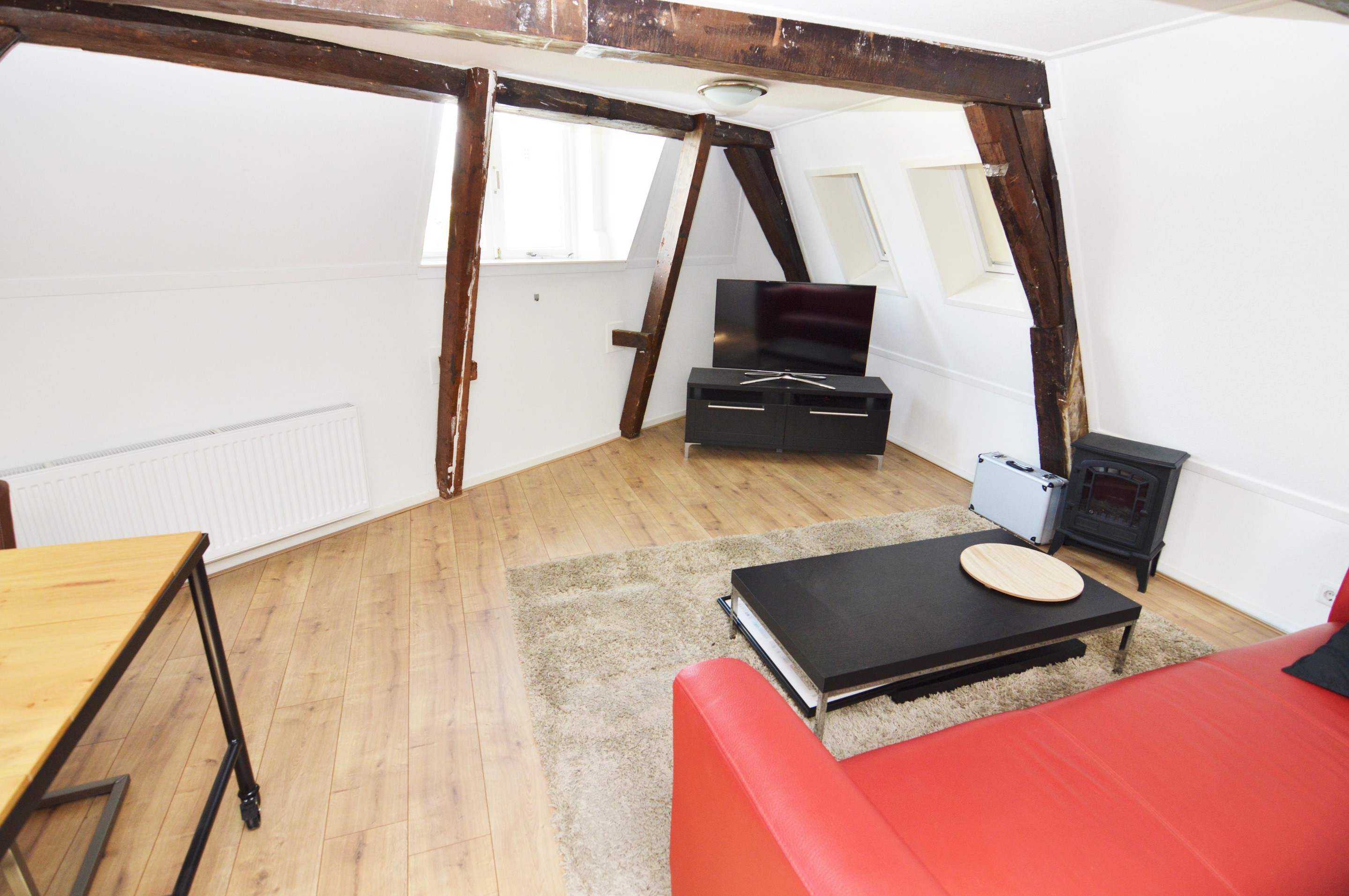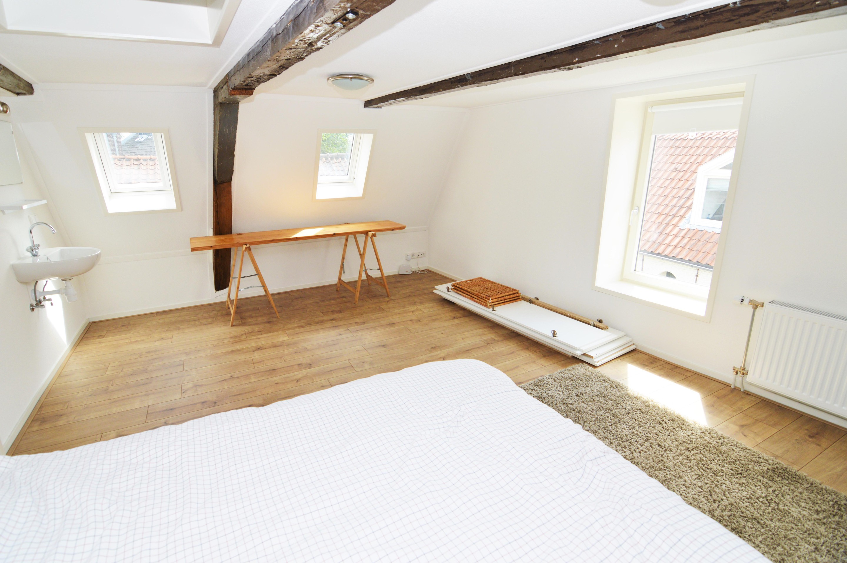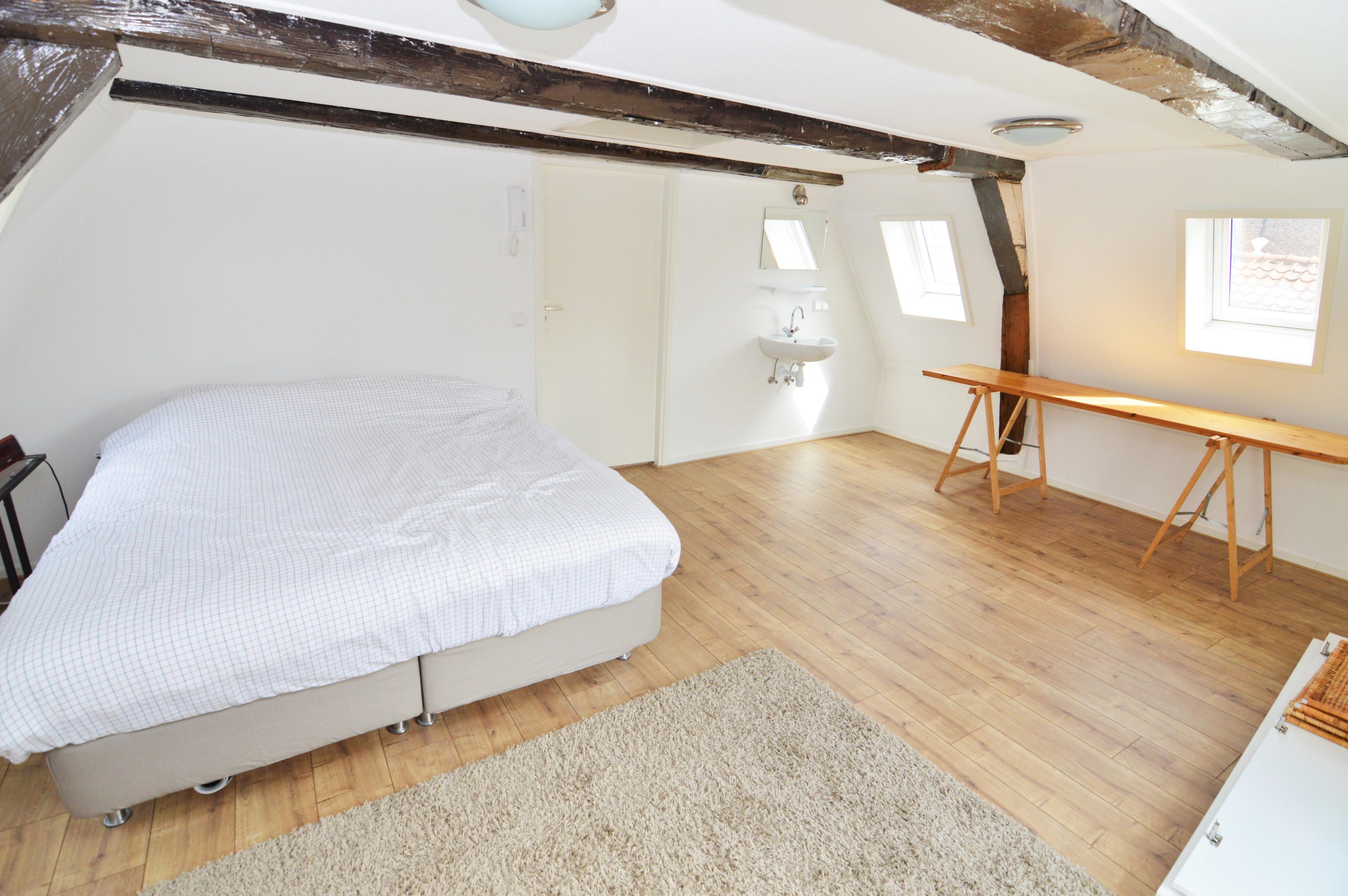 Main entrance with a secure door on a quiet side of Nieuwstad, a shared outdoor area for bicycles, and a sturdy staircase leading to the front door. Entrance hall (entrance is shared) with access via the internal staircase to the private hallway on the second floor. From here, there is access to the living room, bathroom, toilet, wardrobe, and spacious bedroom. The entire apartment features many charming nooks and crannies thanks to the sloping roof, natural light through various windows, and the traditional beams. This makes the living room with a canal view a cozy space with an open-plan kitchen. The kitchen is equipped with a refrigerator, electric stove, and extractor hood. The entire house has beautiful laminate flooring (soundproof, commercial-grade flooring), and all windows are double-glazed and have sun-blocking sliding curtains. The bathroom and toilet were completely renovated two years ago.
