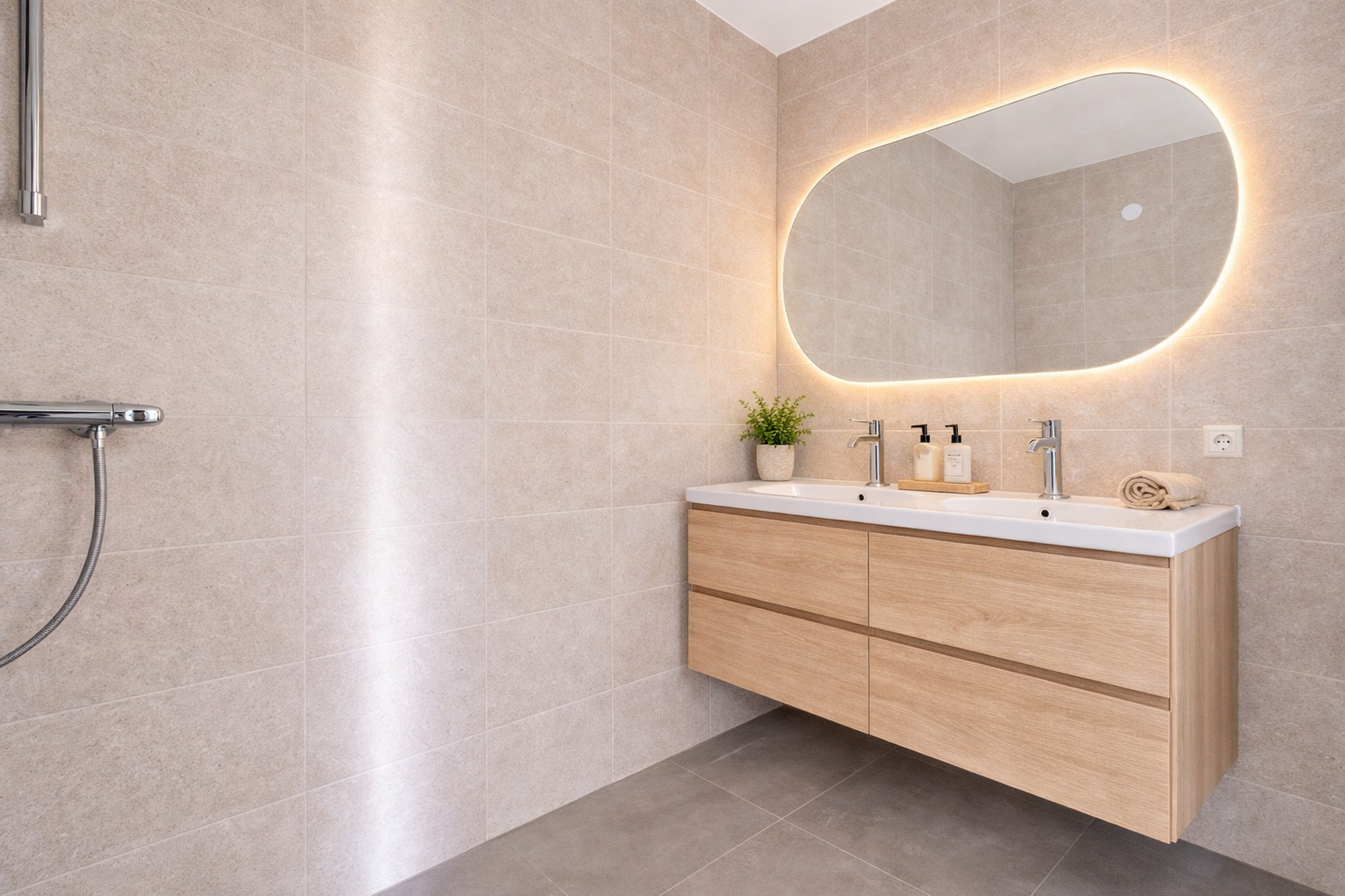 - Bathroom with shower and double sink