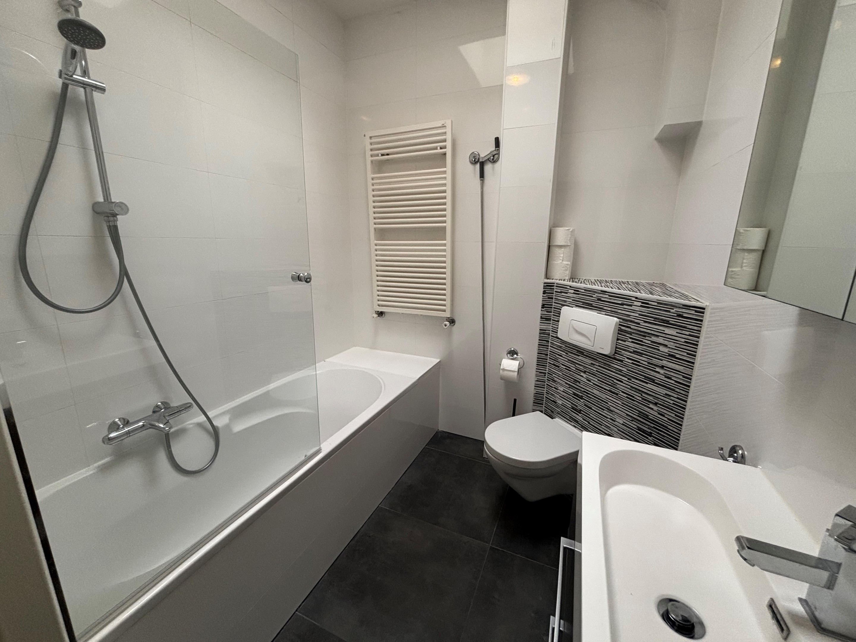 The bathroom is equipped with a bathtub, shower, toilet, and washbasin.