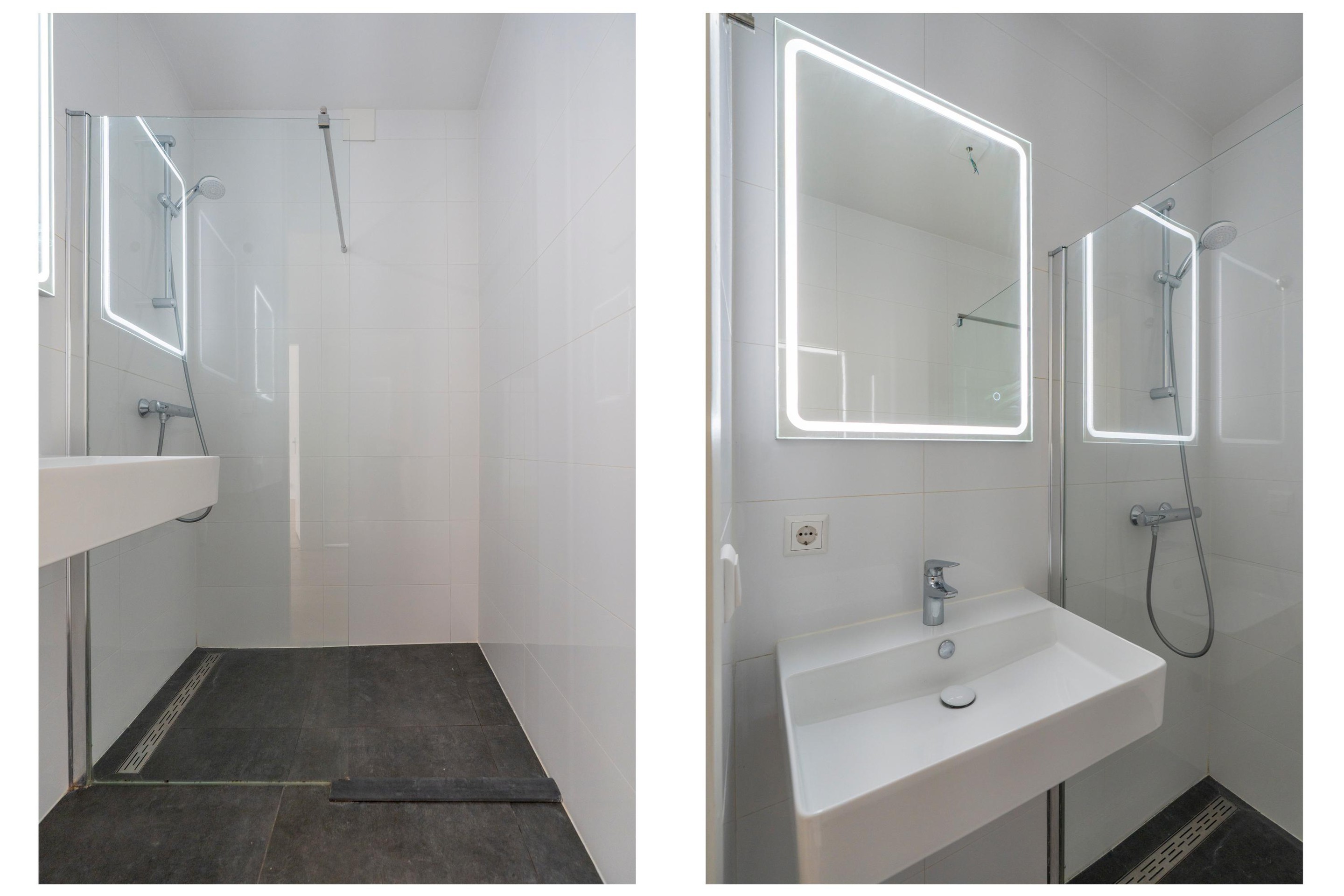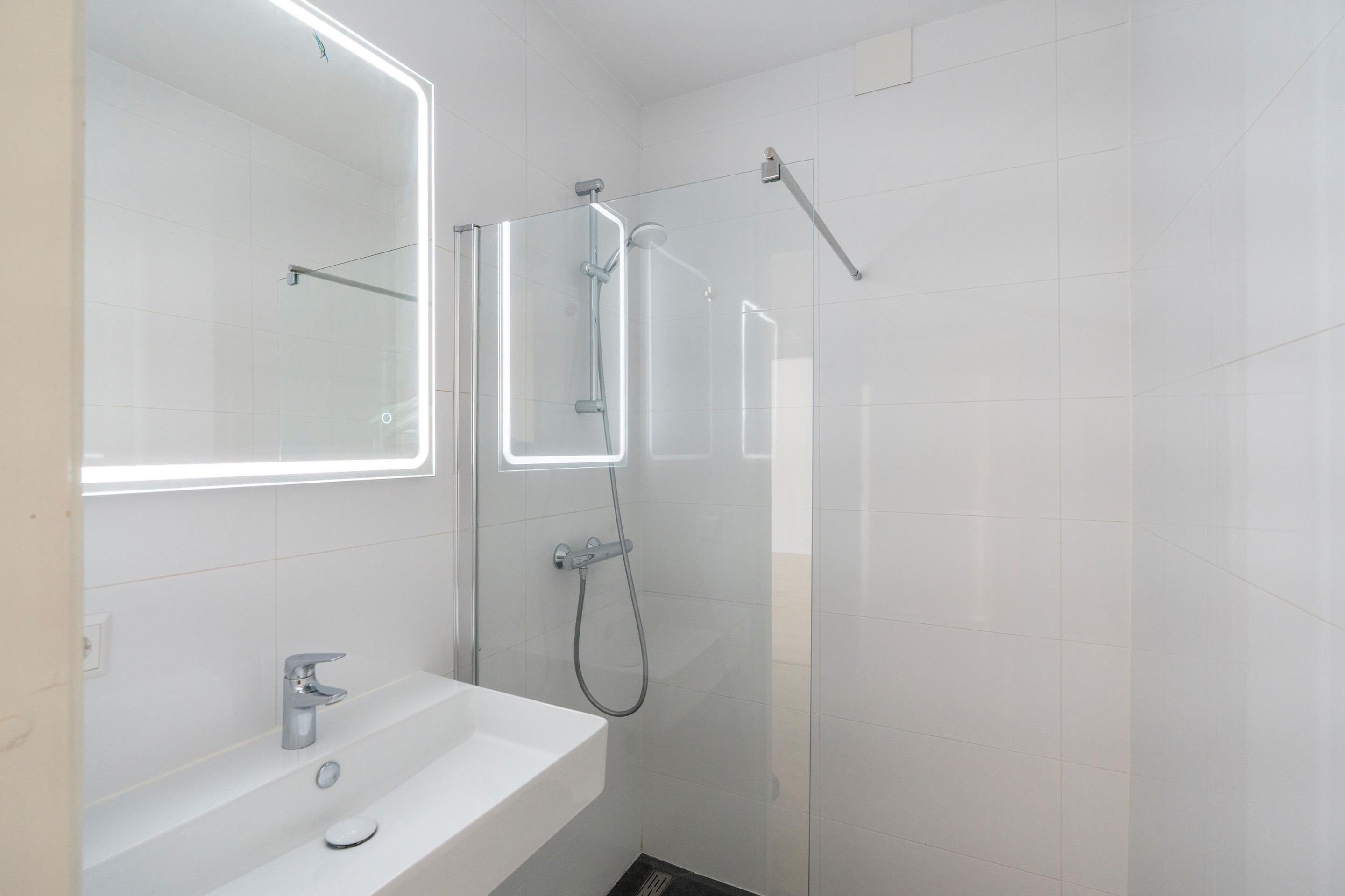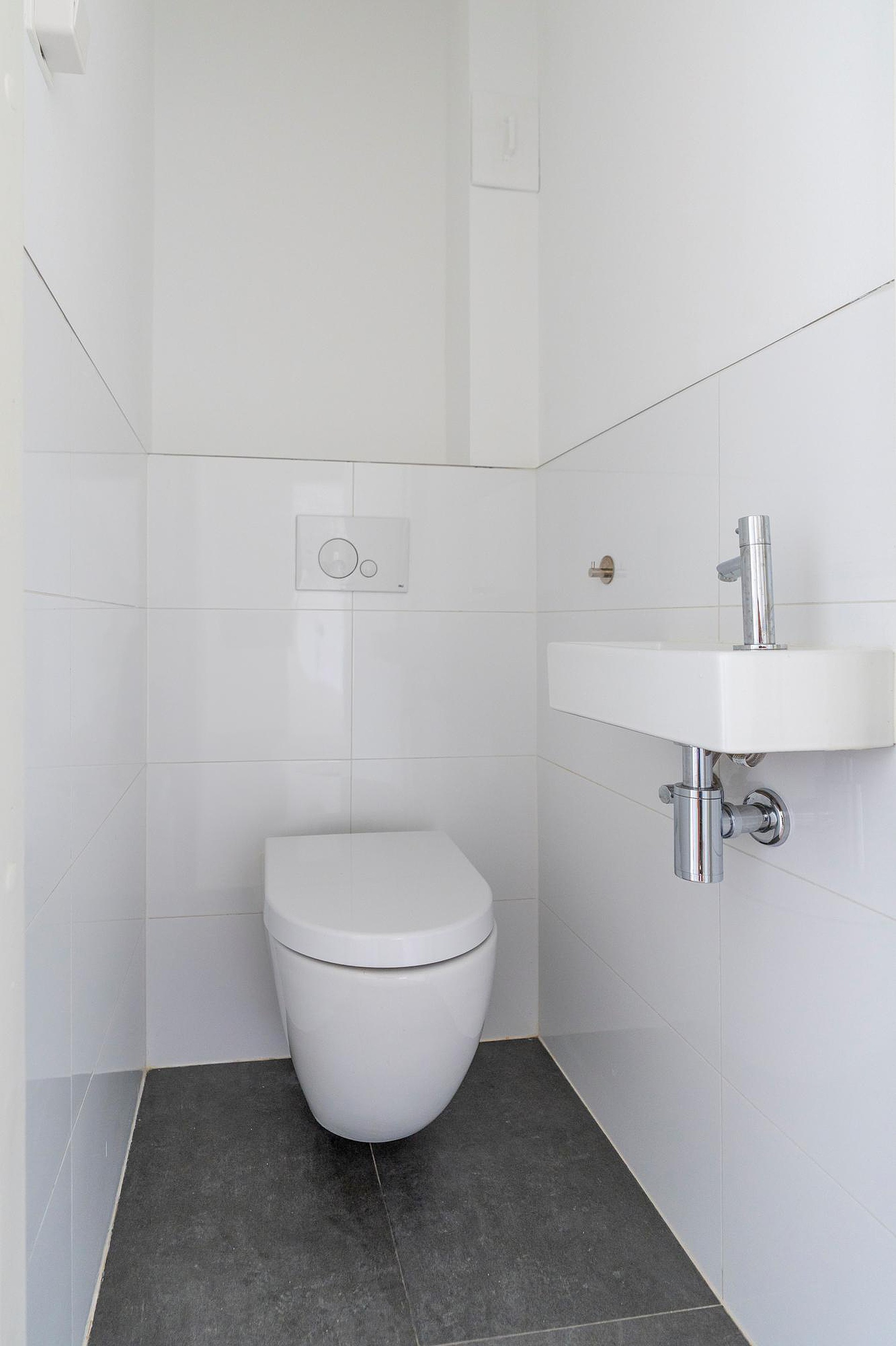 De badkamer beschikt over een inloopdouche en een wastafel. Het separate toilet met fontein is naast de badkamer gesitueerd.