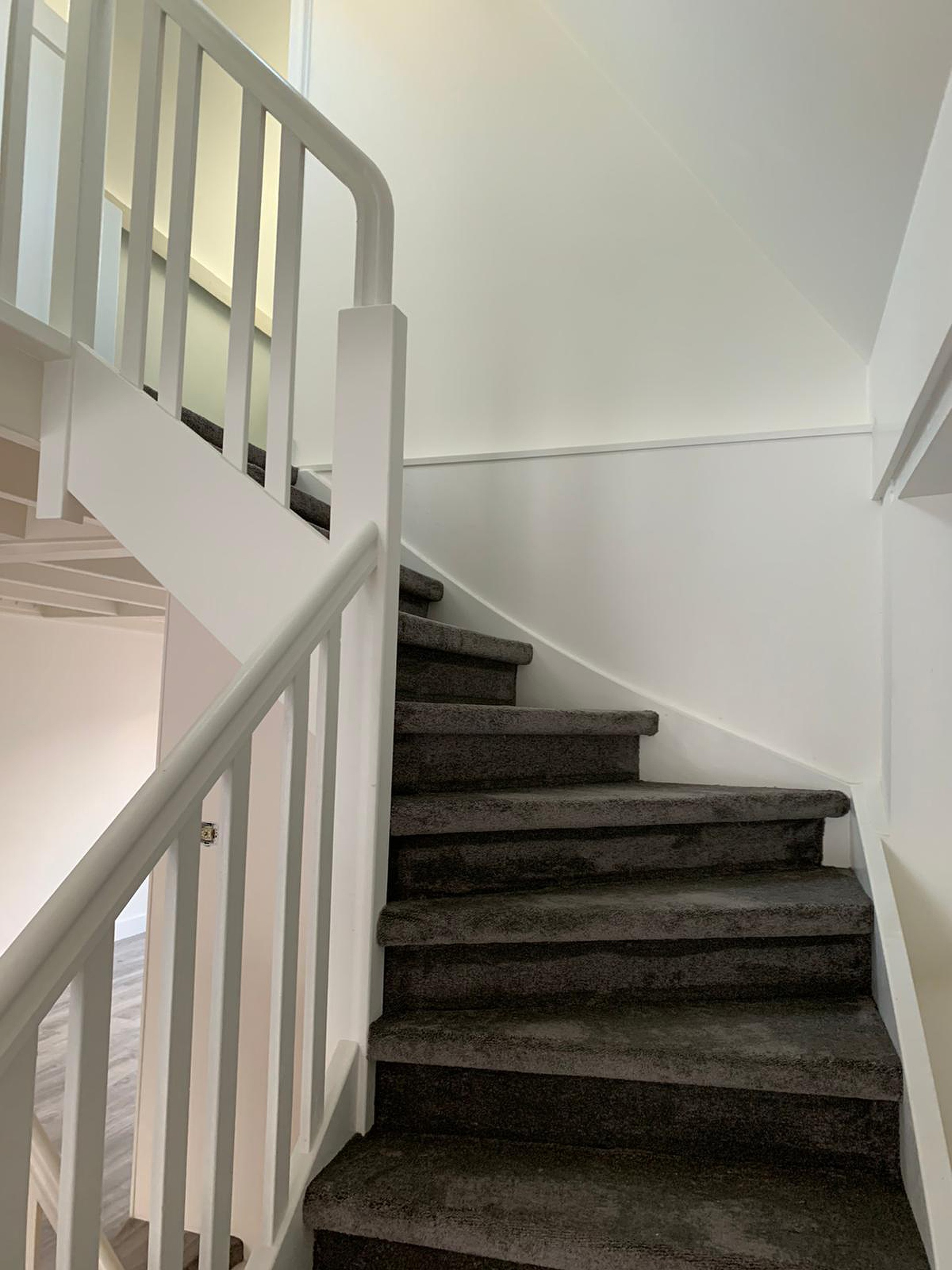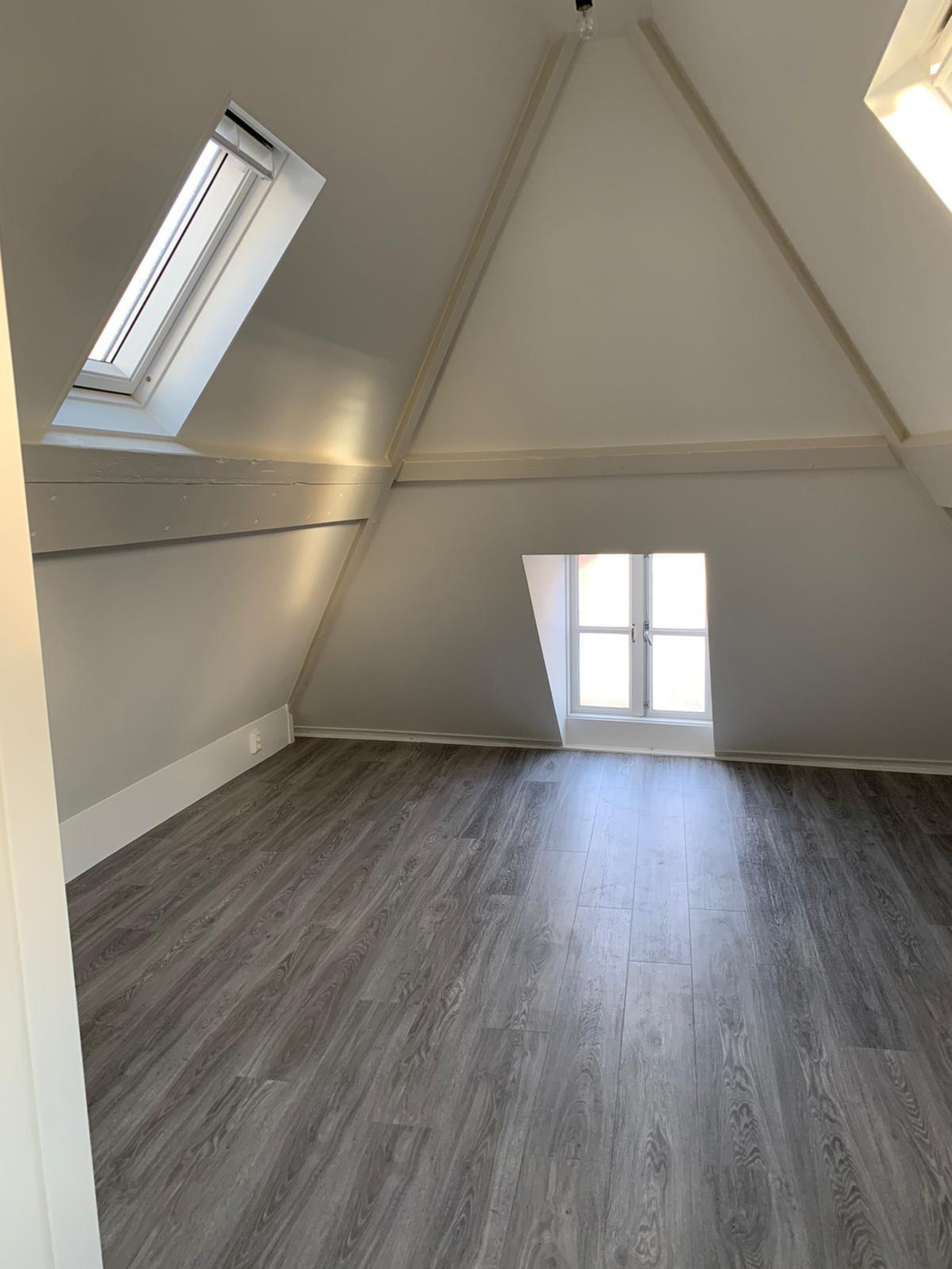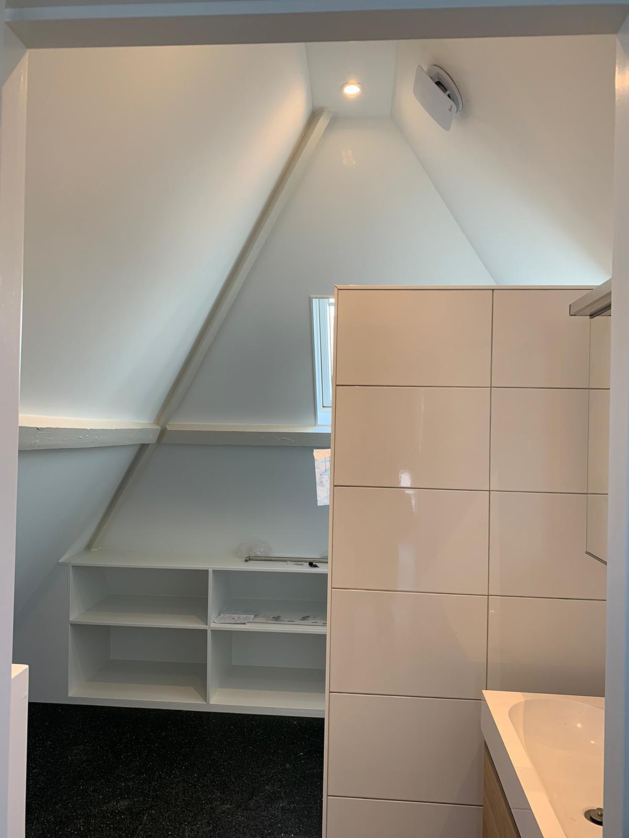 Trap naar 3 e verdieping waar onder de originele balkenlagen een slaapkamer is gesitueerd en de badkamer met tweede toilet, inloopdouche en wastafelmeubel. De slaapkamer is voorzien van Velux dakramen en volledig geïsoleerde kap.
