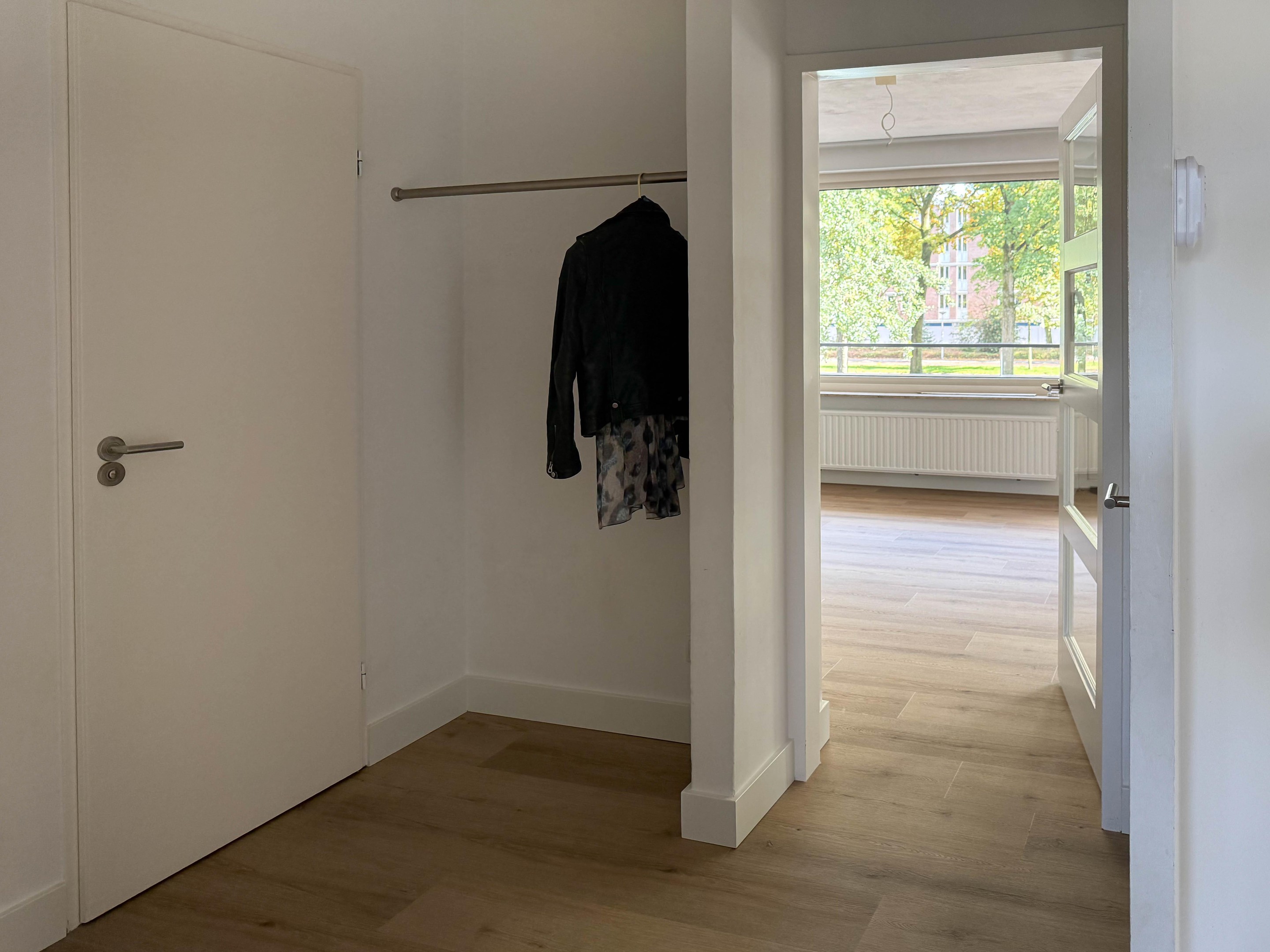 Entree, ruime hal, bergkast met CV opstelling, toiletruimte met vrijdragend closet en fonteintje, deur naar woonkamer, beneden verdieping, badkamer, slaapkamer en open verbinding naar keuken. De ruime woonkamer (40 m2) heeft grote raampartijen en een deur naar het voor balkon. De splinternieuwe keuken is gelegen aan de achterzijde en is voorzien van 4-pit gaskookplaat met wok-pit, RVS schouwkap, koelkast, vrieskast, vaatwasser, combi-oven, dubbel werkblad, diverse boven en onderkasten en spoelbak met mengkraan. Deur naar balkon aan achterzijde.