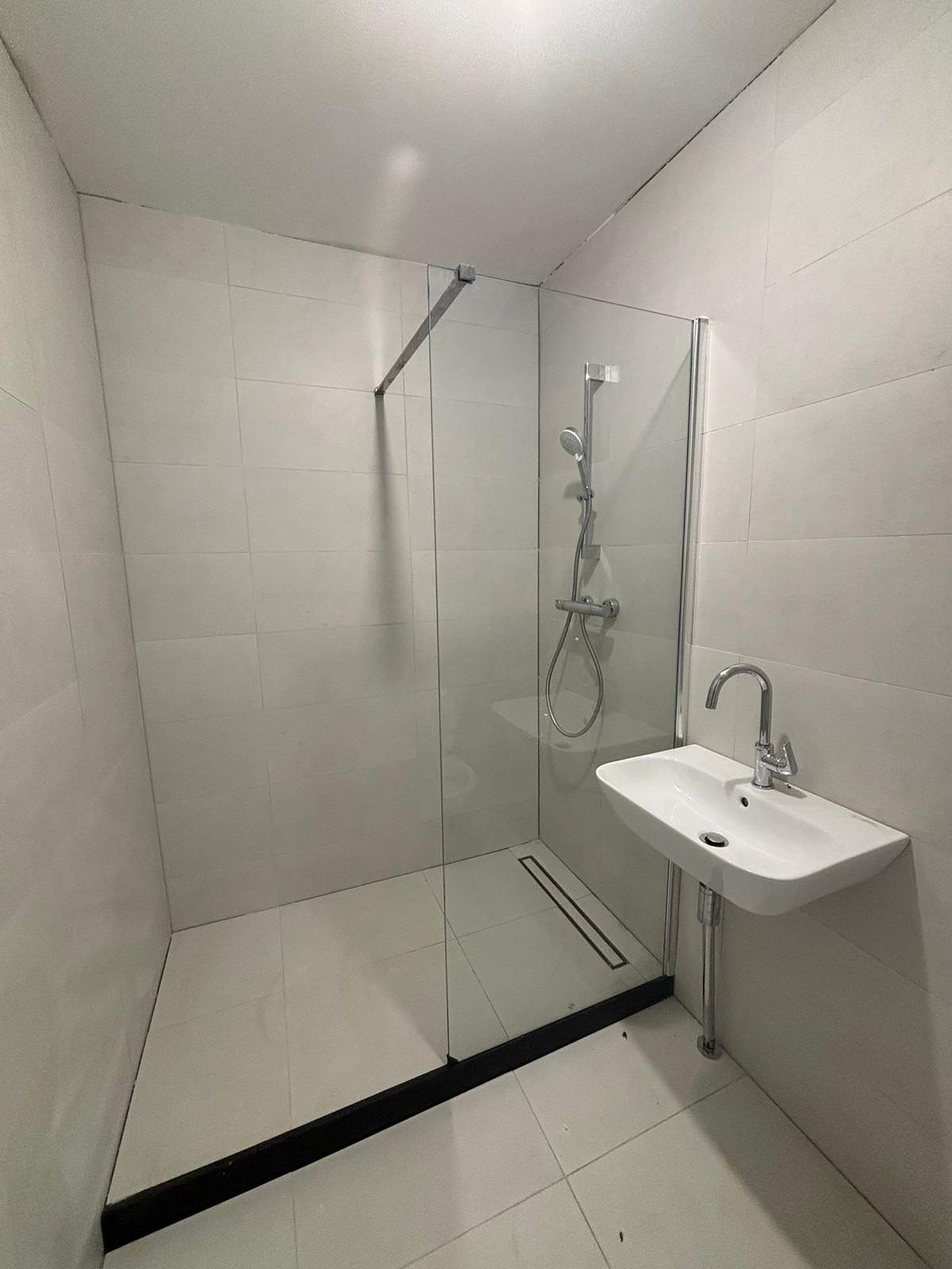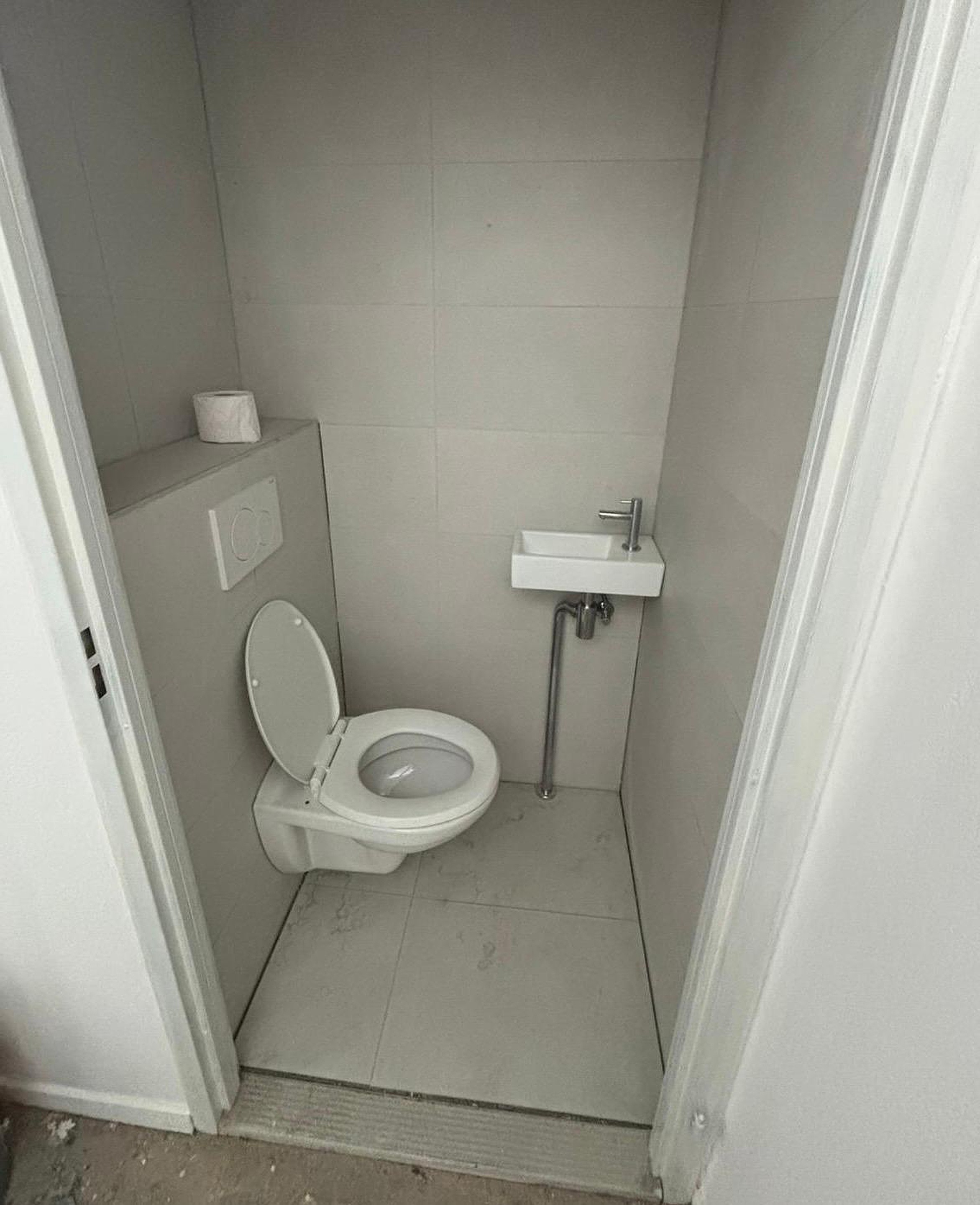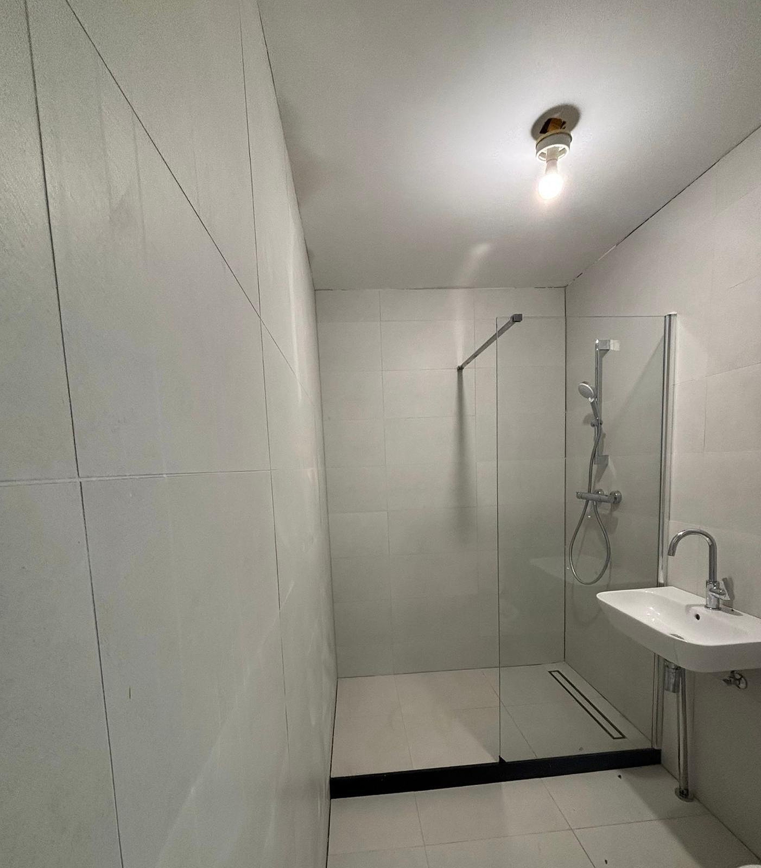De volledig nieuwe badkamer is ruim opgezet en beschikt over een inloopdouche, wastafel en een tweede toilet.