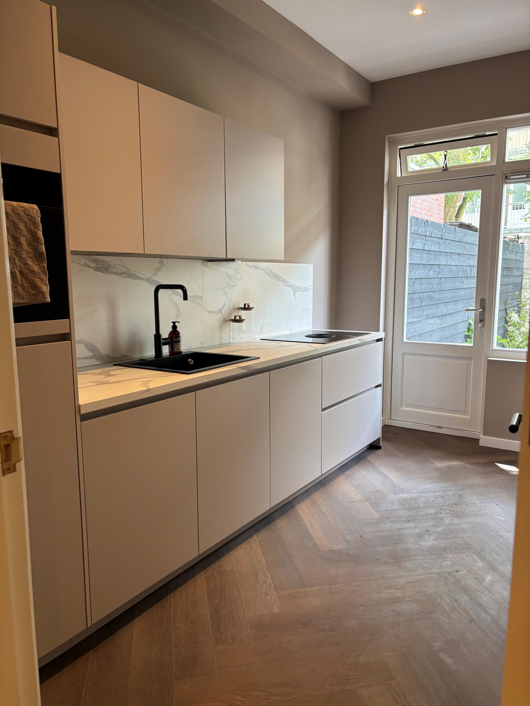 Begane grond: Eigen entree, hal. Aan de achterzijde bevindt zich de lichte en ruime woonkamer met grote ramen en directe toegang tot de fraai aangelegde tuin met een terras en grasmat, een heerlijke plek om te ontspannen of gezellig te dineren in de buitenlucht. De luxe half-open keuken is volledig voorzien van moderne inbouwapparatuur: een koelkast, vriezer, combi-oven magnetron, spoelbak, 4-pits inductiekookplaat met geïntegreerde afzuiging en een vaatwasser.