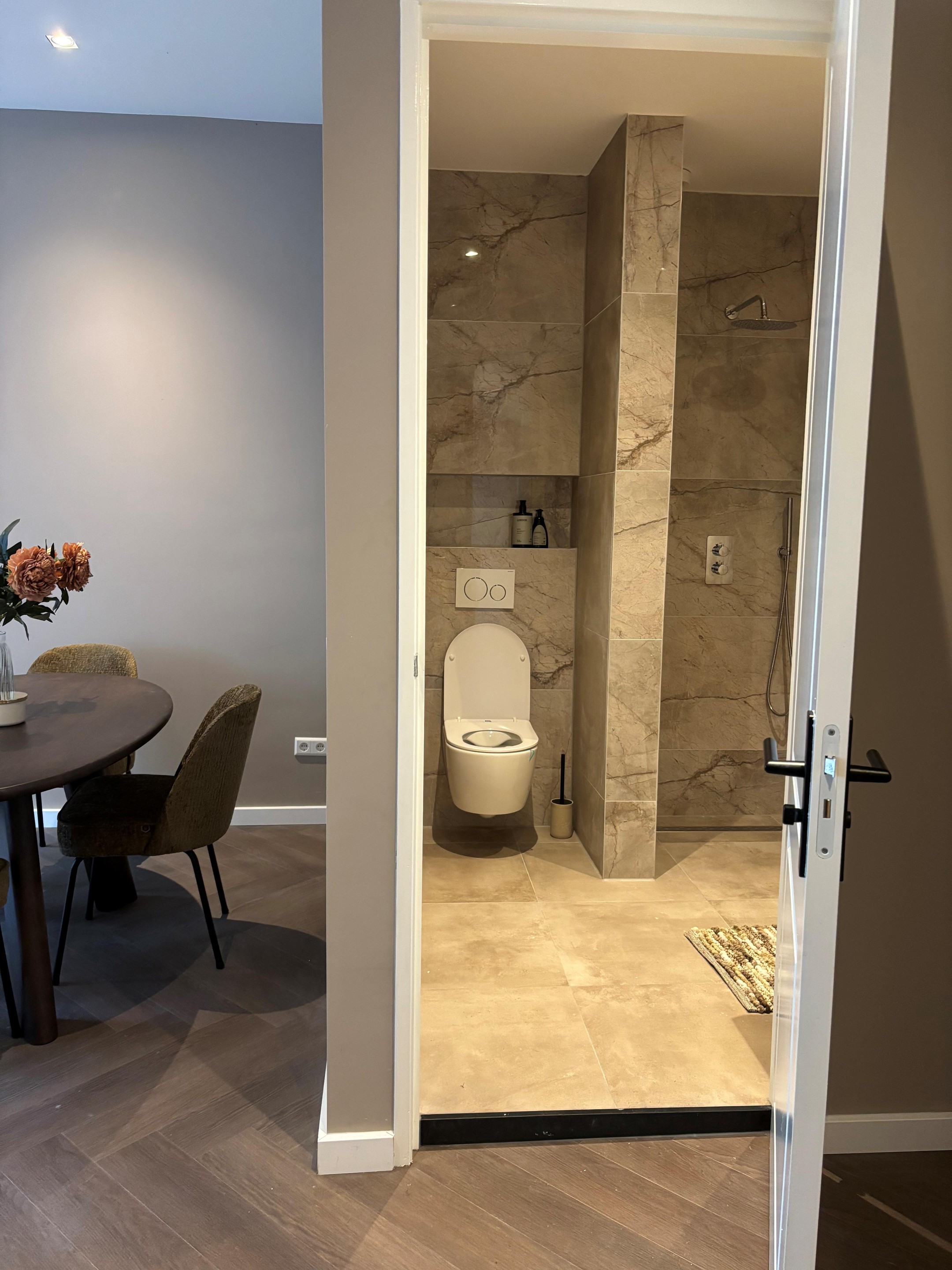 De master bedroom ligt aan de voorzijde van de woning en is ruim van opzet. Het bed zal aanwezig zijn, ook al is dit niet zichtbaar op de huidige foto’s. De moderne badkamer is voorzien van een luxe inloopdouche, wastafelmeubel, zwevend toilet en handoekenradiator. Daarnaast is er een aparte kast met wasmachine- en drogeraansluiting, mechanische ventilatie en een grote boiler voor warm water.
