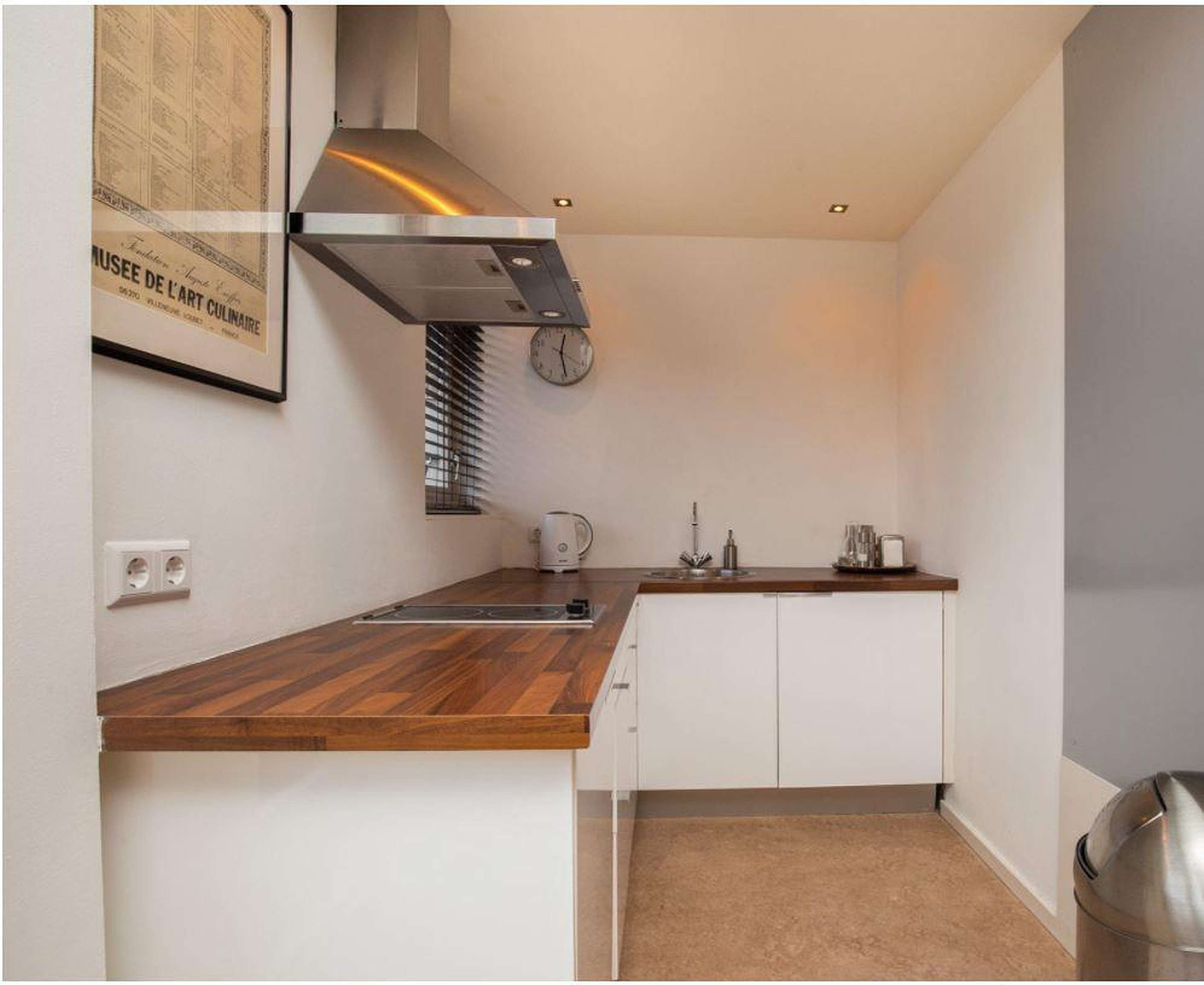 De woonkamer heeft grote ramen die zorgen voor veel natuurlijk licht en is voorzien van een moderne, halfopen keuken met greeploze kastfronten en diverse inbouwapparatuur: een vaatwasser, elektrische kookplaat, koelkast en afzuigkap.