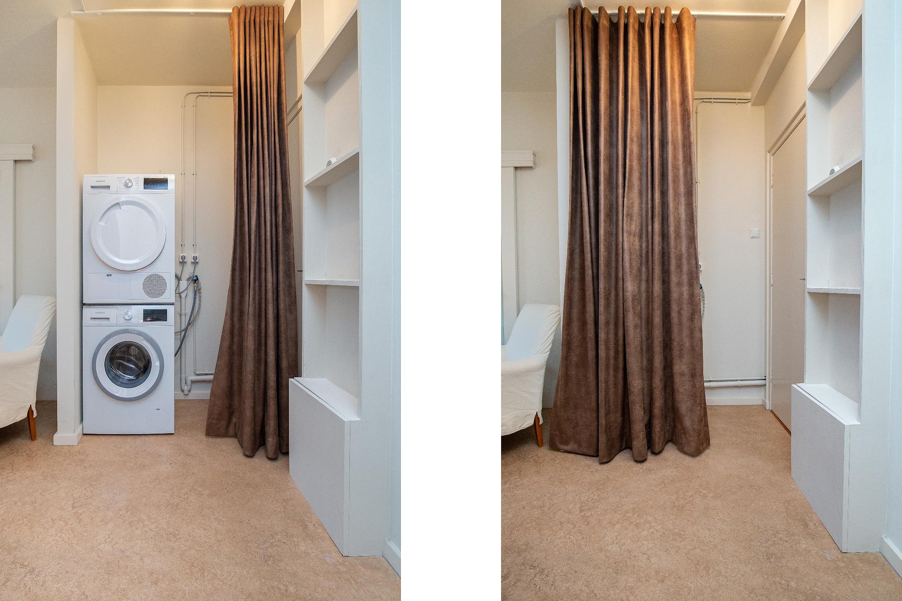 Het appartement zelf verwelkomt je met een ruime hal met garderobe, meterkast en aansluiting voor wasmachine en droger. Vanuit hier wandel je door naar de royale werkruimte, die overloopt in de lichte woonkamer.