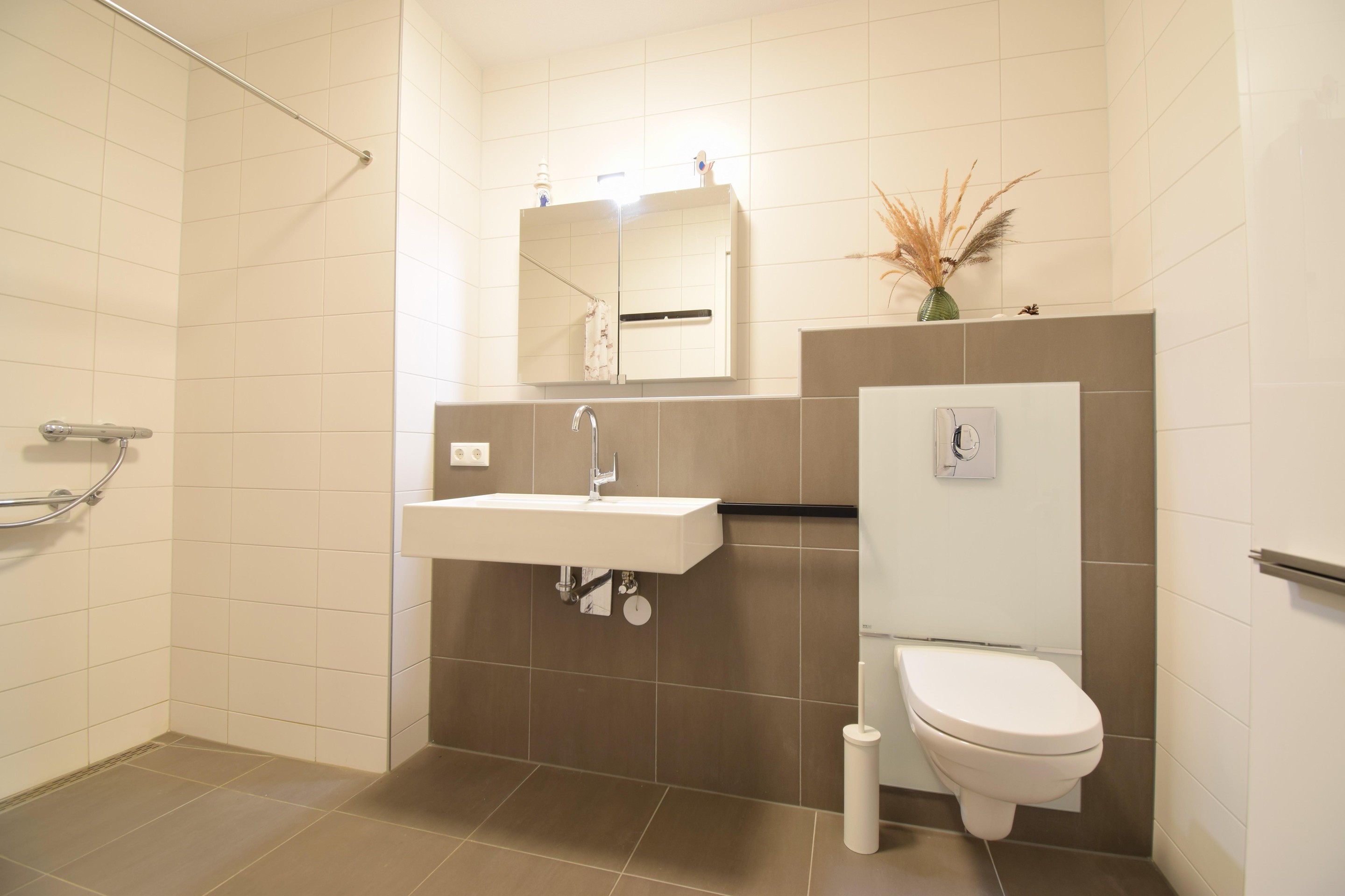 De neutraal afgewerkte badkamer is via de slaapkamer te bereiken. Een ruim opgezette badkamer waar je samen gebruik van kan maken. De badkamer is voorzien van: