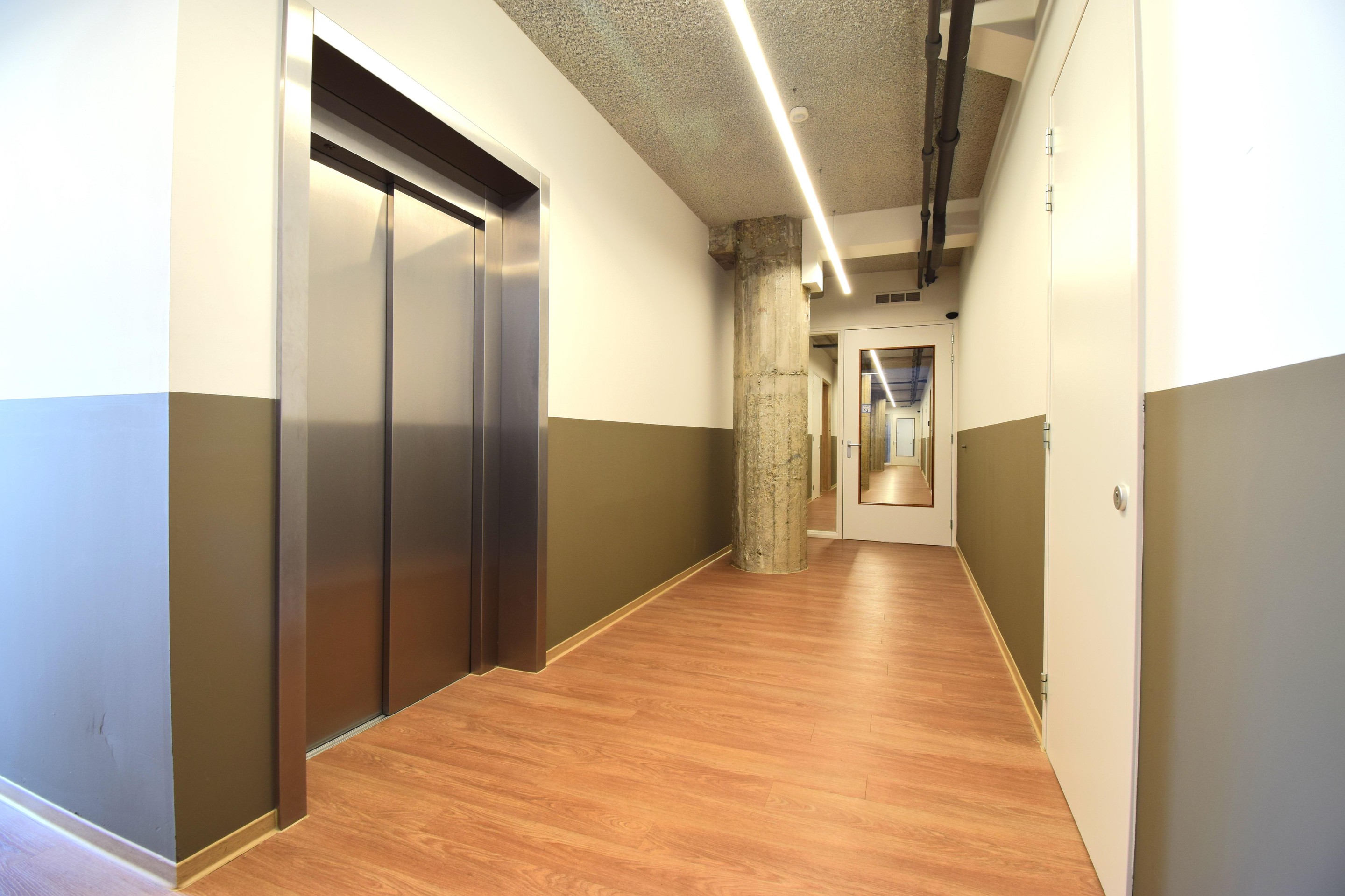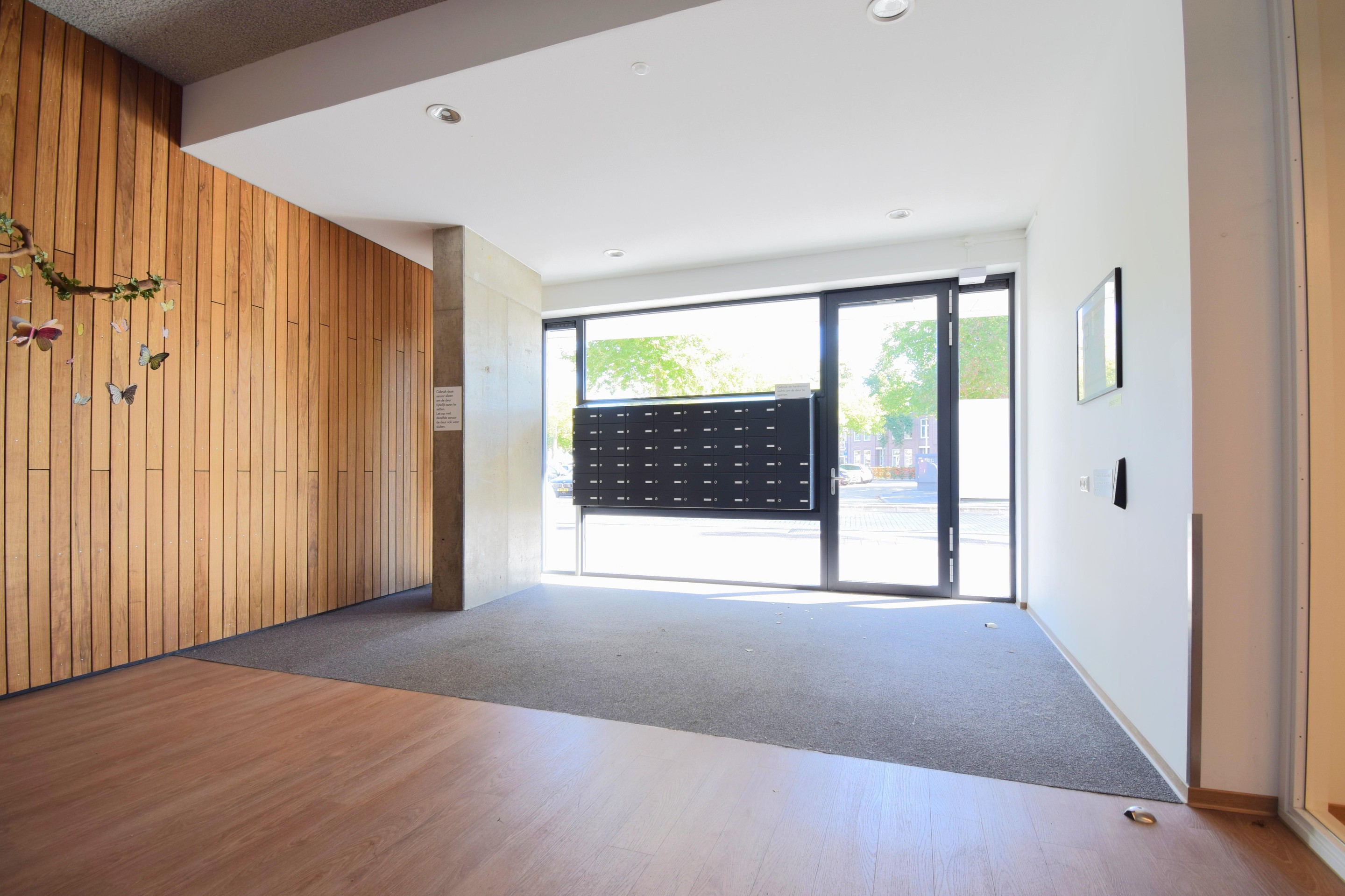 Via de brede voordeur kom je het appartement binnen. De hal geeft toegang tot de woonkamer, de meterkast, het toilet en de technische/wasruimte.