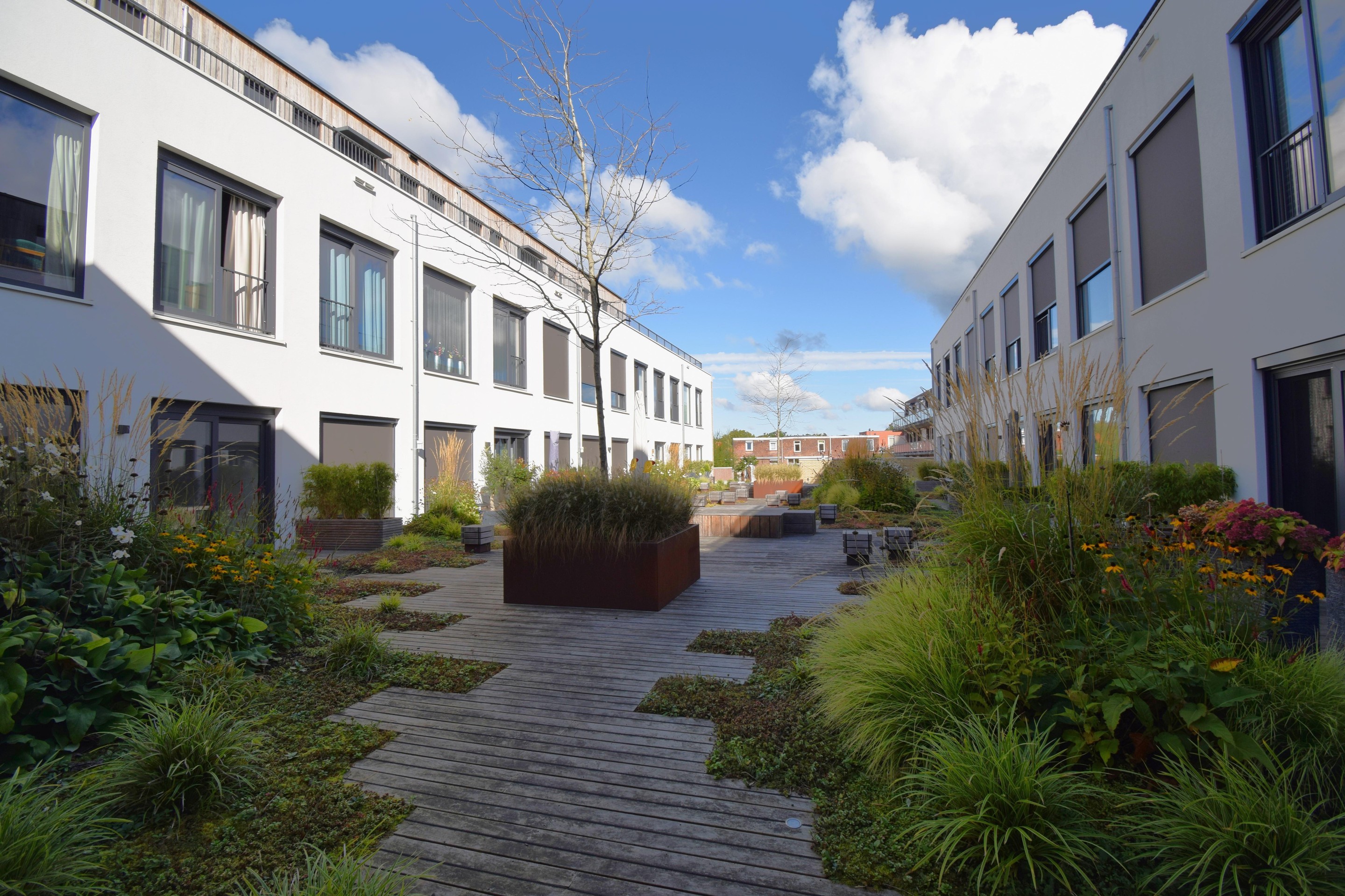 Er zijn leuke zitjes gemaakt en er is het nodige groen aangelegd.