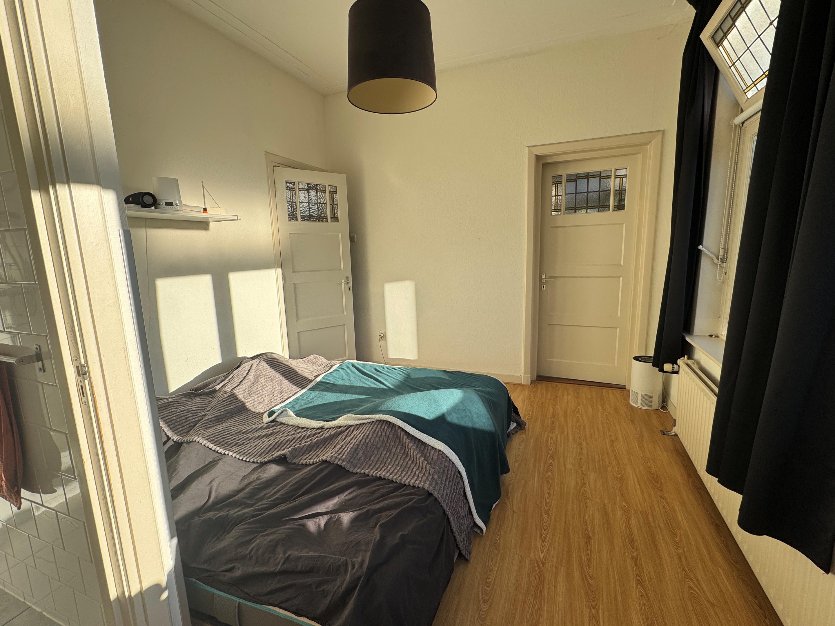 De lichte woonkamer-en-suite (ca. 4,29 x 4,20 m en ca. 4,20 x 5,00 m) is voorzien van een laminaatvloer, twee inbouwkasten, een karakteristiek rond raam en glas-in-lood details.