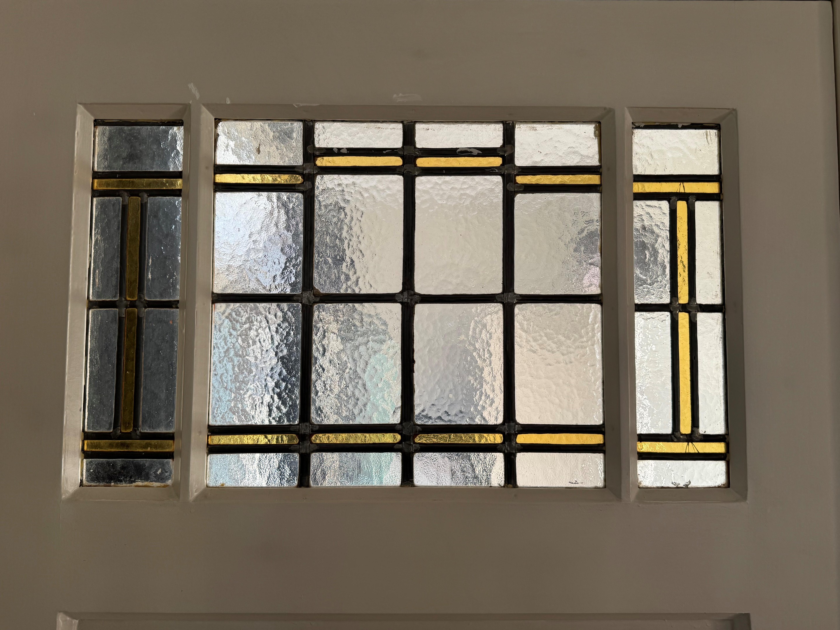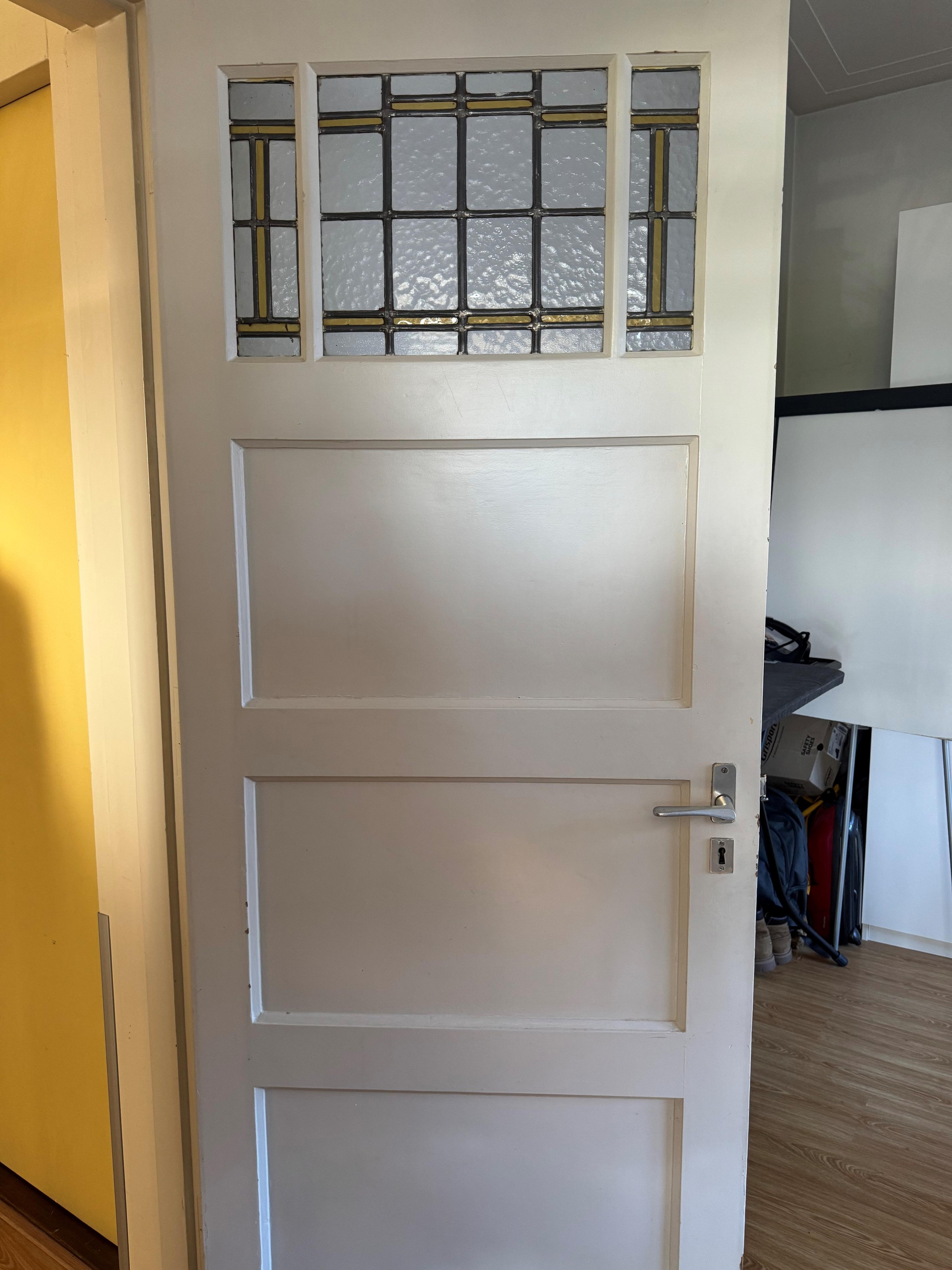 - Paneeldeuren en glas-in-lood ramen aanwezig;