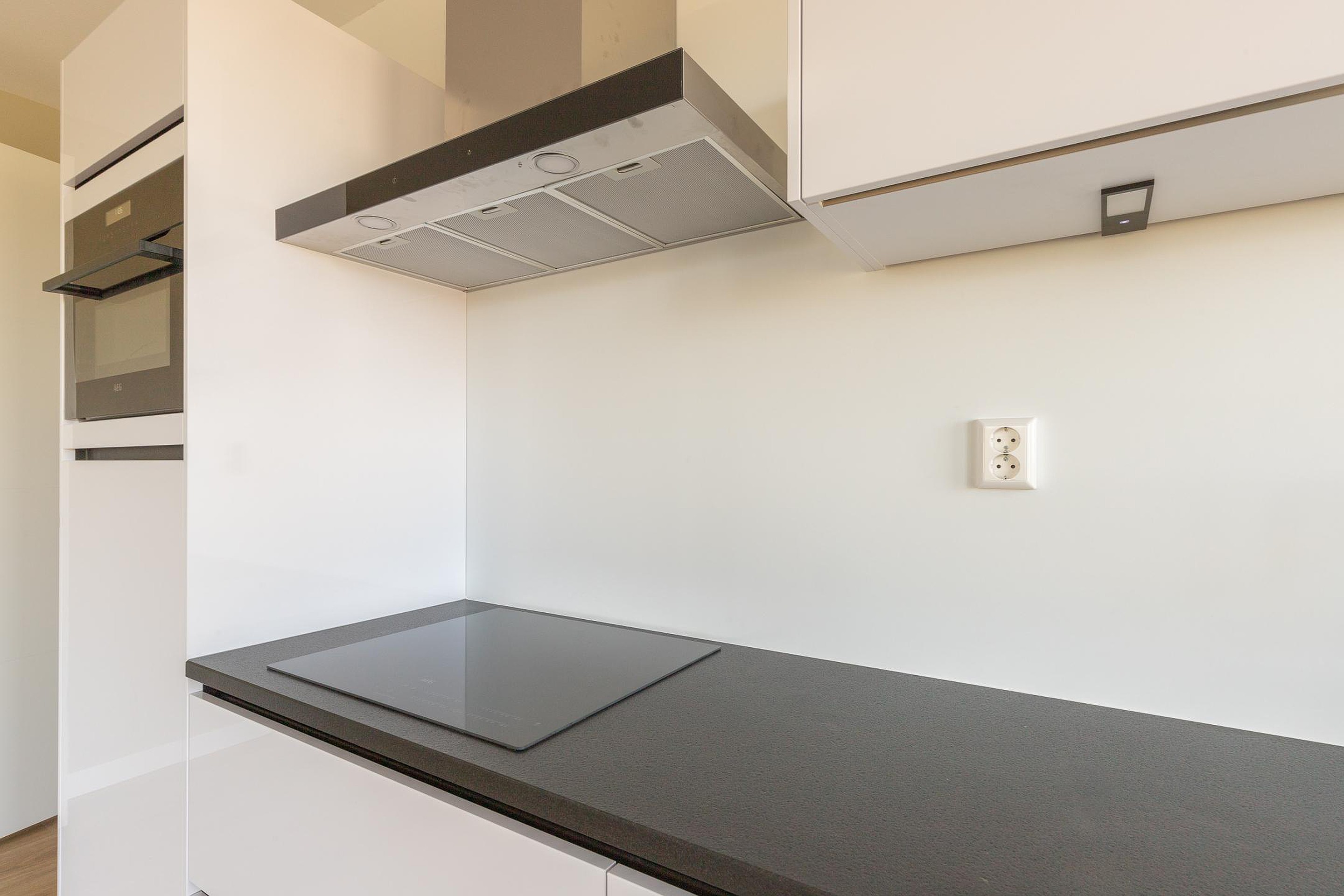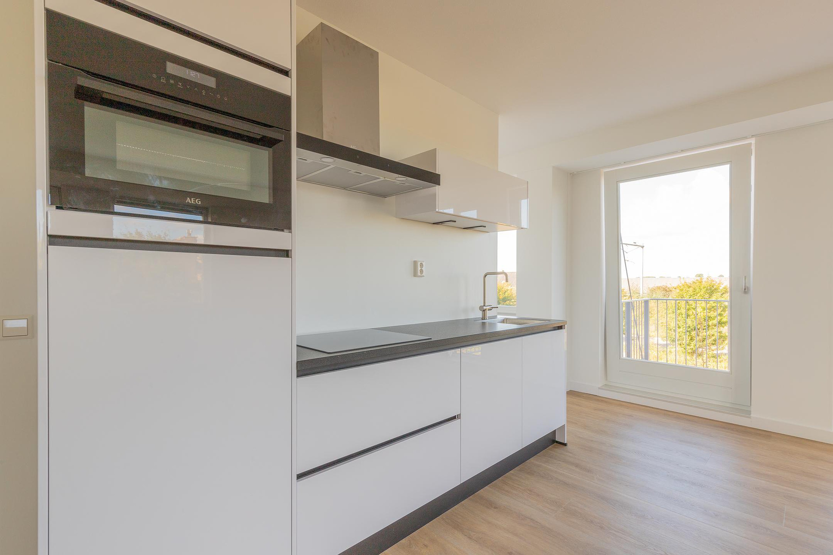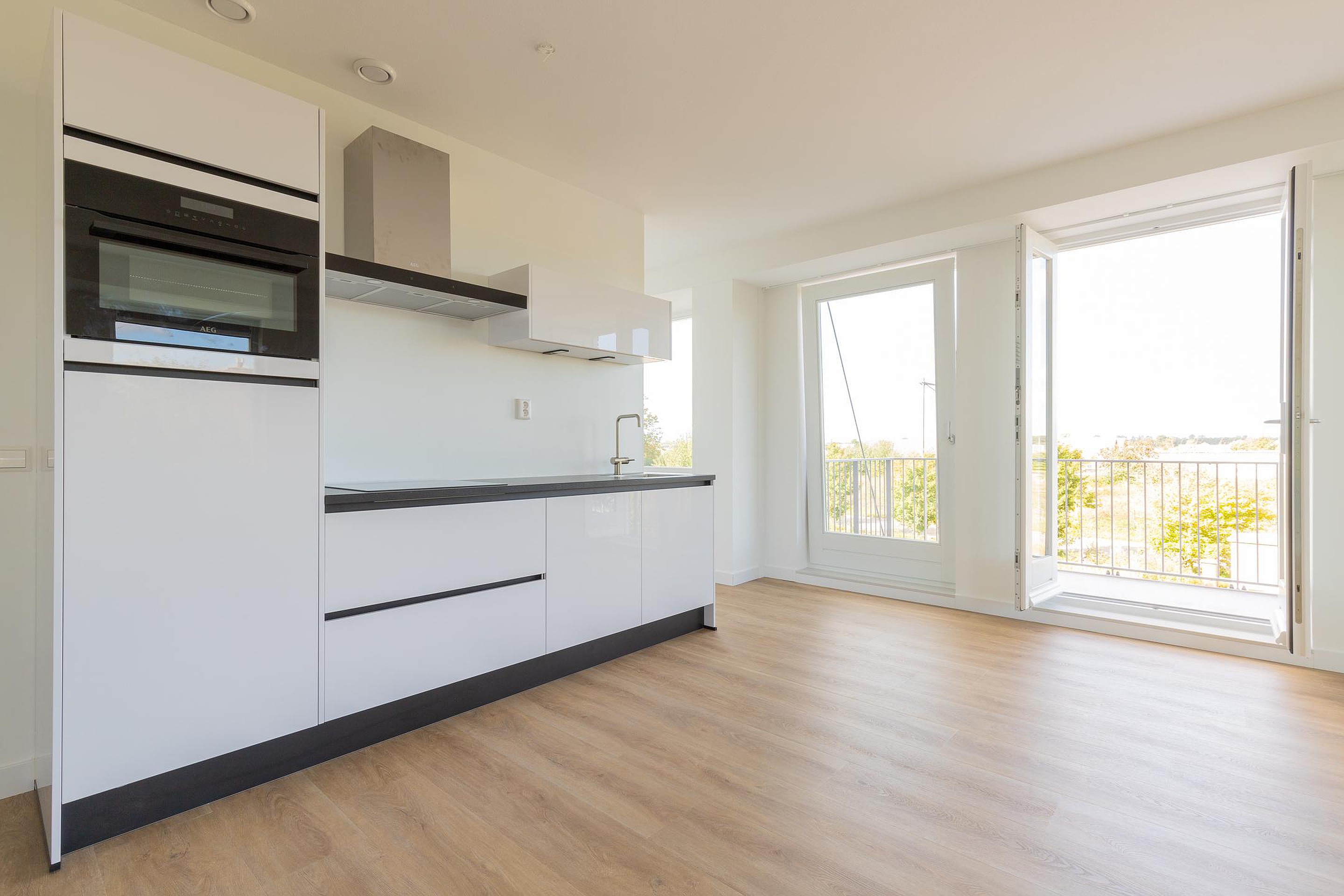 Op de eerste verdieping bevindt zich de voordeur van het appartement. Het appartement heeft een diepe ontvangsthal welke toegang biedt tot alle vertrekken binnen de woning. De vertrekken bestaan uit een slaapkamer van maar liefst 20m2, badkamer met inloopdouche, hangend toilet, wastafel en aansluiting voor de wasmachine en droger. De woonkamer met keuken is een zeer lichte en grote ruimte door de hoekligging binnen het complex. De keuken is voorzien van een 4-pits elektrische kookplaat, circulaire afzuigkap, combi-oven magnetron, koel-vriescombinatie en vaatwasser (allen van het merk AEG). Het balkon is te betreden via de woonkamer door middel van openslaande deuren.
